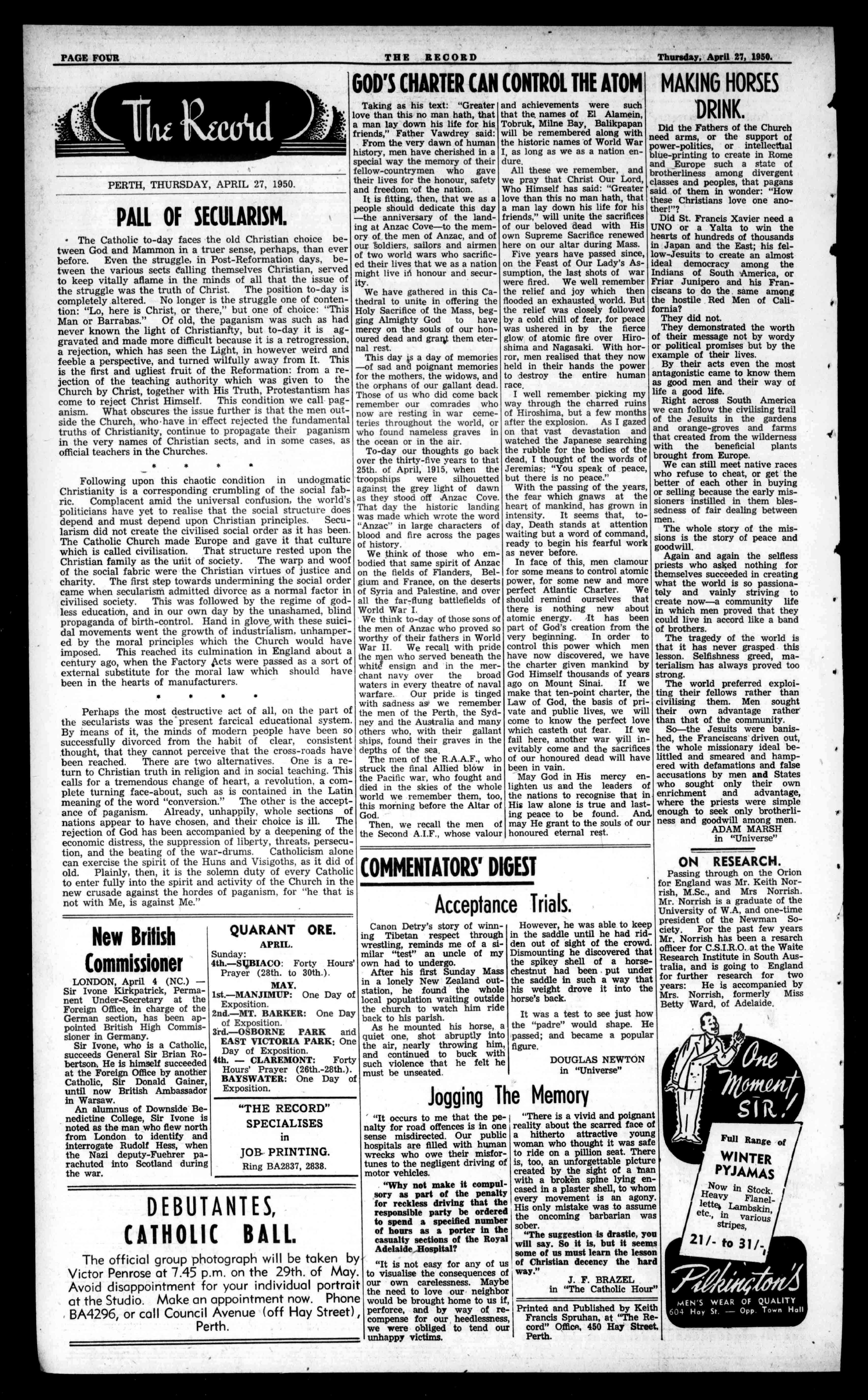 or ar dir IVO7 difRegisteredattheG.P.O., Perth,fortransmissionby postasanewspaper. NO.2,443. 'PHONEBA2837 (2Lines) 450HayStreet,Perth. BoxR1279,G.P.O.,Perth. OfficialorganoftheArchdioceseofPerth. Established1874. THURSDAY, APRIL27,.1950. Seventy-sixthYear. PriceThreepence.