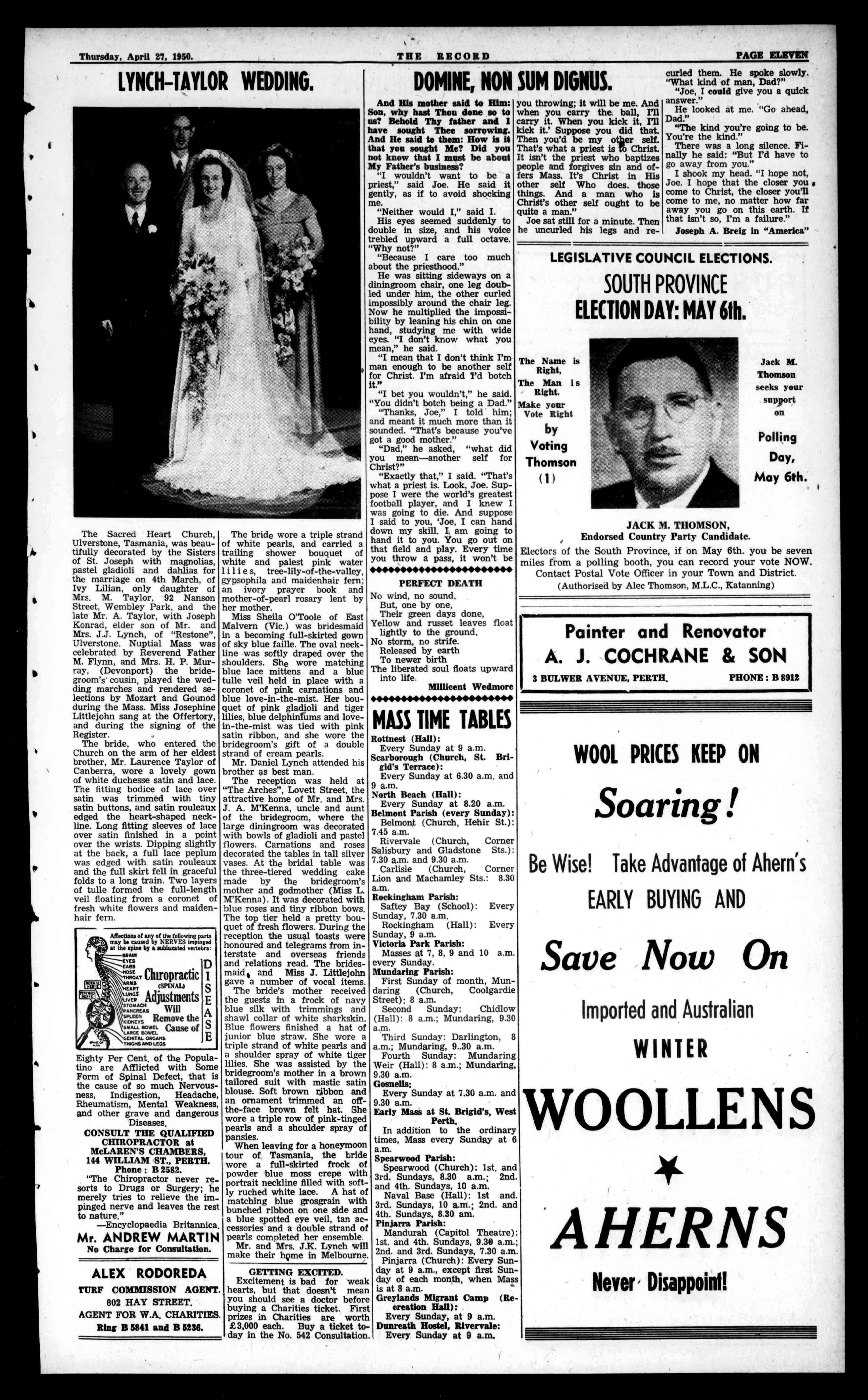 141 Photographs attheChurchandReception,, Engage SPECIALTYPHOTOS. MODERNEGIFTESHOPPE, 37BarrackStreet,Perth.BA3827. PhotographicRecordoftheWeddingandReceptionin ALBUMFormMadetoOrder. ELECTORSOFSUBURBANPROVINCE ConsistingofMt.Hawthorn,MidlandJunction,Guildford.Middle Swan,MountLawley,SouthPerth, andCanningDistricts, VOTE COURTHOPE (1 HeWillServeYouWell ELECTIONDAY: MAY6th.,1950. C.E.COURTHOPE. (AuthorisedbyW.Harcourt,BrandonStreet,SouthPerth)
