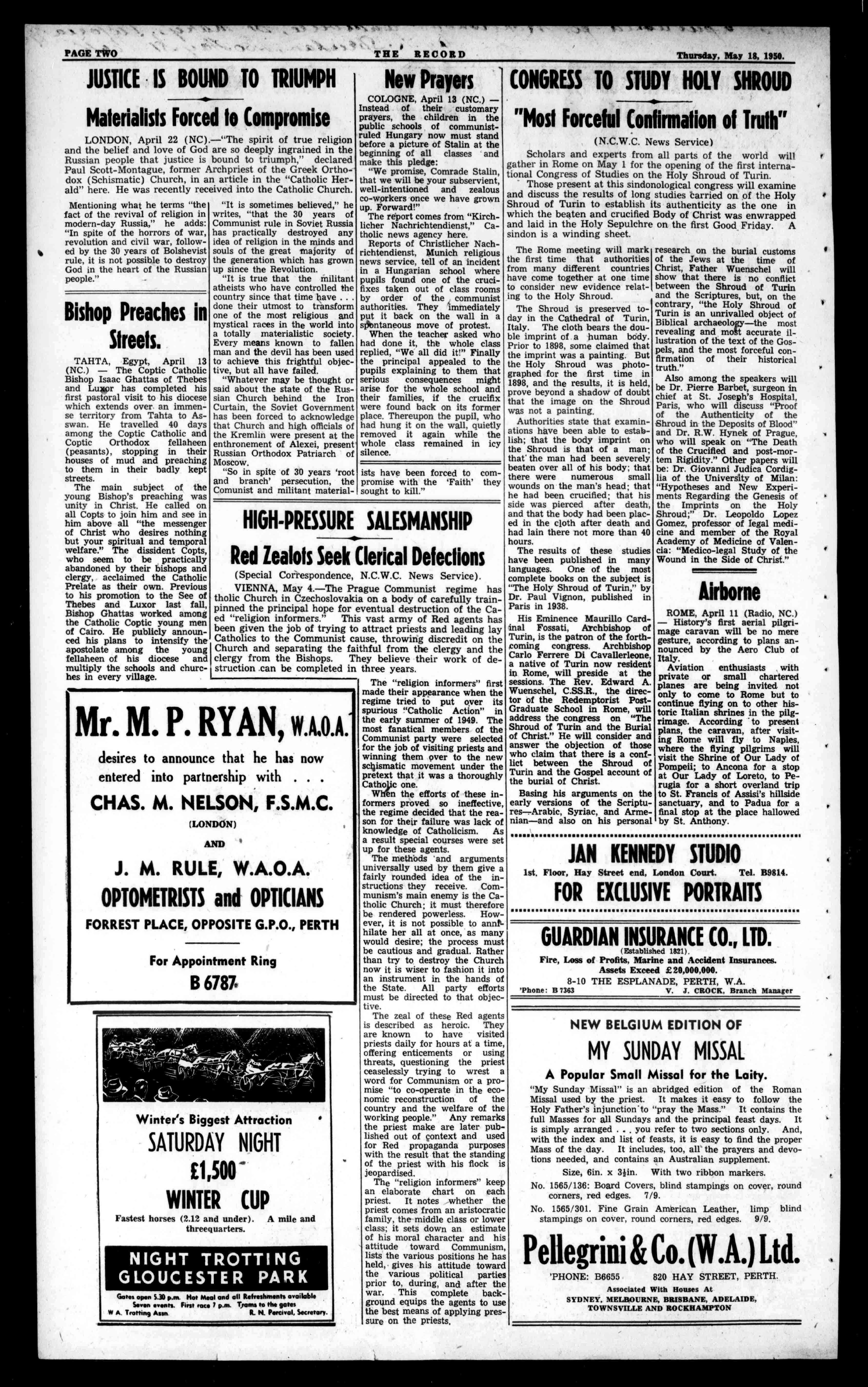 RegisteredattheG.P.O., Perth,fortranssnissiocby postasanewspaper. NO.2,446. PHONEBA2837 (2Lines) 450HayStreet,Perth. BoxR1279,G.P.O.,Perth. Jr. sat, 00431, 411 CCOT OfficialorganoftheArchdioceseofPerth. Established1874. THURSDAY, MAY18,1950 Seventy-sixthYear. PriceThreepence.