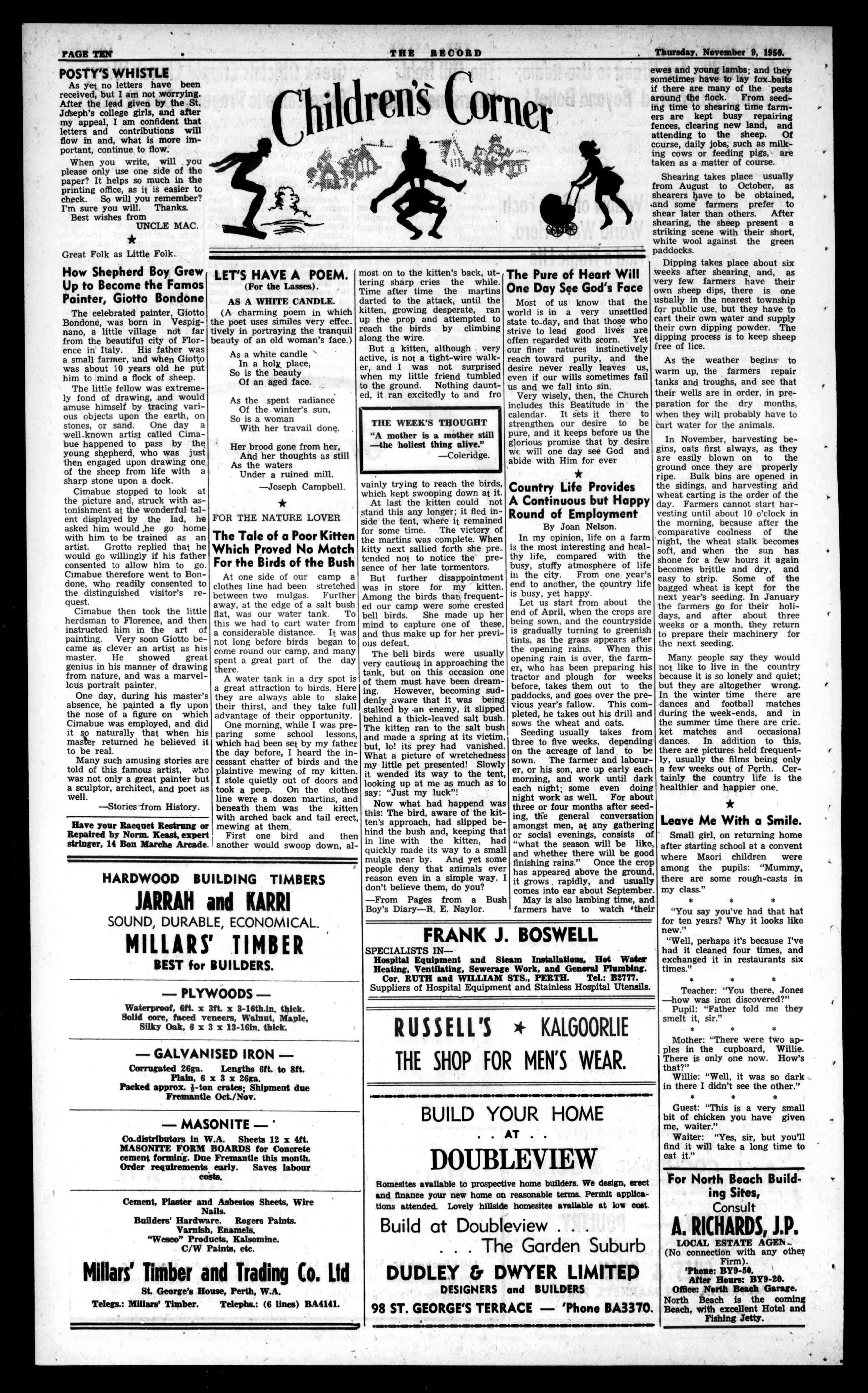 LLOYD TRIESTINO FORNAPLESANDGENOA Steamer. LeaveFremantle SCaboto U.Vivaldi Toscana S.Caboto 16thNovember 12thDecember 22ndJan.1951 12thFeb.1051 FARES CabinClassfron,Ell()Stg.to C192StgThirdClass(incabins)from263 Stg.to£73Stg.rhrougnbookingsarrangedt, Londonbyrailatreducedrates. ITALYTOFREMANTLE ReturnReservationsfromGeno,canhaarrangedby: Steamer. Toscana S.Caboto UVivaldi Toscana FromItaly 24thNovember 20thDecember 17thJan1951 3rdMarch1951 Wanteddomestichelp,8.30to Forfurtherparticularsapply1, 2oclockdaily,byelderlycou- \gents: 3EORGEWILLS&CO.LIMITEDple;Cottesloearea.Apply 133St.George's-terrace,Perth Box1479,orringB8774. PhoneBA2085 wheretheEnglishmenenjoyedSUPPORTOURADVERTISERS FORSALE