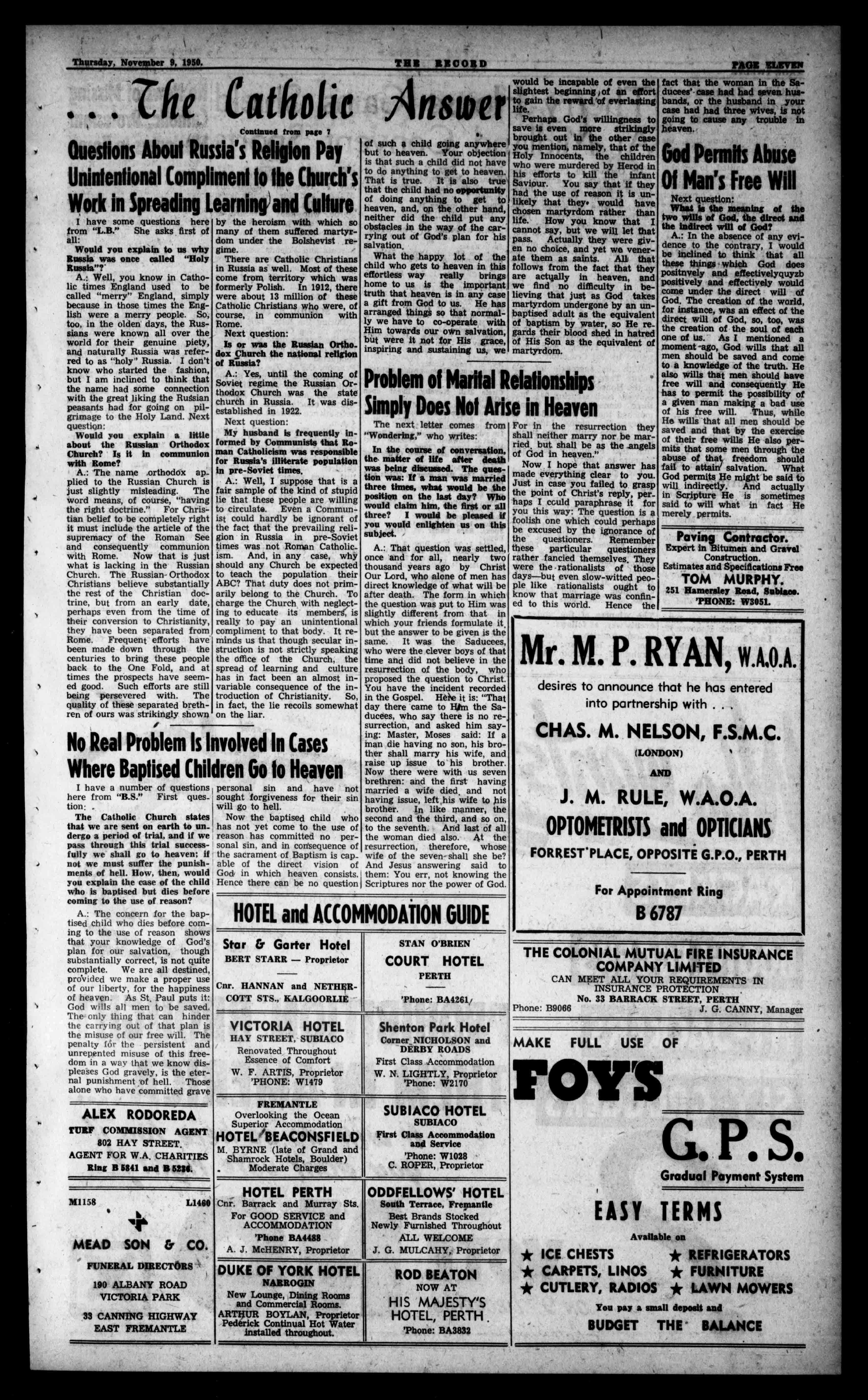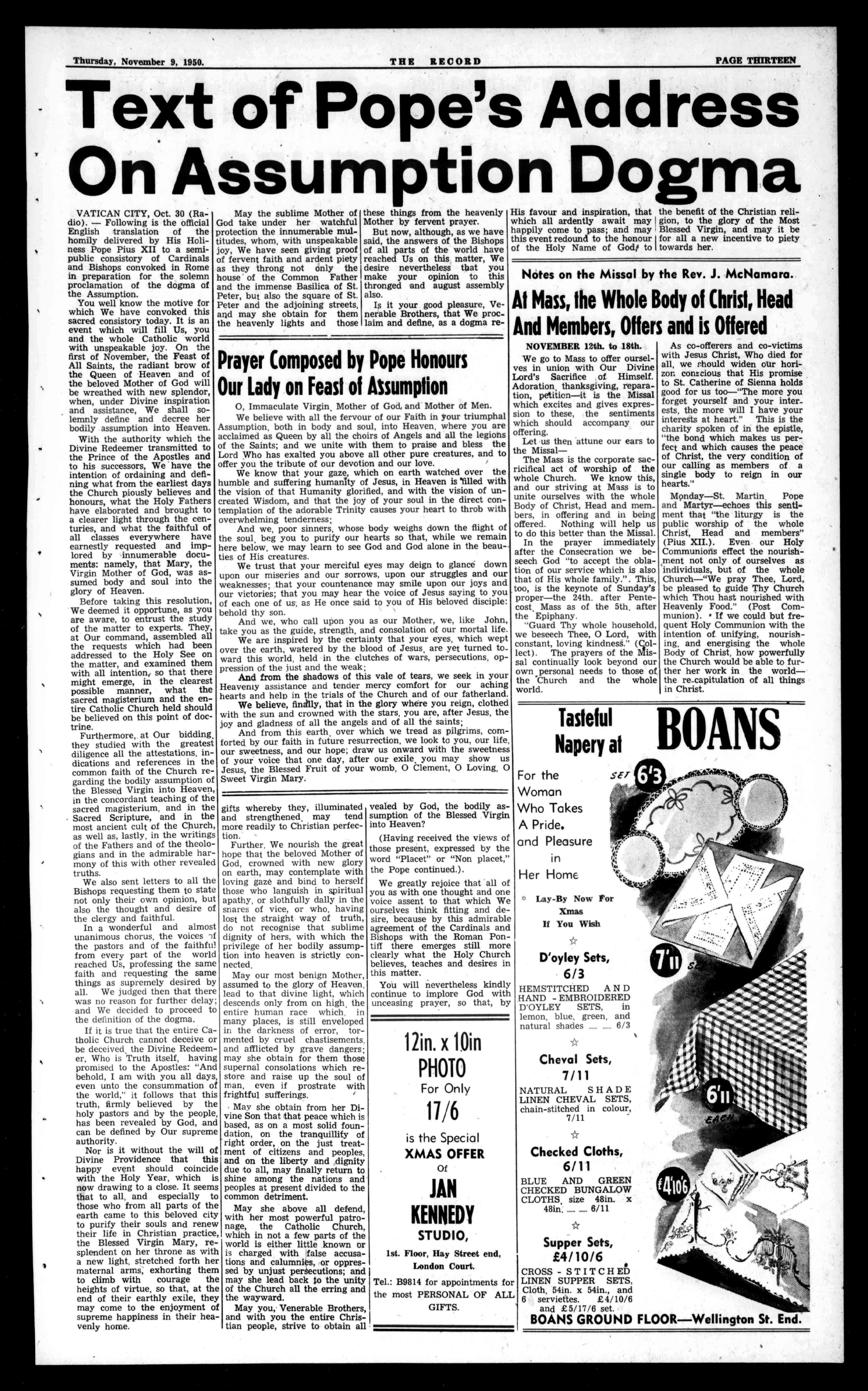 / RegisteredattheG.P.O., Perth,fortransmissionby p9stasanewspaper. NO.2,471. PHONEBA2837 (2Lines') 450HayStreet,Perth. BoxR1279,G.P.O.,Perth. fer'' /. 4ff( J2 OfficialorganoftheArehdineeseofPerth. Established1874. THURSDAY, NOVEMBER9,1950 Seventy-SeventhYear PriceFourpenee.