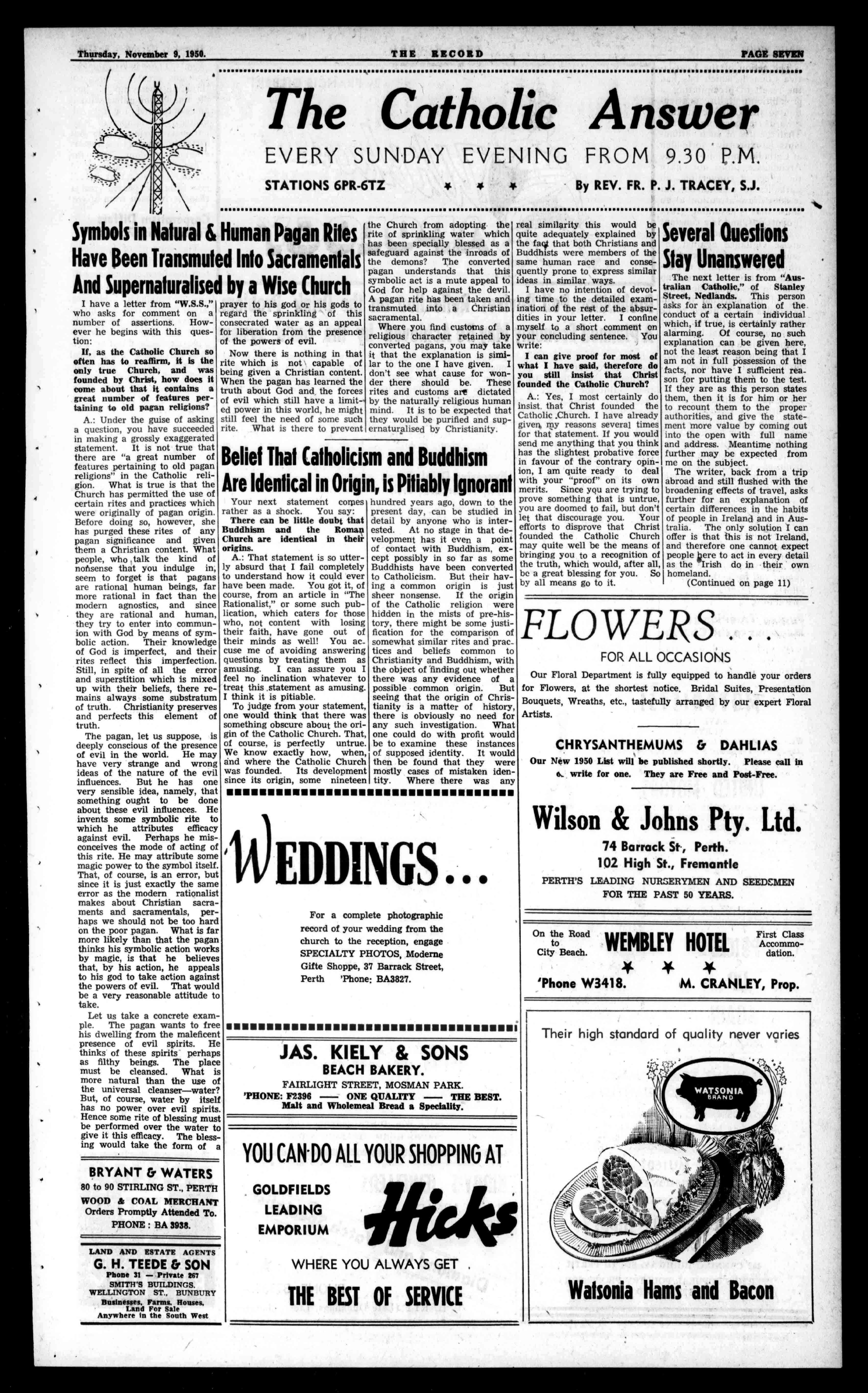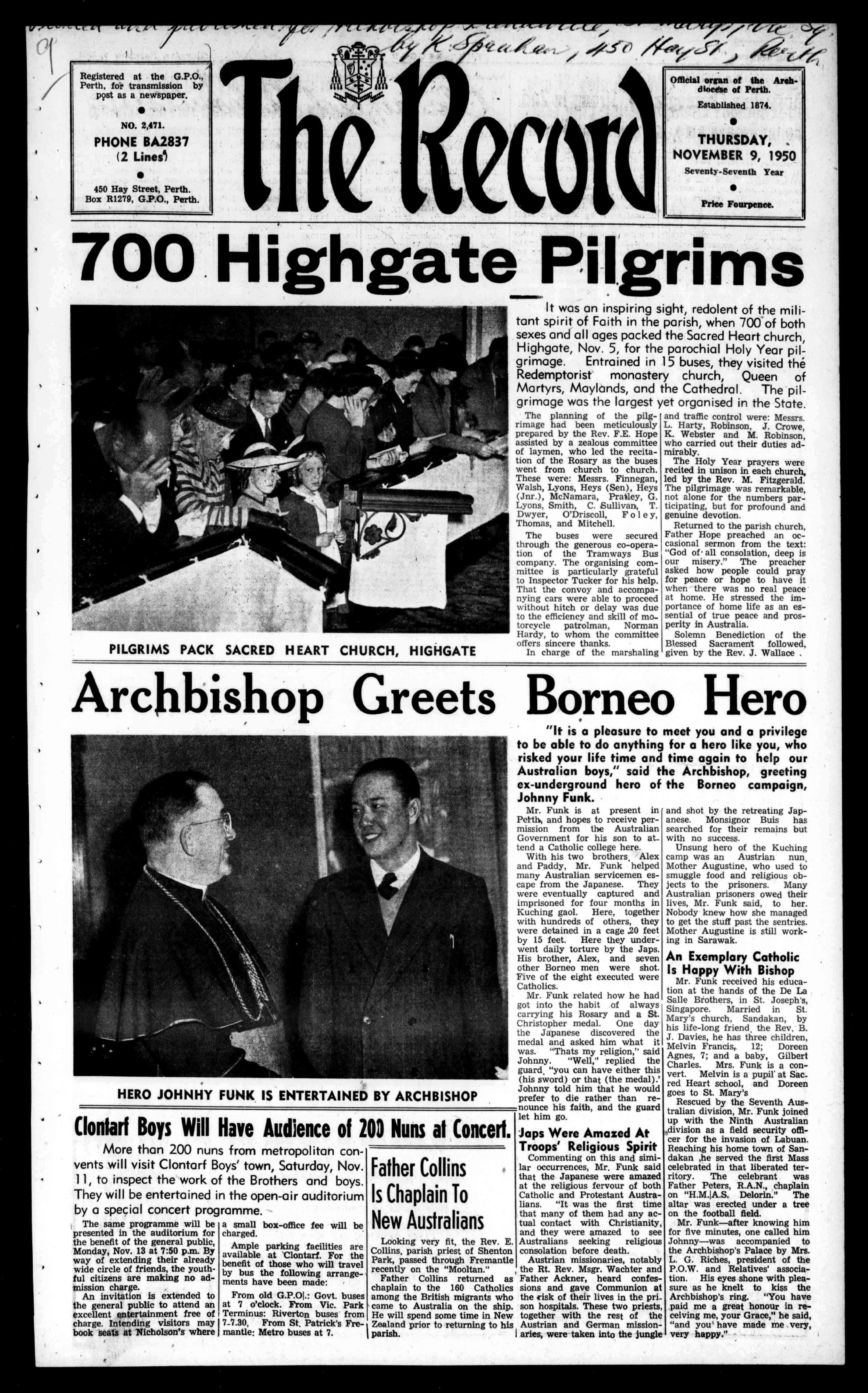 JOHNNYFUNKISENTERTAINEDBYARCHBISHOP ClontarfBoysWillHaveAudienceof203NunsatConcert. Morethan200nunsfrommetropolitanconventswillvisitClontarfBoys'town,Saturday,Nov. 11,toinspecttheworkoftheBrothersandboys. Theywillbeentertainedintheopen-airauditorium byaspecialconcertprogramme. Thesameprogrammewillbe presentedintheauditoriumfor thebenefitofthegeneralpublic, Monday,Nov.13at7:50p.m.By wayofextendingtheiralready widecircleoffriends,theyouthfulcitizensaremakingnoadmissioncharge. Aninvitationisextendedto thegeneralpublictoattendan excellententertainmentfreeof charge.Intendingvisitorsmay bookseatsatNicholson'swhere asmallbox-officefeewillbe charged. Ampleparkingfacilitiesare availableatClontarf.Forthe benefitofthosewhowilltravel bybusthefollowingarrange-mentshavebeenmade: FromoldG.P.01.:Govt.buses at7o'clock.FromVic.Park Terminus:Rivertonbusesfrom 7_7.30,FromSt.Patrick'sFremantle:Metrobusesat7. FatherCollins IsChaplainTo NewAustralians