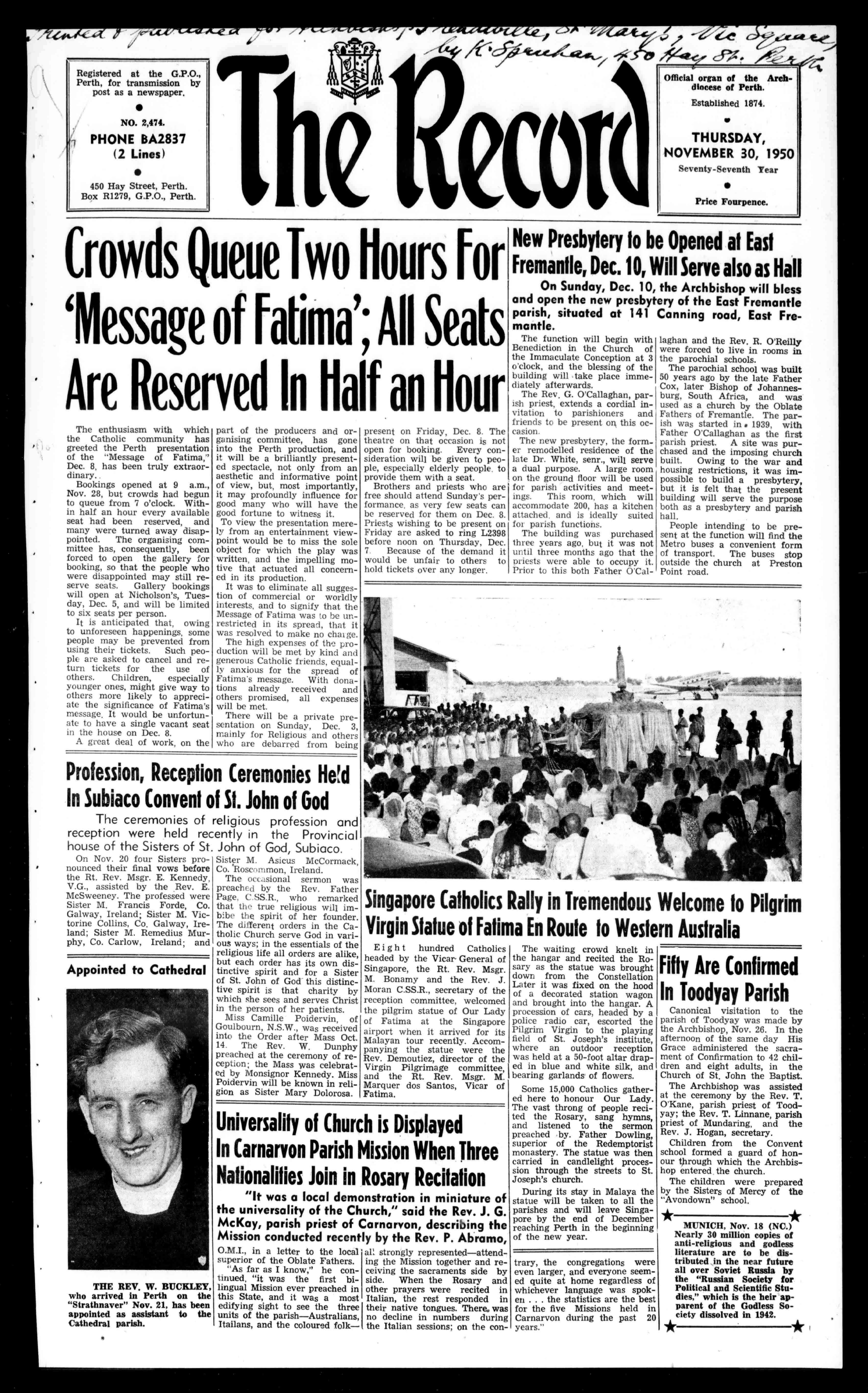 Theparochialschoolwasbuilt 50yearsagobythelateFather Cox,laterBishopofJohannesburg,SouthAfrica,andwas usedasachurchbytheOblate FathersofFremantle.Thepar- ishwasstartedin1939,with FatherO'Callaghanasthefirst parishpriest.Asitewaspur- chasedandtheimposingchurch built.Owingtothewarand housingrestrictions,itwasimpossibletobuildapresbytery, butitisfeltthatthepresent buildingwillservethepurpose bothasapresbyteryandparish hall. Peopleintendingtobepresentatthefunctionwillfindthe Metrobusesaconvenientform oftransport.Thebusesstop outsidethechurchatPreston Pointroad.