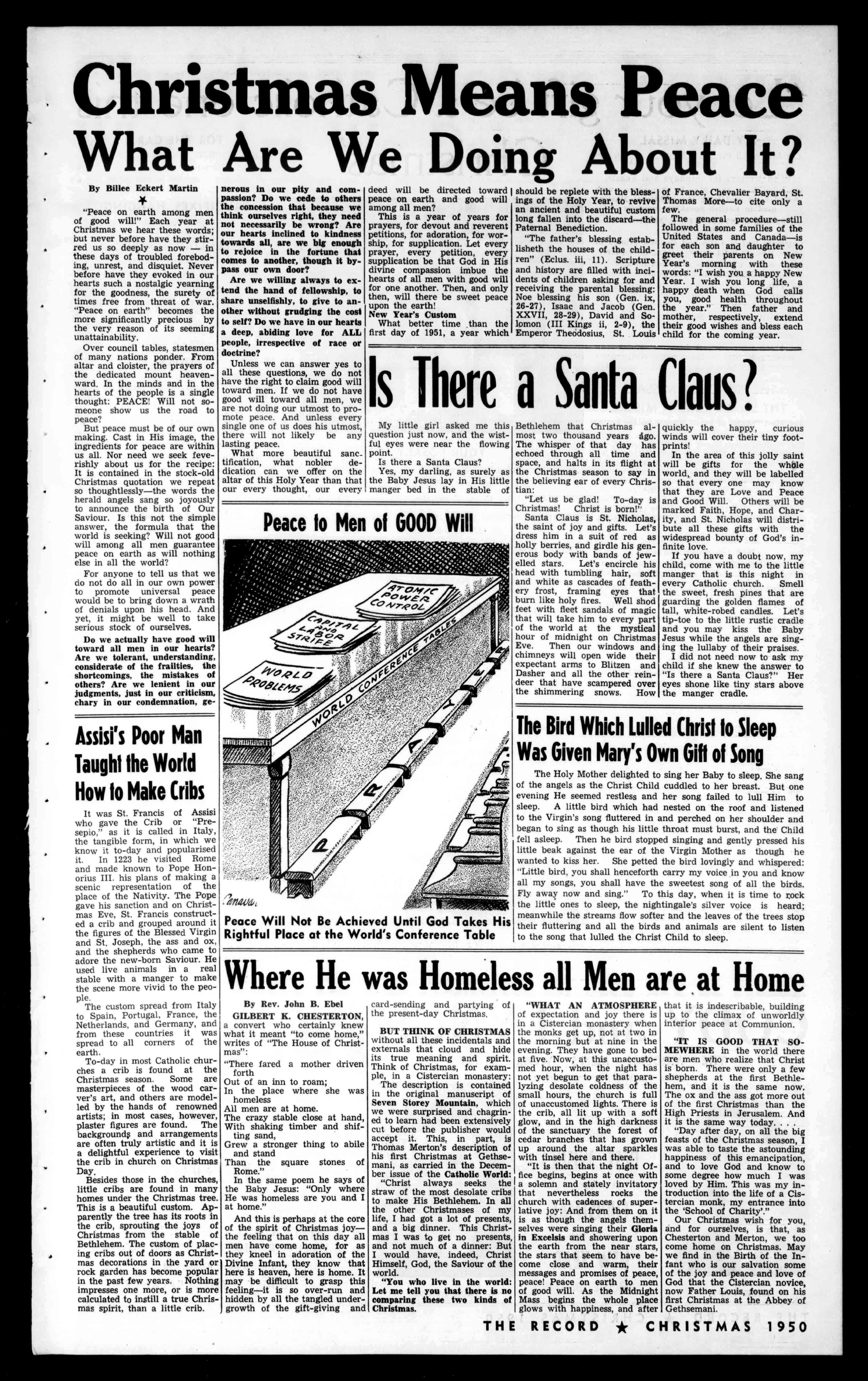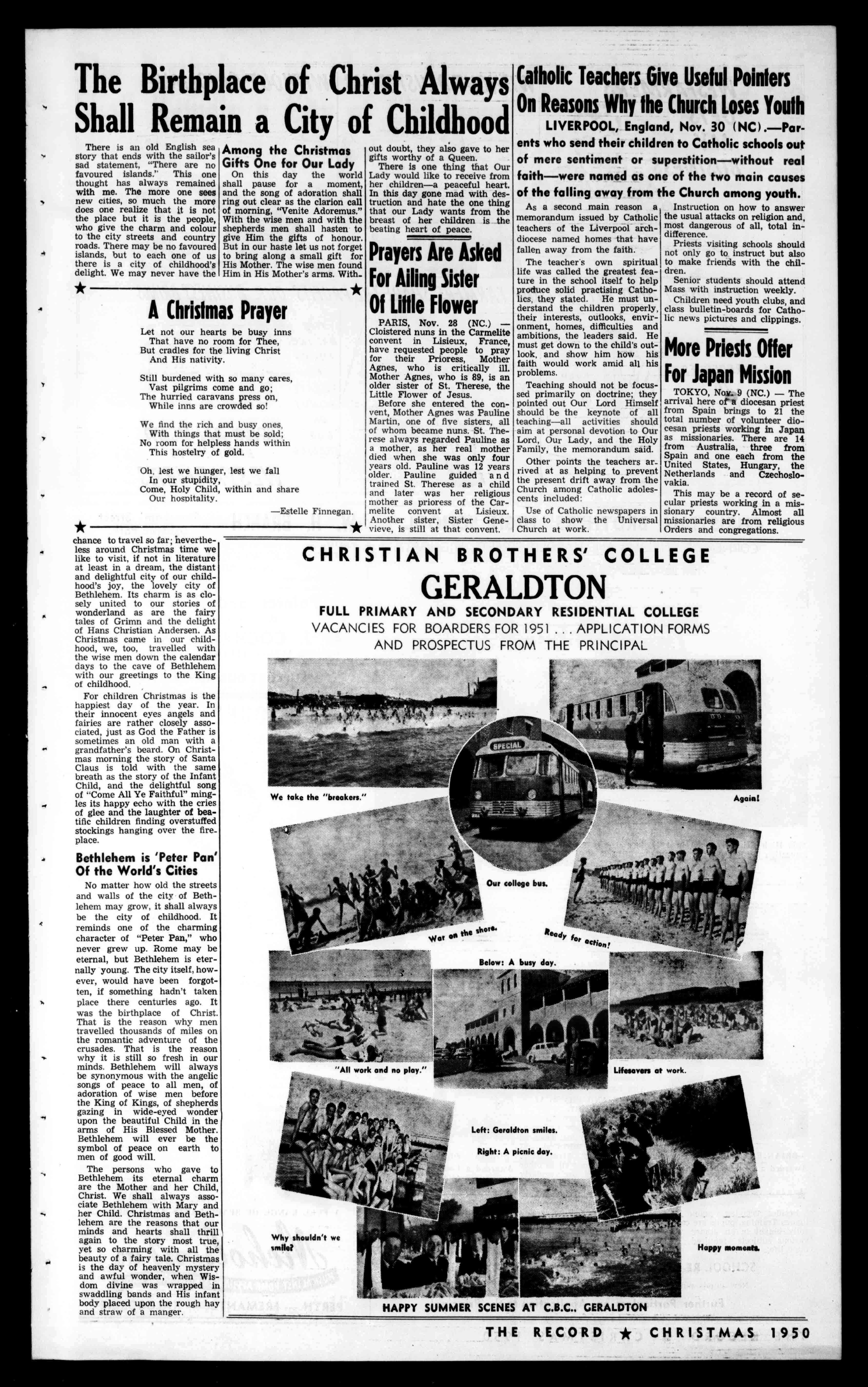 "ForaChildisborntous,andasonisgiventousandthegovernmentis uponhisshoulders;andHisnameshallbecalledWonderful,Counsellor, GodtheMighty,theFatheroftheworldtocome,thePrinceofPeace.His empireshallbemultipliedandthereshallbenoendofpeace (IsaiasIX: 6-71.ThisprophecyofIsaias,hundredsofyearsbeforethebirthofthe PromisedOne,founditsfulfillmentthefirstChristmaseve."GlorytoGod inthehighestandonearthpeacetomenofgoodwill. Forthisdayis borntoyouaSaviourwhoisChristtheLord,inthecityofDavid"(Luke 14,11 Christmas,1950,peacetomenofgoodwill.Peace?Ifeverpeacedid notprevailitisthisChristmastime,1950.Noteventhebirthplaceofthe PrinceofPeace,Palestine,issporedtheabsenceofpeace.Despitethe oft-repeatedwarningsoftheHolyFather,peacewillnotcometotheHoly LanduntilthewarringnationsabidebythePapalplanfortheinternationalizationofJerusalem. I hopethatallCatholicsofthisArchdiocesewill joinmeinprayeratMidnightMassthatpeacemightoncemorecomeupon thosehillswhichfirstheardtheangels'"Gloria."