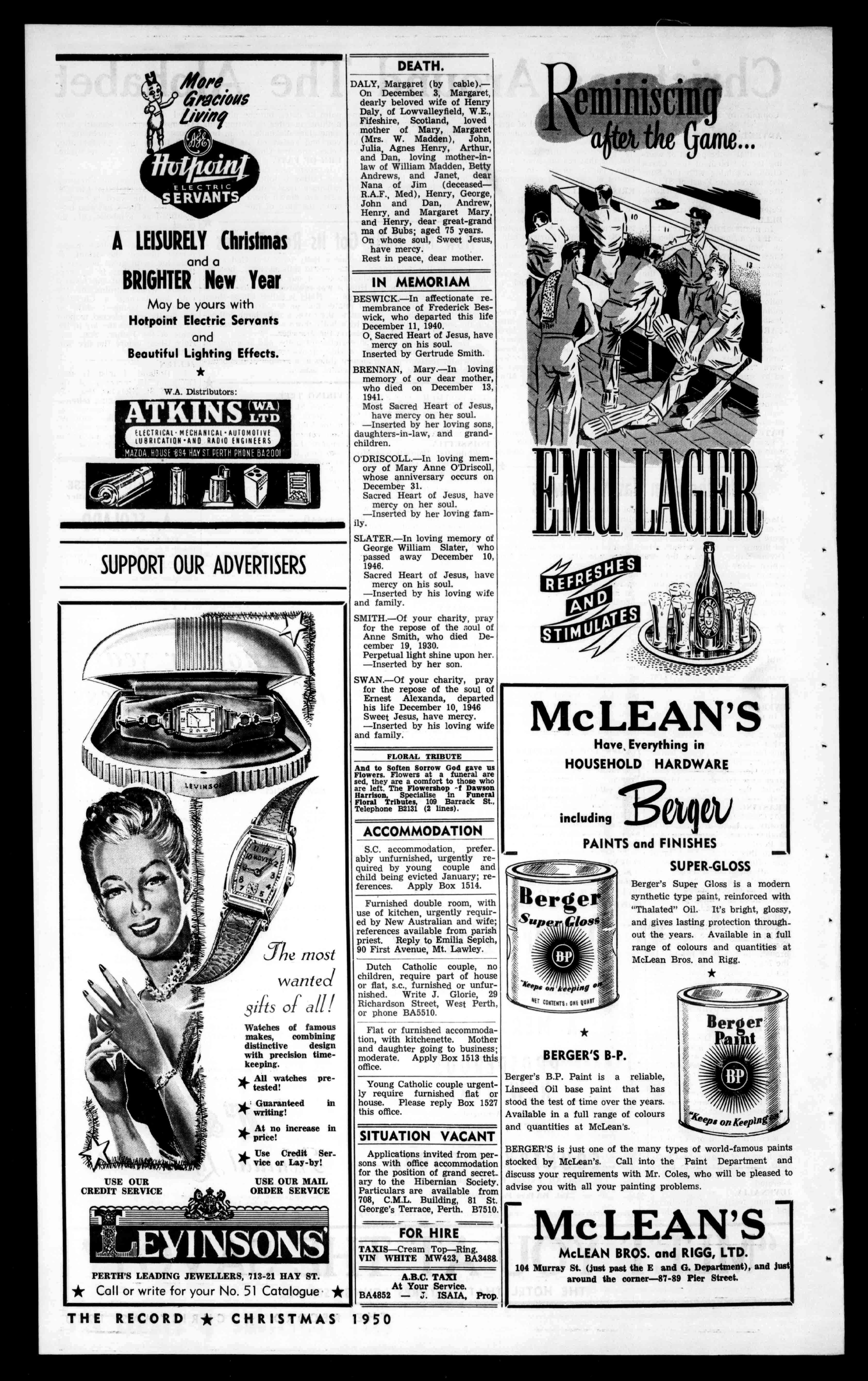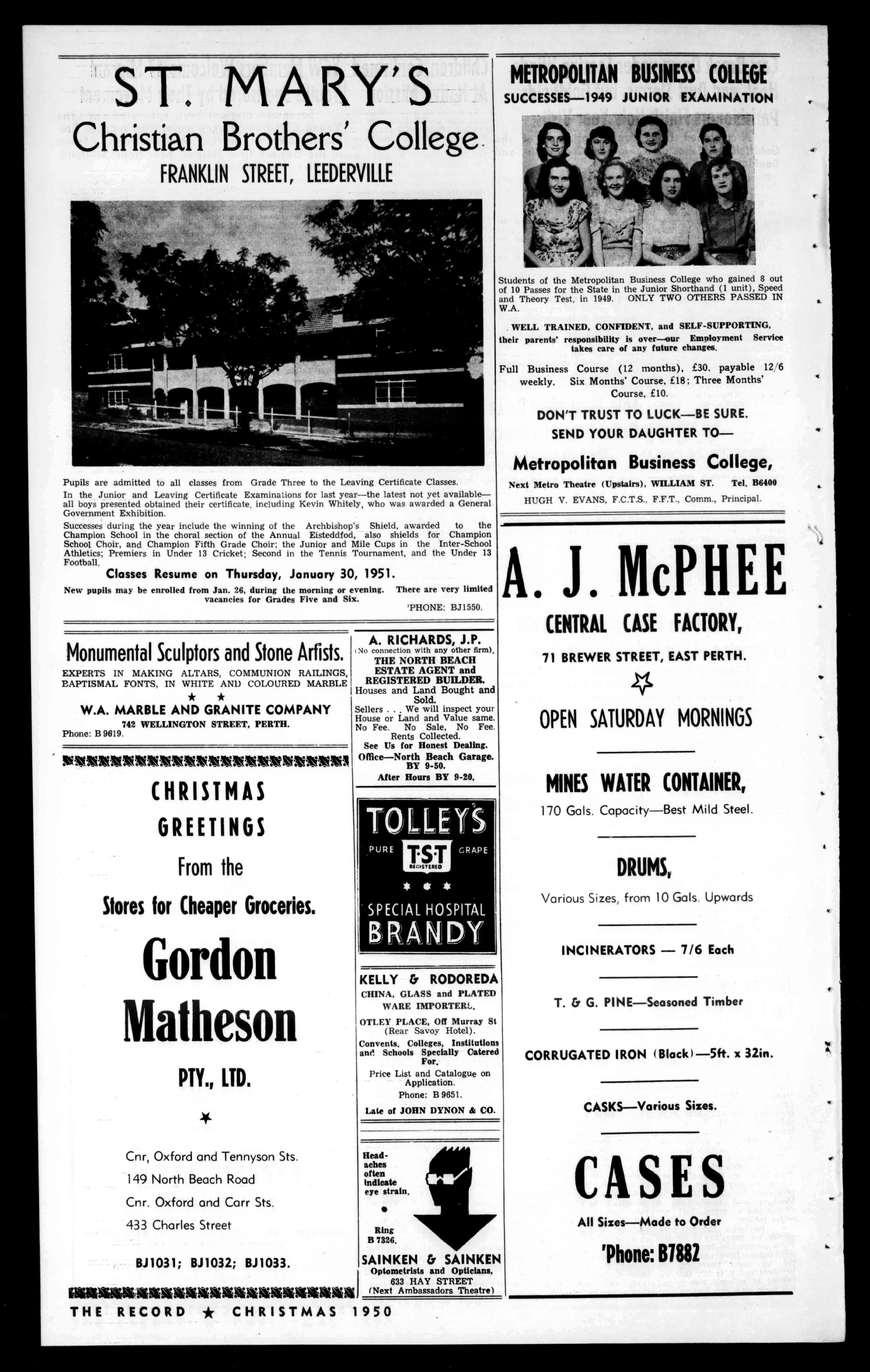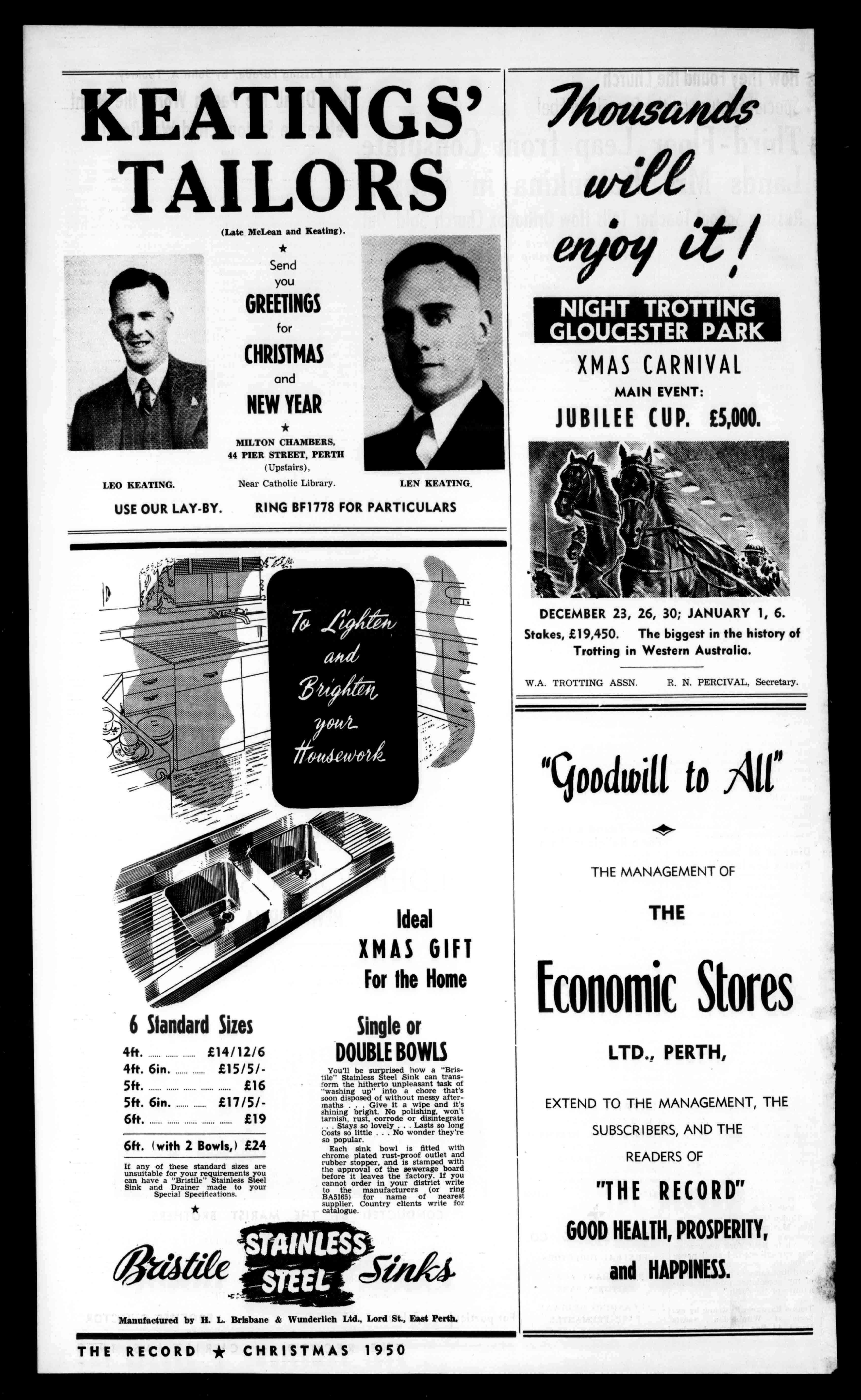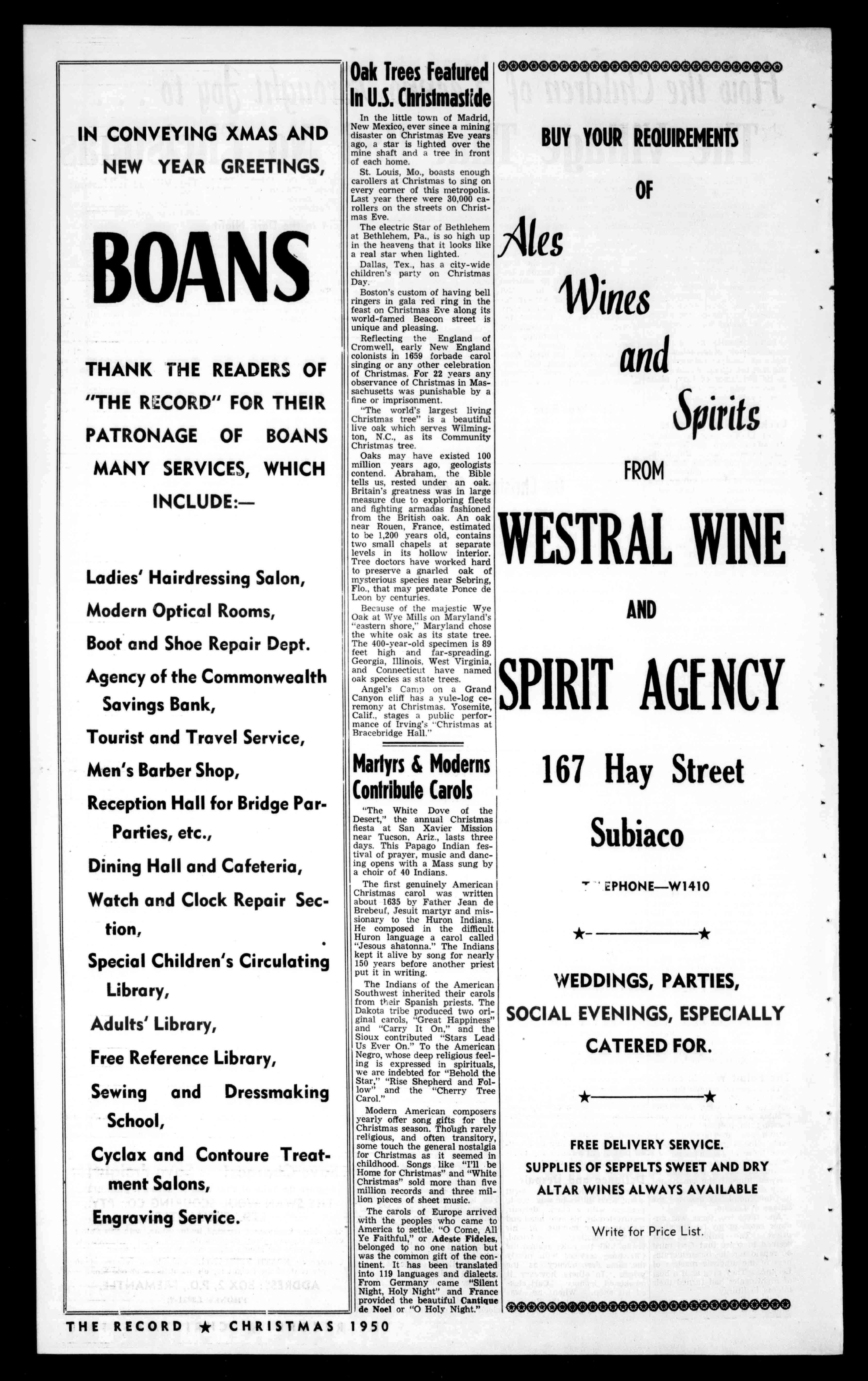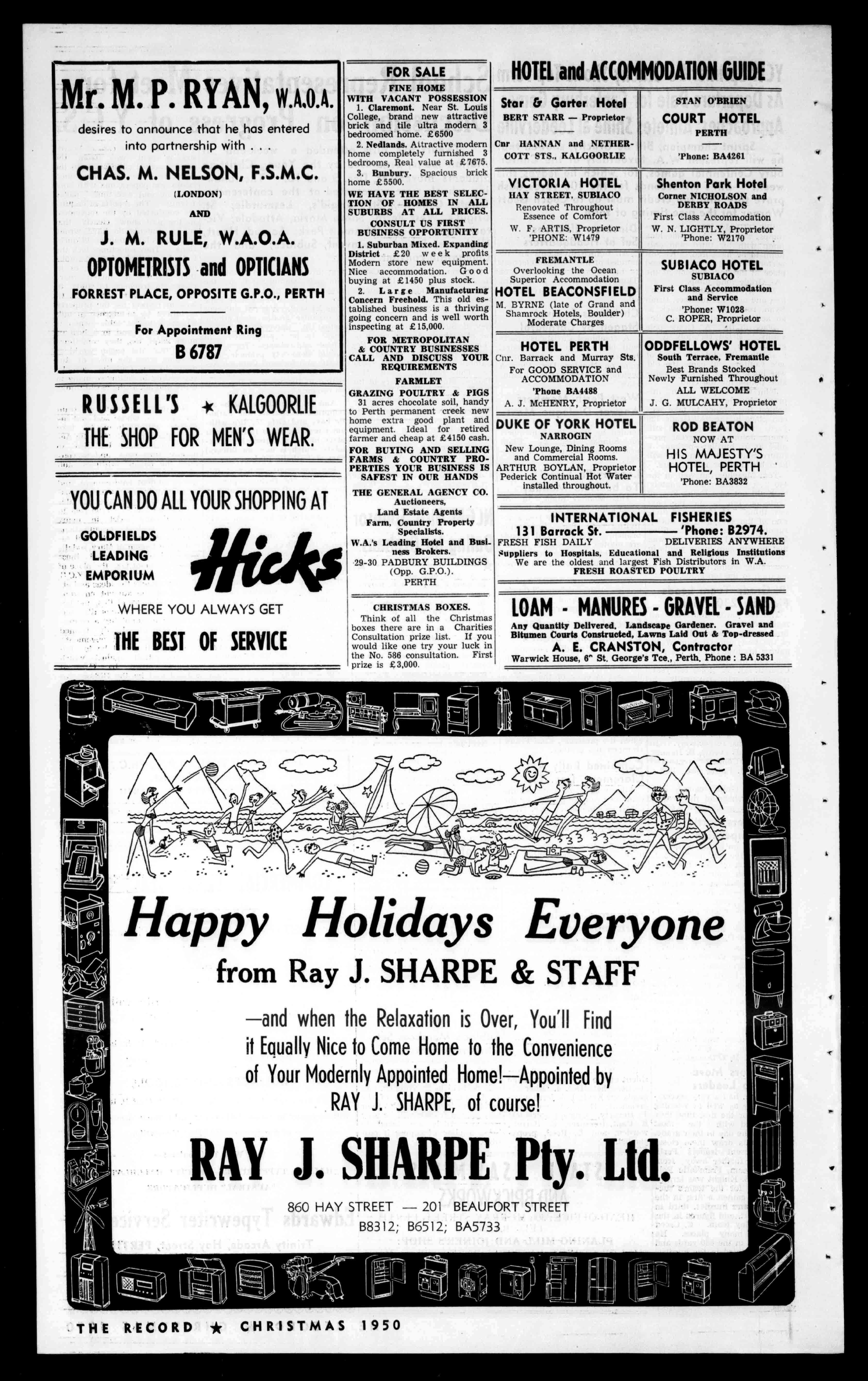 TOTHEREADERSOF "THERECORD" THROUGHOUTTHESTATE EZYWALK1N PTY.LTD. OFFER THANKSAND APPRECIATION FORTHEIRPATRONAGEDURINGTHEYEAR ANDINRETURNEXTENDTHEIRBESTWISHES Paiwer4CELEBRATE cnYEARSTRADING wilharemodeledRote Comeinandsee THEFINEST SeedandPlantDisplay INAUSTRALIA 50yearsagowithmuchexperience,keenenthusiasmandagiftfor hardwork,GeorgeDawson,sen.,the founderofDawsonHarrisonPty. Ltd.,decidedtobuildonquality,a seedandplantbusinessthatwould earnwidespreadrecognitionandapprovalthroughouttheState. To_daythatidealhasbeenachieved,andthenameofDawsonsisnow universallyacceptedasasignof qualityinseeds,plants,shrubs,and trees everywhere. Asafittingcelebrationofthat50 yearsofachievementtheDawson RetailCentre,at109BarrackStreet, Perth,hasbeencompletelyremodelledonmodernlines,andyouare cordiallyinvitedtoview,without obligationtobuy,thehundredsof lovelyplantsdisplayedunderspeciallighting....Hereyouwillseeadisplaythathasnoequalanywherein Australia.Comein!Youwillbe verywelcome. DAWSONHARRISONPTY.LTD.109BARRIO;STPERTHoi;eitifit;terfr 6,4011/01-0E9RD GREETINGS BESTWIShES FROM E.C.STOTT&CO.,PTY.LTD. REMINGTONTYPEWRITERS, GESTETNER DUPLICATORS, ANDALLOFFICEEQUIPMENT. AND STOTT'SBUSINESSCOLLEGESLTD. HIGHGRADEBUSINESSTRAINING. PERPETUALTRUSTEEBUILDINGS, ST.GEORGE'STERRACE,PERTH, ANDATFREMANTLE. MIStiliNSitifilfOSIISIVEISNI191411161$7141NNI Ma!'YourXmas TeMerry('and Trioht Atthistimewhenold friendshipsarerenewedand valuedassociationsrecalled withgratitude,theManagementandStaffofAhern's sendyouonceagaintheold greeting "AMerryXmasanda HappyNewYear." AlIERN*'S *** HAYandMURRAYSTS. THERECORD*CHRISTMAS1950 ffiliMalialk11116141011101MXIMMIX143616.
