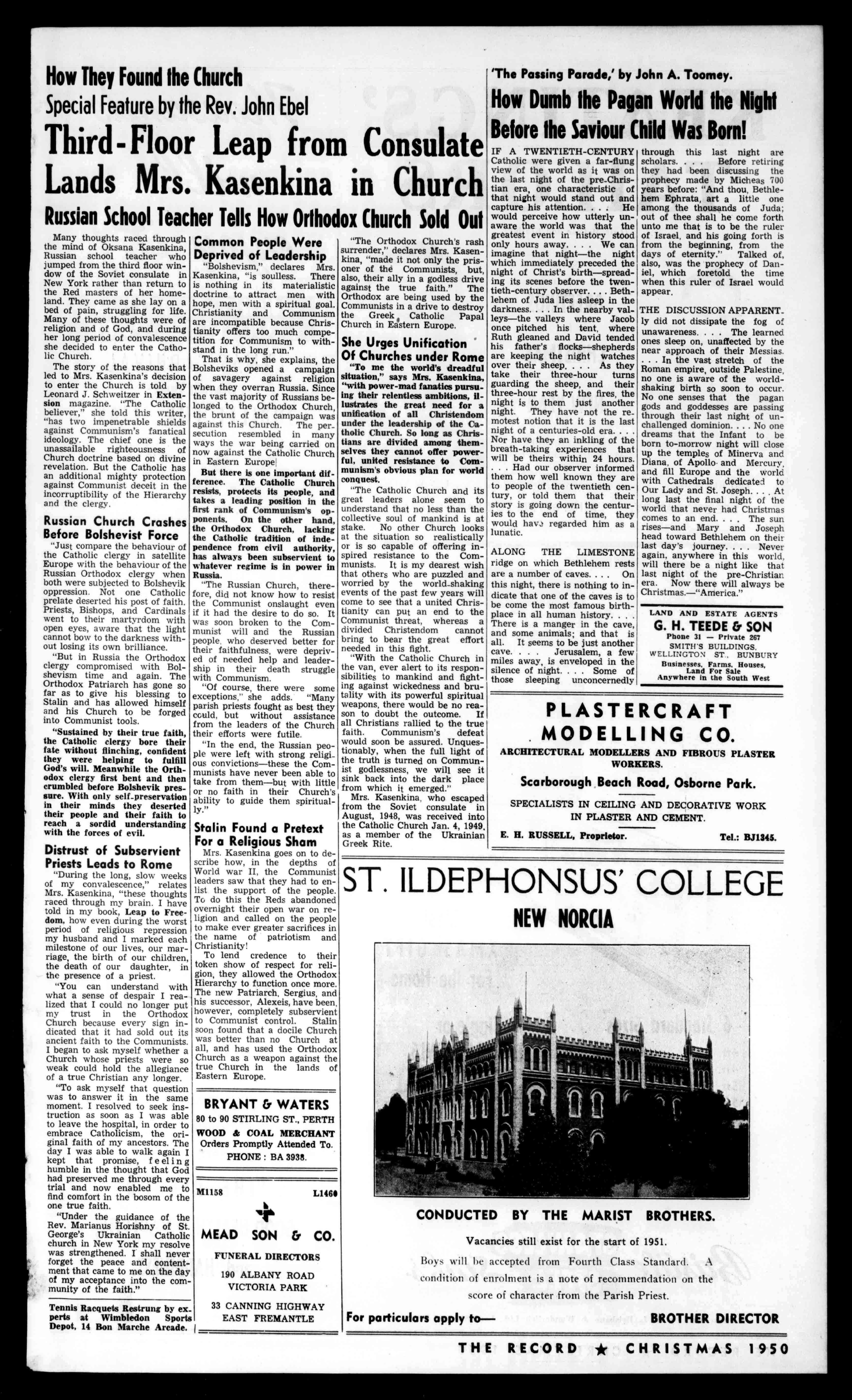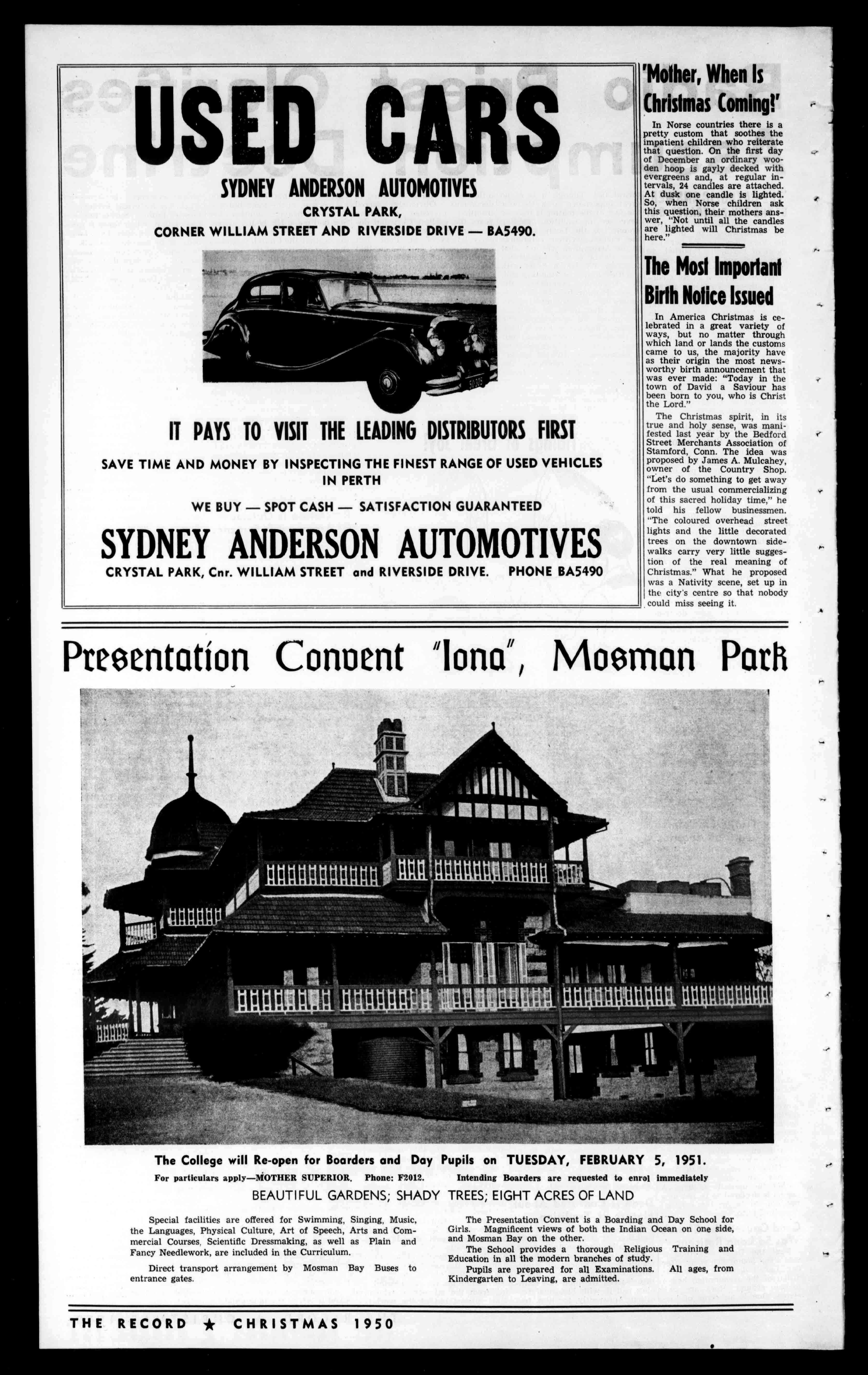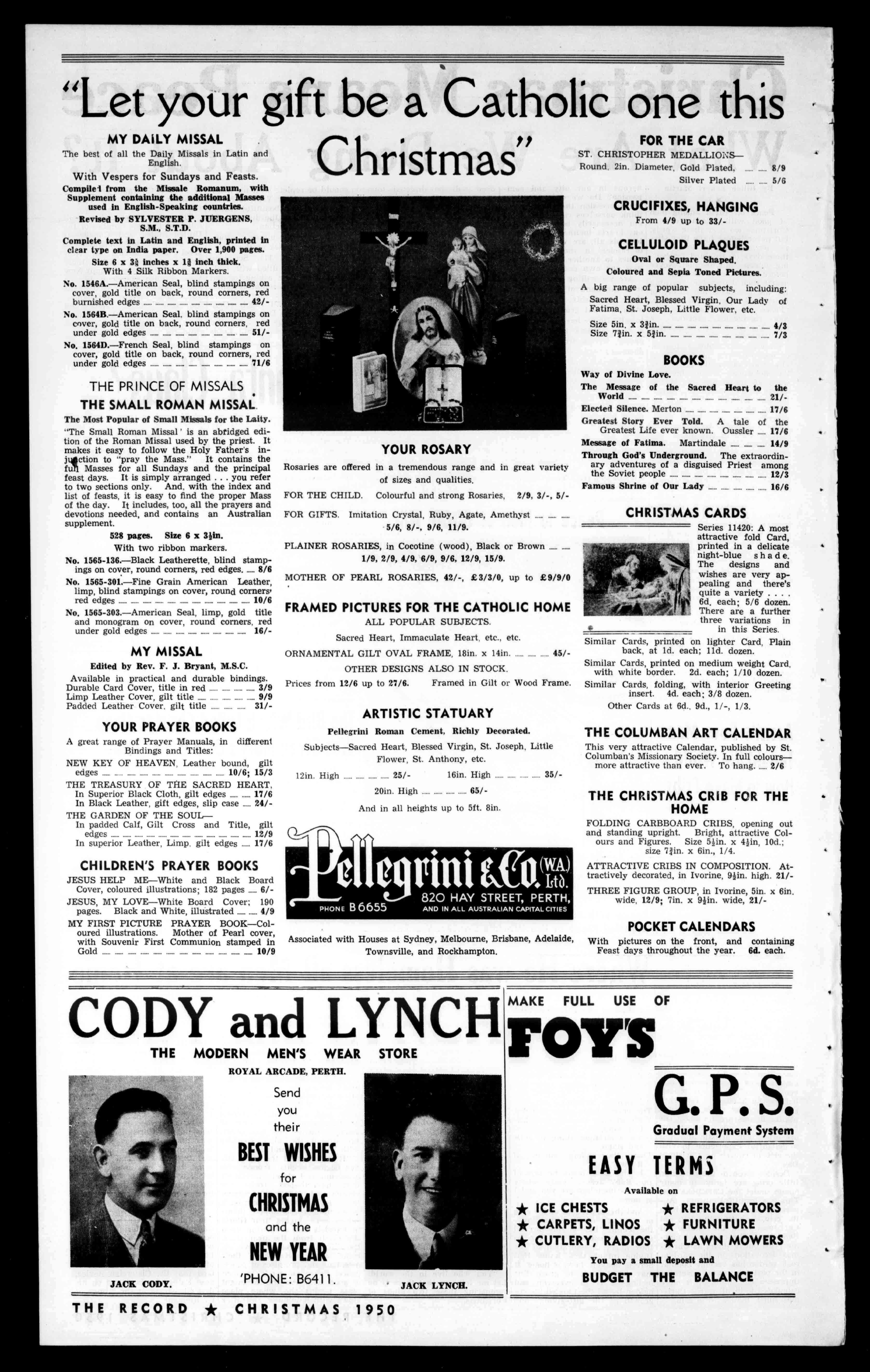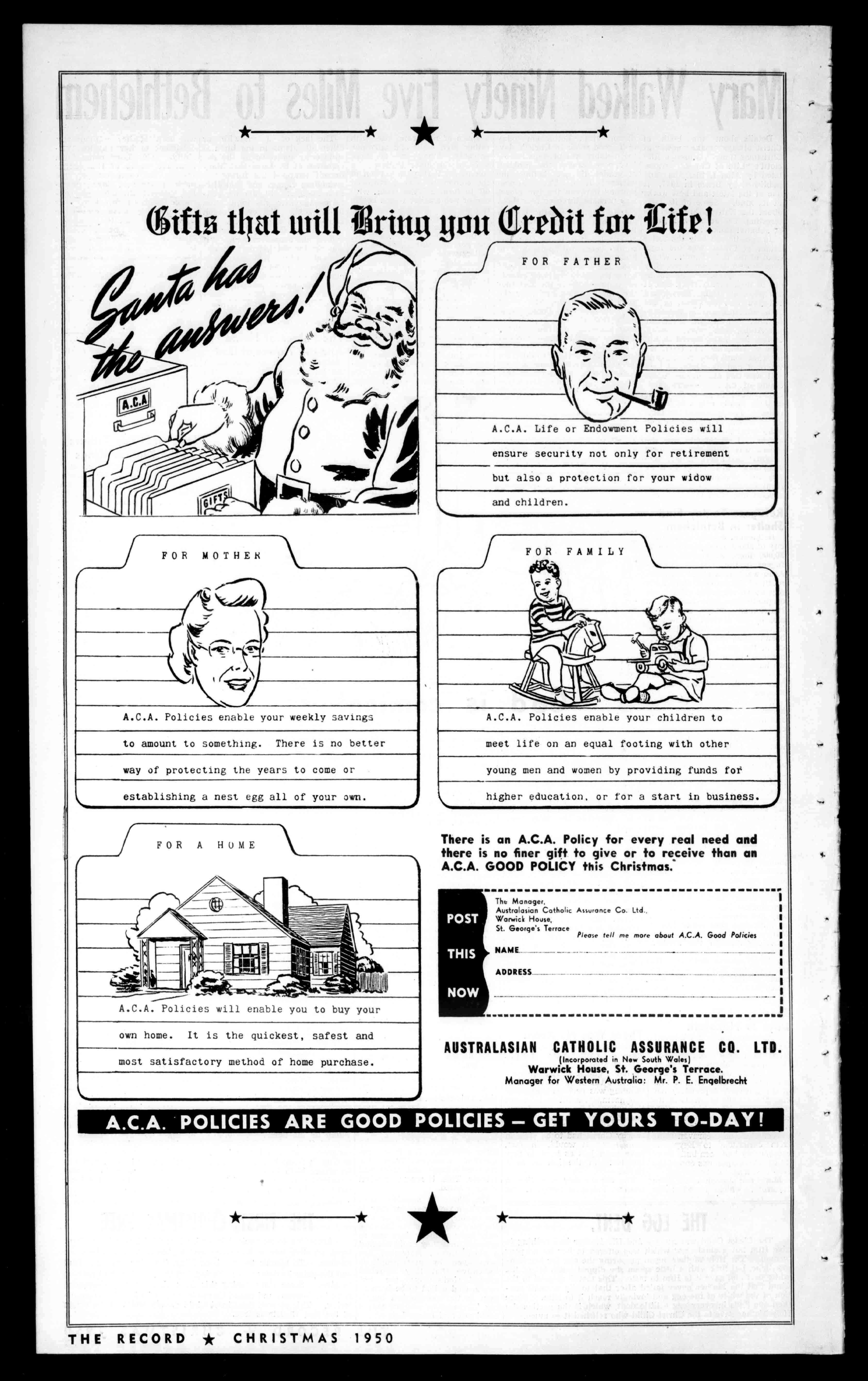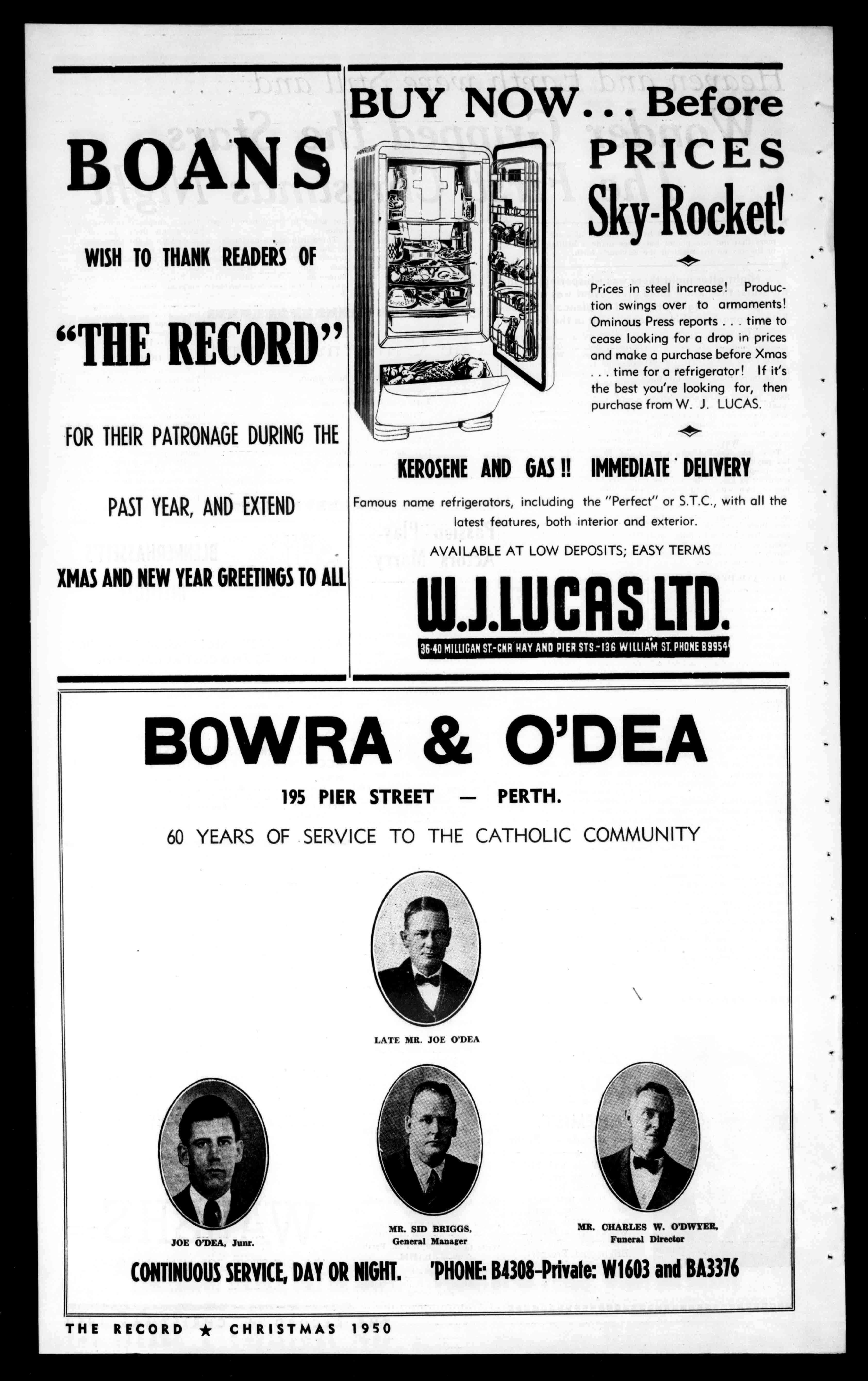 TOTHEREADERSOF "THERECORD" THROUGHOUTTHESTATE EZYWALK1N PTY.LTD. OFFER THANKSAND APPRECIATION FORTHEIRPATRONAGEDURINGTHEYEAR ANDINRETURNEXTENDTHEIRBESTWISHES Paiwer4CELEBRATE cnYEARSTRADING wilharemodeledRote Comeinandsee THEFINEST SeedandPlantDisplay INAUSTRALIA 50yearsagowithmuchexperience,keenenthusiasmandagiftfor hardwork,GeorgeDawson,sen.,the founderofDawsonHarrisonPty. Ltd.,decidedtobuildonquality,a seedandplantbusinessthatwould earnwidespreadrecognitionandapprovalthroughouttheState. To_daythatidealhasbeenachieved,andthenameofDawsonsisnow universallyacceptedasasignof qualityinseeds,plants,shrubs,and trees everywhere. Asafittingcelebrationofthat50 yearsofachievementtheDawson RetailCentre,at109BarrackStreet, Perth,hasbeencompletelyremodelledonmodernlines,andyouare cordiallyinvitedtoview,without obligationtobuy,thehundredsof lovelyplantsdisplayedunderspeciallighting....Hereyouwillseeadisplaythathasnoequalanywherein Australia.Comein!Youwillbe verywelcome. DAWSONHARRISONPTY.LTD.109BARRIO;STPERTHoi;eitifit;terfr 6,4011/01-0E9RD GREETINGS BESTWIShES FROM E.C.STOTT&CO.,PTY.LTD. REMINGTONTYPEWRITERS, GESTETNER DUPLICATORS, ANDALLOFFICEEQUIPMENT. AND STOTT'SBUSINESSCOLLEGESLTD. HIGHGRADEBUSINESSTRAINING. PERPETUALTRUSTEEBUILDINGS, ST.GEORGE'STERRACE,PERTH, ANDATFREMANTLE. MIStiliNSitifilfOSIISIVEISNI191411161$7141NNI Ma!'YourXmas TeMerry('and Trioht Atthistimewhenold friendshipsarerenewedand valuedassociationsrecalled withgratitude,theManagementandStaffofAhern's sendyouonceagaintheold greeting "AMerryXmasanda HappyNewYear." AlIERN*'S *** HAYandMURRAYSTS. THERECORD*CHRISTMAS1950 ffiliMalialk11116141011101MXIMMIX143616.
