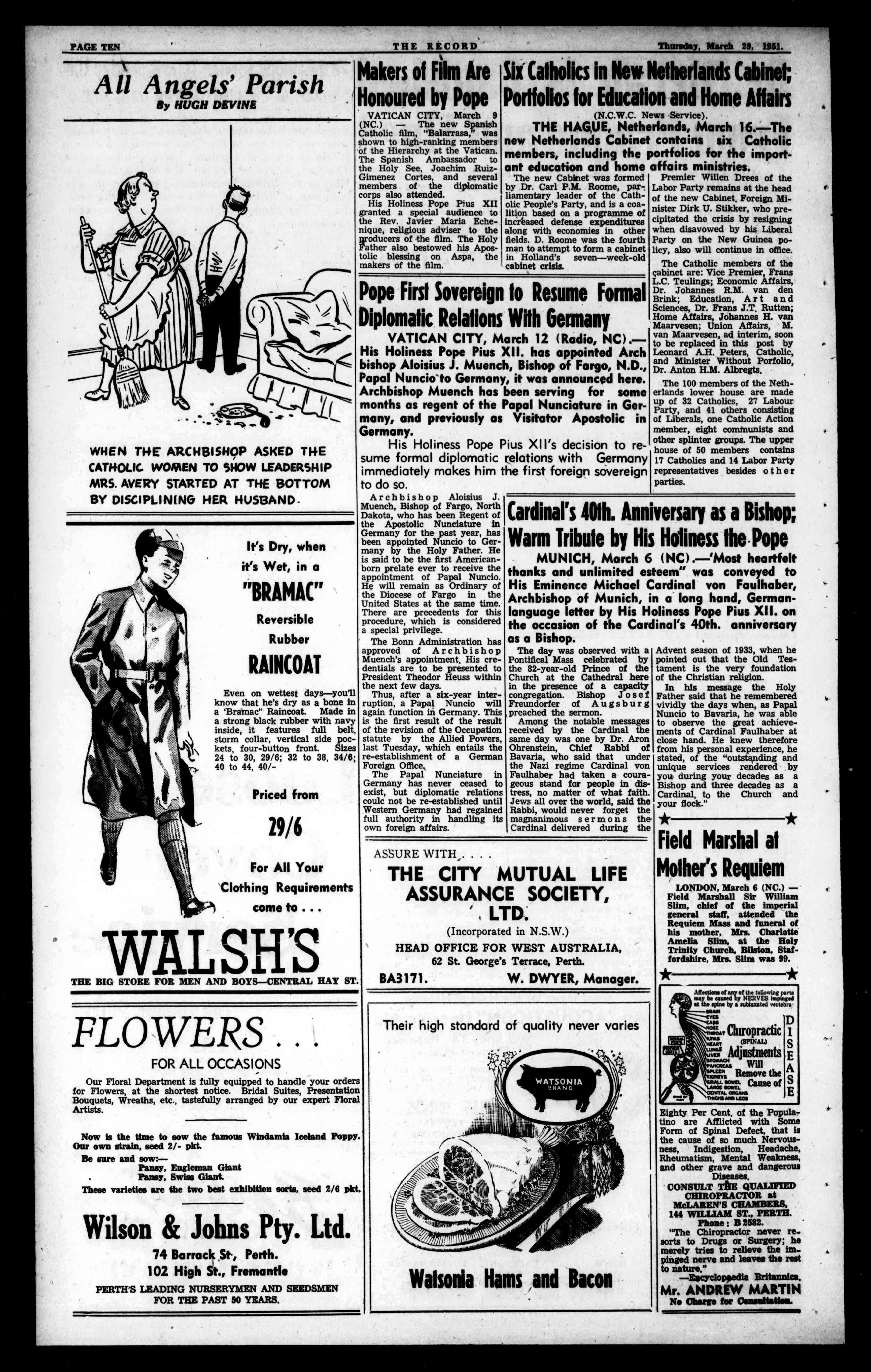 ThefirstMassintheparishofRiverton,which wasrecentlyentrustedbyHisGracetheArchbishoptotheSocietyoftheCatholicApostolate(Pallottines),wascelebratedonEasterSundaybythe VeryRev.BrunoKupke,ProvincialoftheSociety. FatherBruno,whoisvisitingtheHousesoftheSocietyin thisState,isatpresentstaying atthePallottineMonastery,20 Hawkesburyroad,Rivervale. BycourtesyoftheRiverton