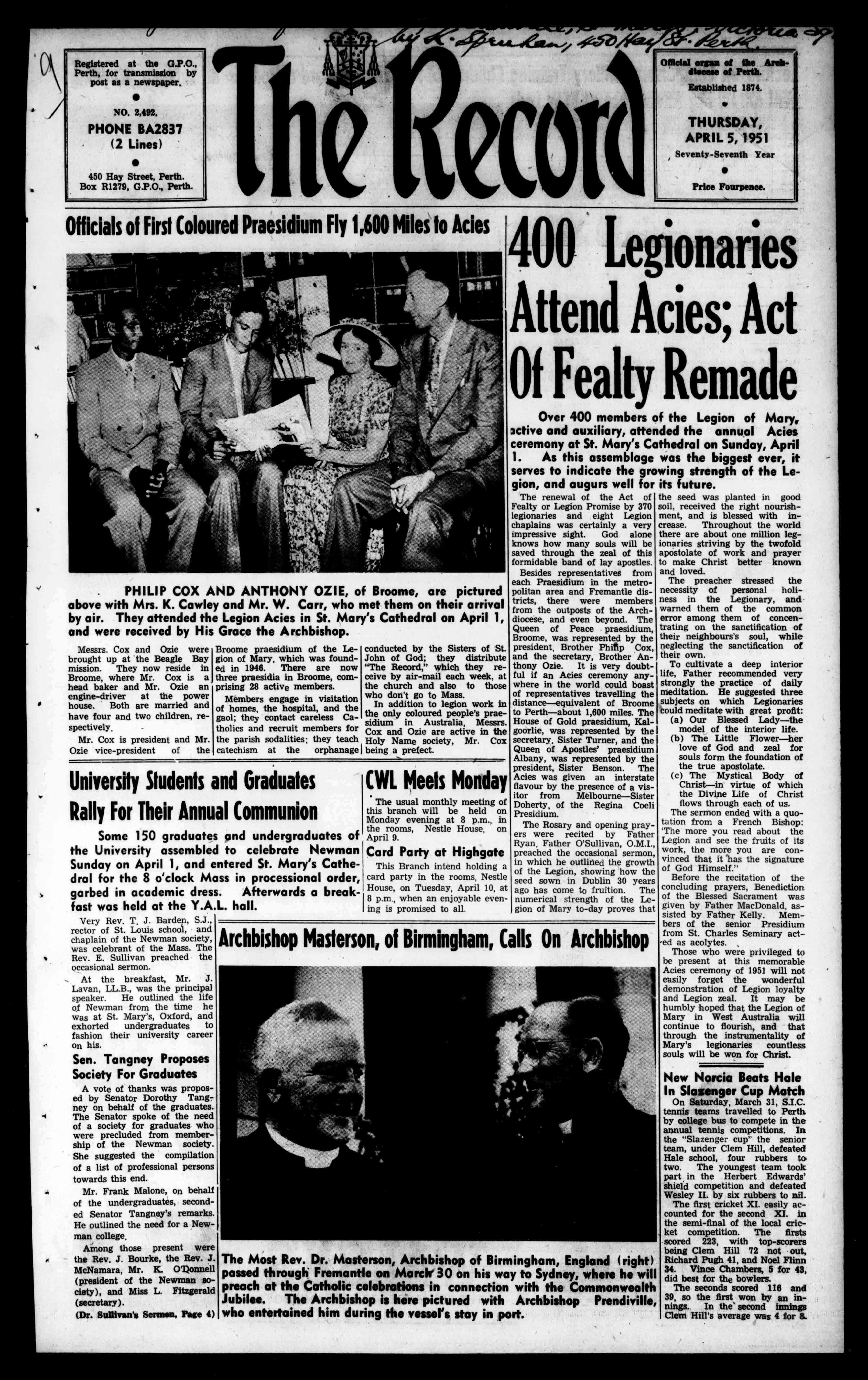 Thosewhowereprivilegedto bepresentatthismemorable Aciesceremonyof1951willnot easilyforgetthewonderful demonstrationofLegionloyalty andLegionzeal.Itmaybe humblyhopedthattheLegionof MaryinWestAustraliawill continuetoflourish,andthat throughtheinstrumentalityof Mary'slegionariescountless soulswillbewonforChrist.