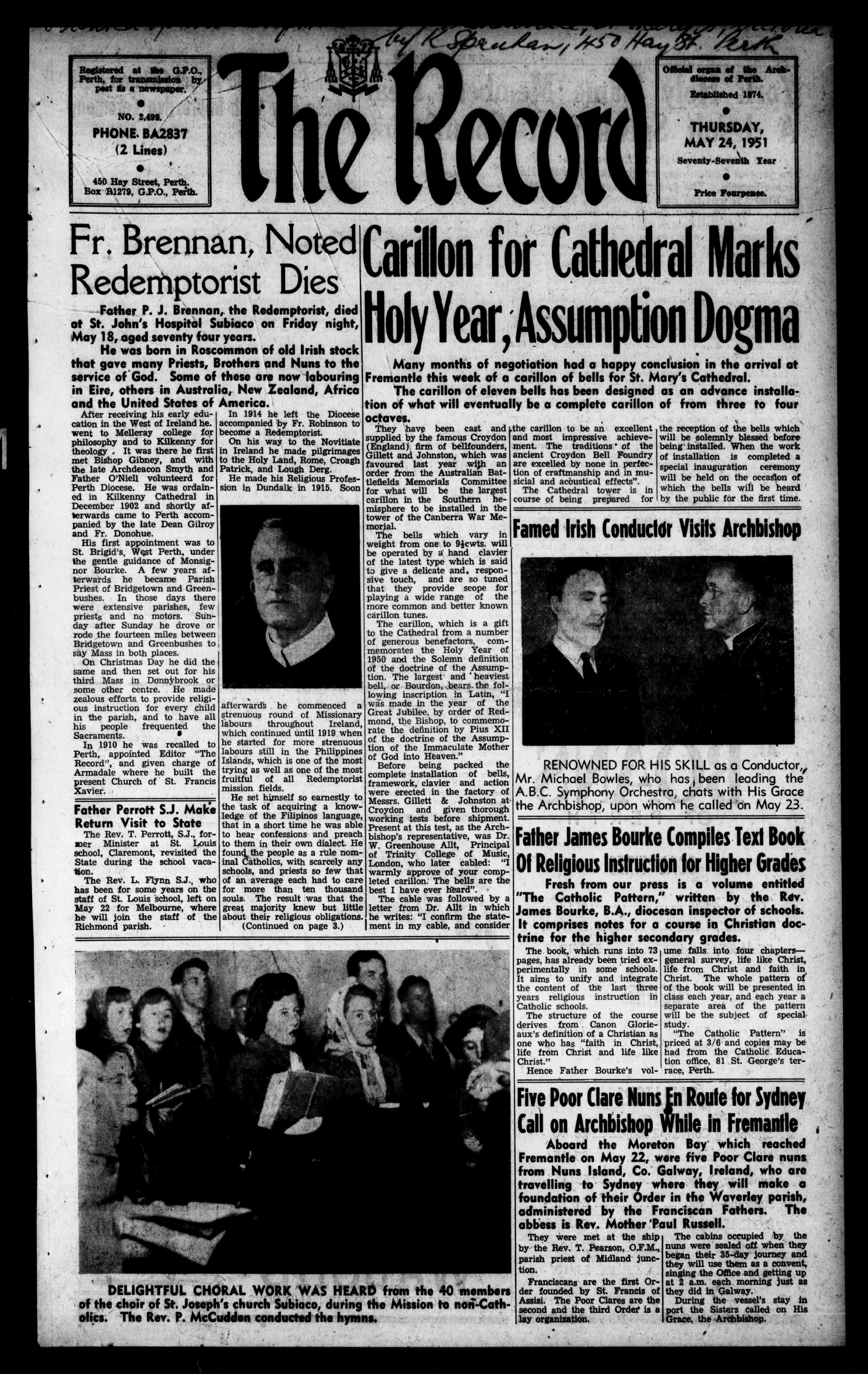 FatherO'NiellvolunteerdforHemadehisReligiousProfesPerthDiocese.Hewasordain-sioninDundalkin1915.Soon edinKilkennyCathedralin December1902andshortlyafterwardscametoPerthaccompaniedbythelateDeanGilroy andFr.Donohue.