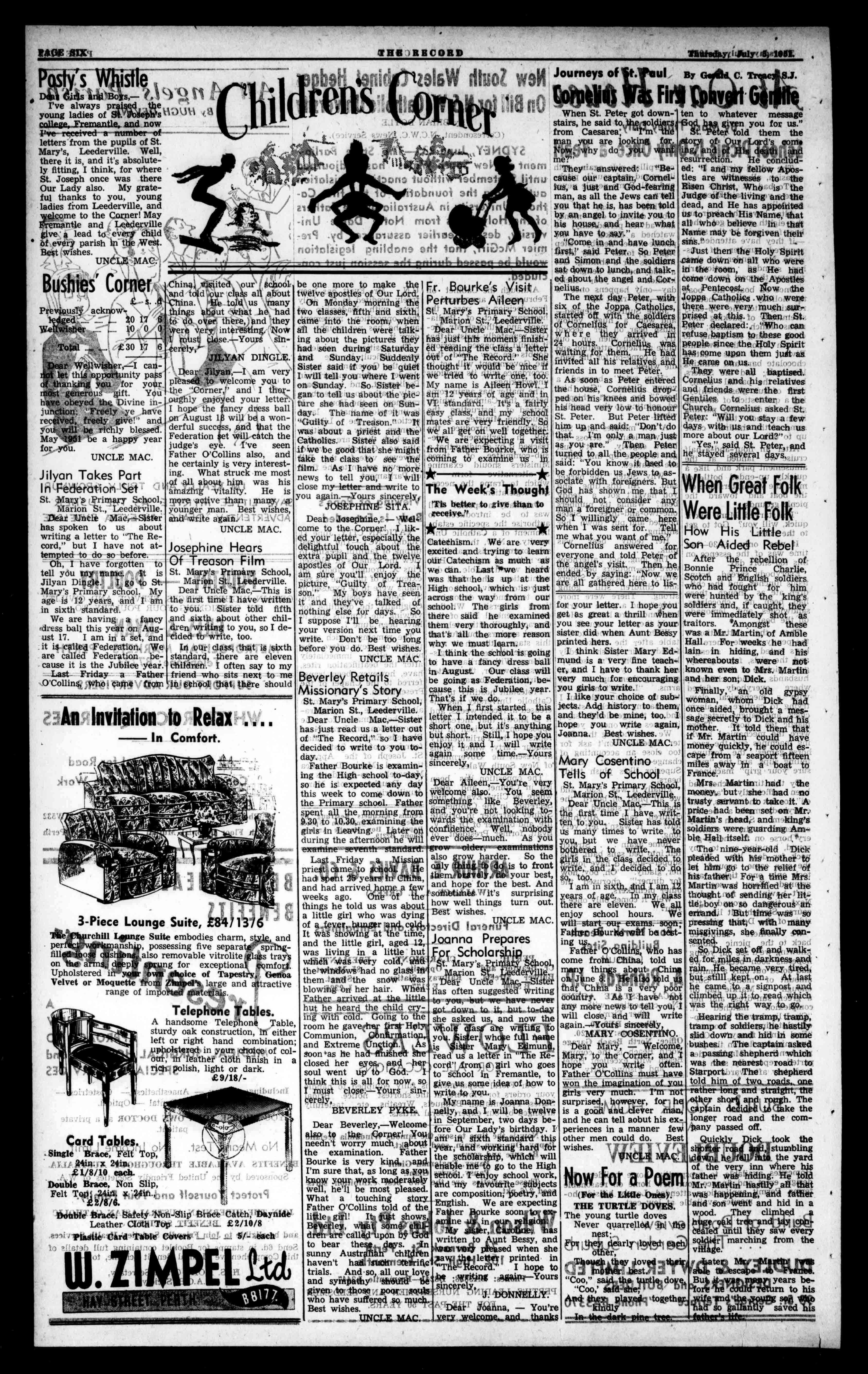 ALLMODELS:Antimagnetic-water resistant-sweepcentre-secondhandcalendargraph-selfwinding. OMEGA*SERVIS* CYMA*ROLEX* *ELECTION* MOVEX JEWELEX RELIDE LOAM-MANURES-GRAVEL-SAND Any BitumenQuantityDelivered.LandscapeGardener.Graveland CourtsConstructed,LawnsLaidOut&Top-dressed A.E.CRANSTON,Contractor WarwickHouse,63St.George'sTee..Perth.Phone:BA5331 CANDLES!!!! 65%and25%,NowAvailable (Limitedsupplyonlyatpresent) AlsoINCENSE&CHARCOAL NEWBOOKSOFINTERESTINCLUDE:JOYSTREET.By'FrancesParkinsonKeyes 15/THEHELLBOMB."Themostauthoritativebook yetwrittenaboutthehydrogenbomb.'' ...........14/6 APOLOGETICSANDCATHOLICDOCTRINE. ByMostRev.M.Sheehan,D.D. PartII. 6/6 ASIMPLECOURSEOFRELIGION(Sheehan)..........3/WEHAVEAFINESUPPLYOFBOOKSATPRESENT. SECURETHEMWHILSTAVAILABLE. ALSOLARGESTOCKSOFROSARIES,PICTURES,and otherRELIGIOUSREQUIREMENTS. NOTEOURADDRESS: