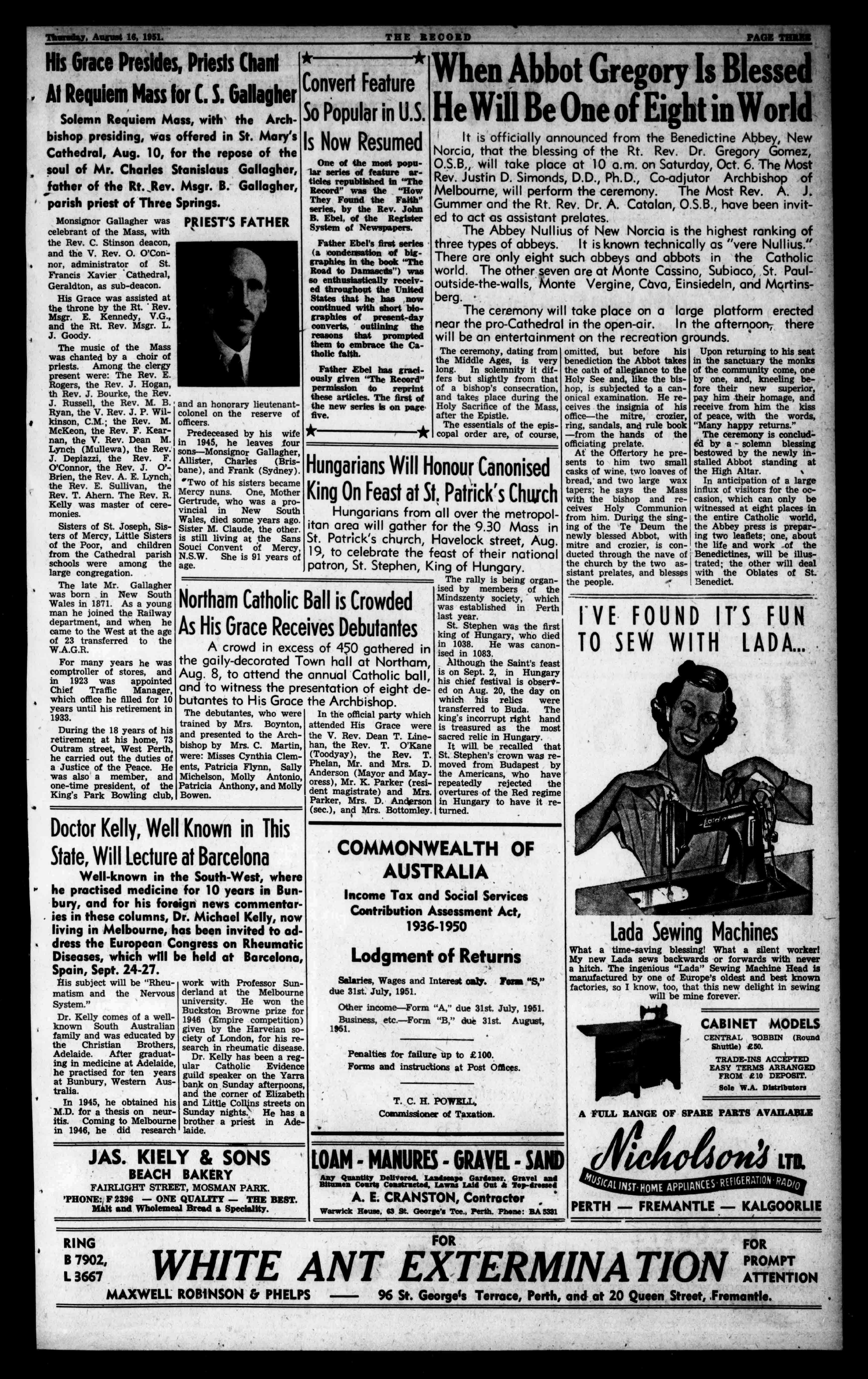 SolemnRequiemMass,withtheArchbishoppresiding,wasofferedinSt.Mary's Cathedral,Aug.10,forthereposeofthe soulofMr.CharlesStanislausGallagher, fatheroftheRt.,Rev.Msgr.B.Gallagher, parishpriestofThreeSprings.