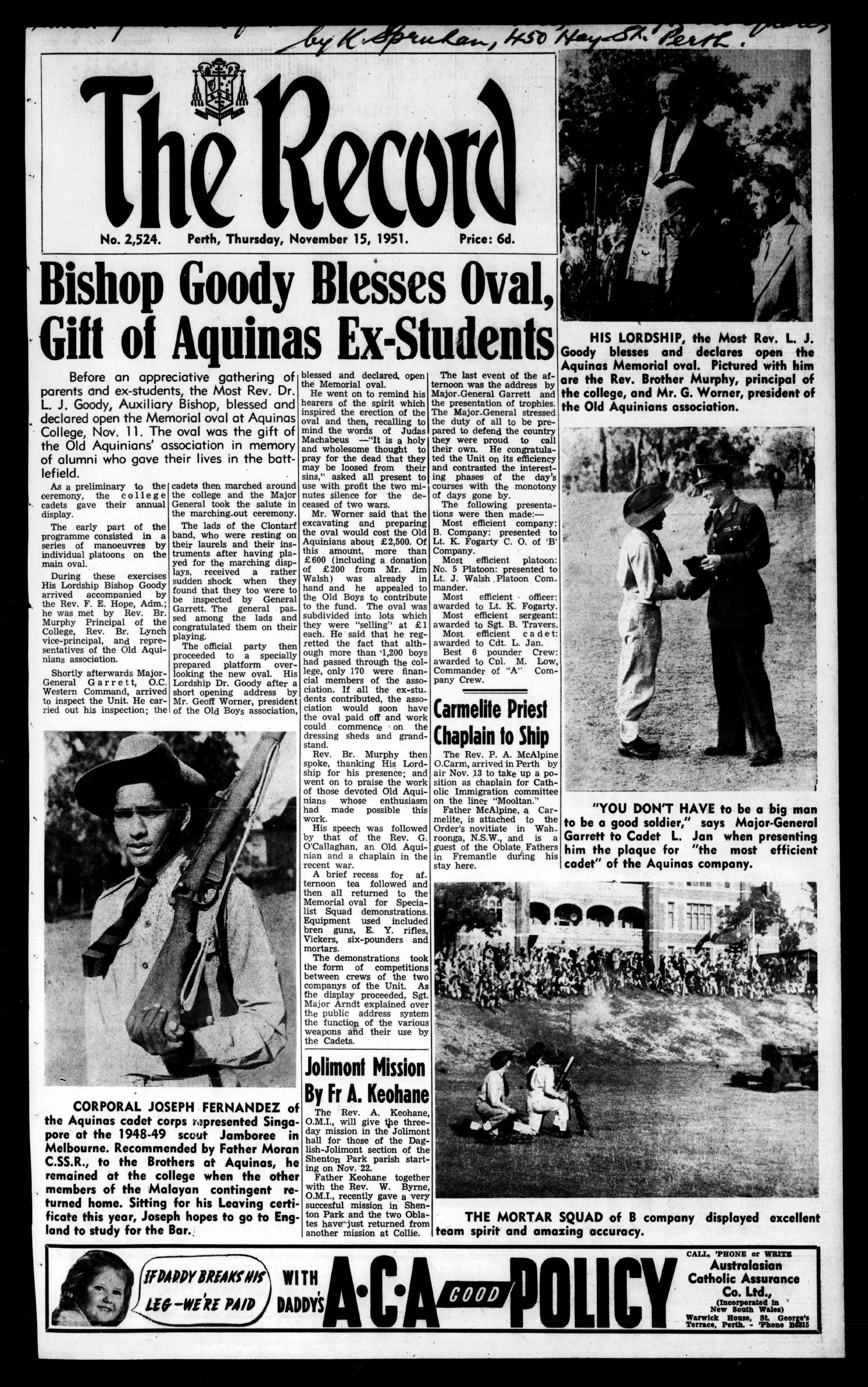 HISLORDSHIP,theMostRev.L.J. Goodyblessesanddeclaresopenthe AquinasMemorialoval.Picturedwithhim oretheRev.BrotherMurphy,principalof thecollege,andMr.G.Worner,presidentof theOldAquiniansassociation.
