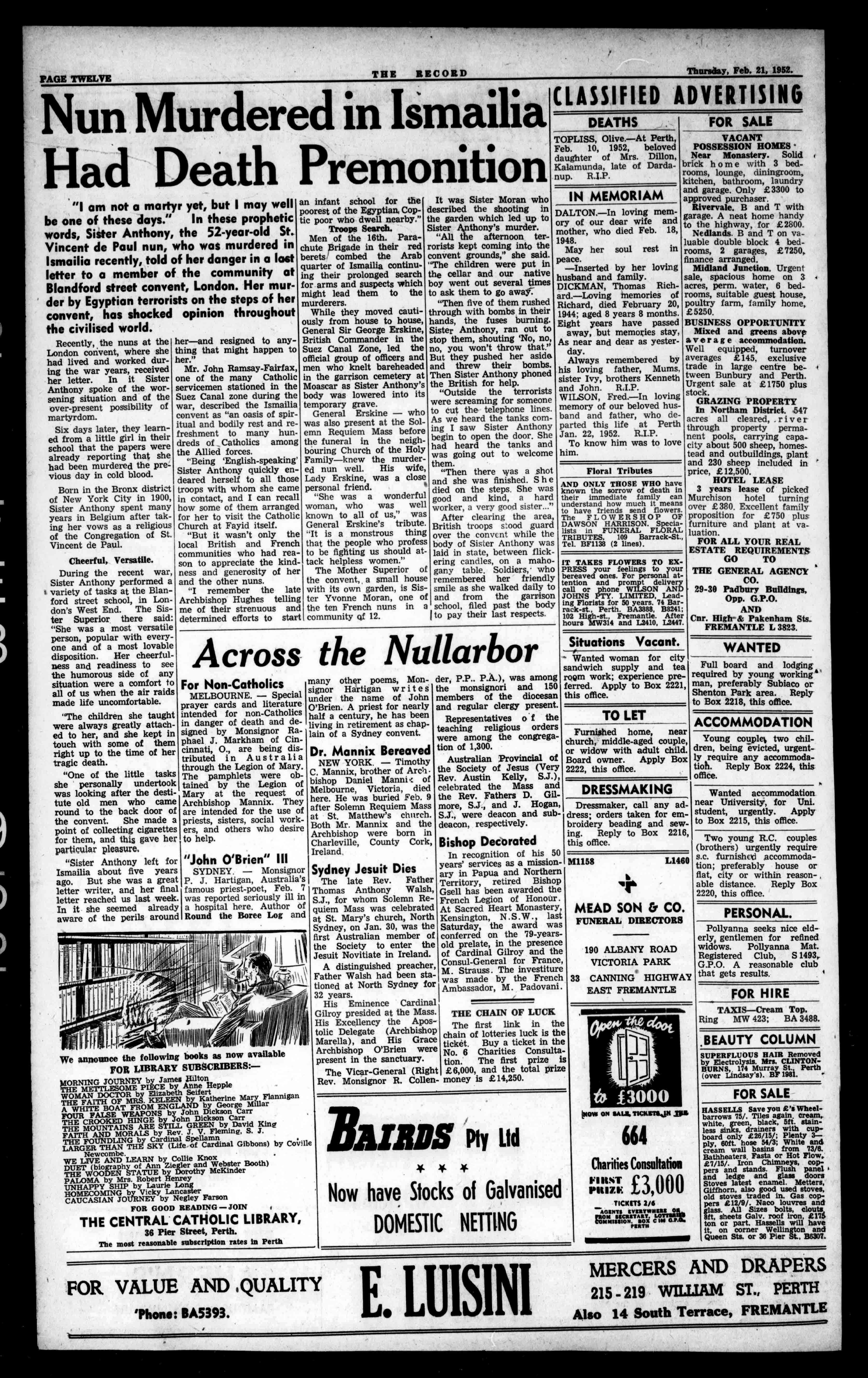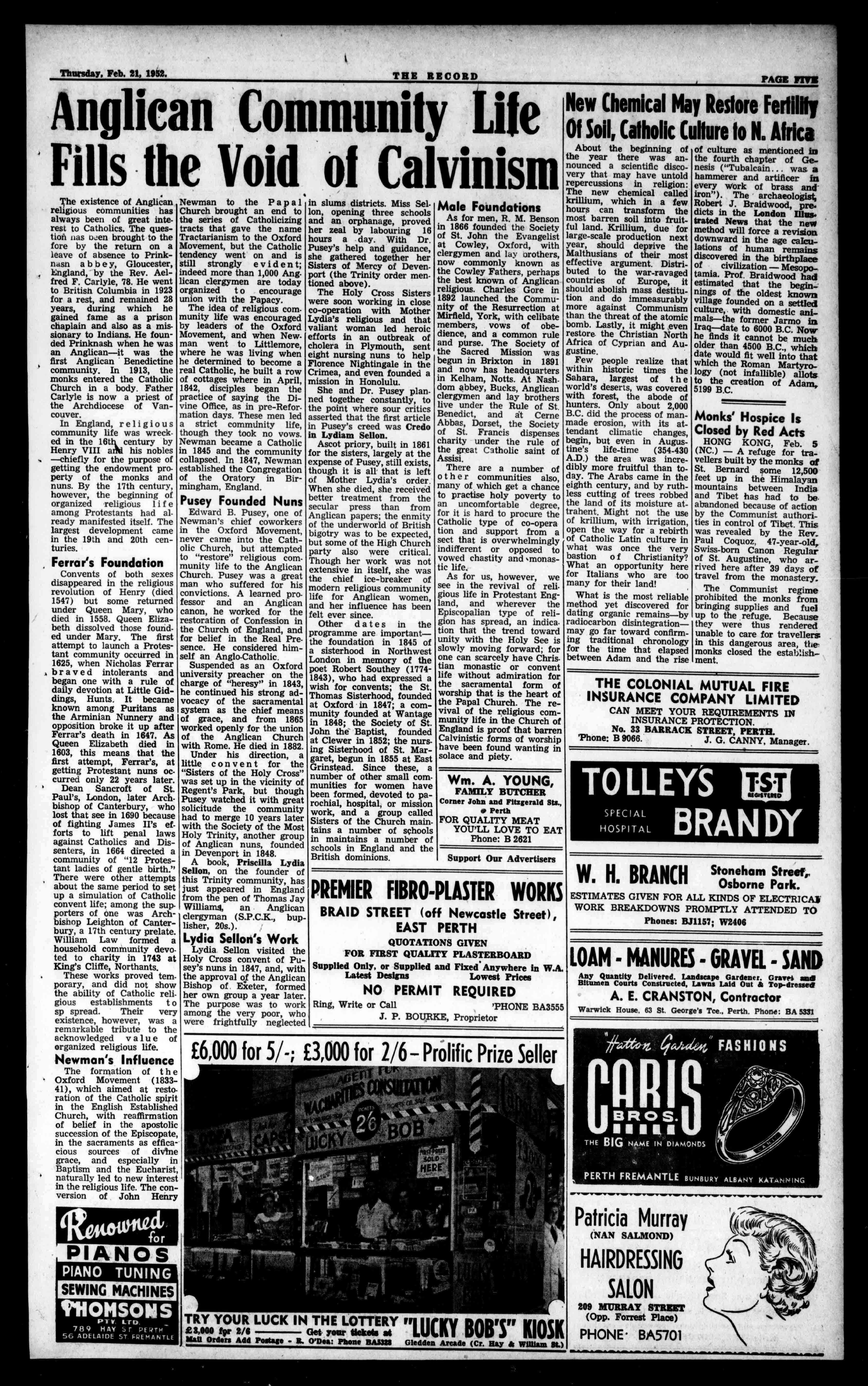 Firstweddingtobecelebratedbyabishopinthe ChurchofSt.Ambrose, Brunswick(Victoria),took placeonFebruary16,when Pauline,youngestdaughter ofMr.andMrs.J.E.Evans. Frederick-street,Brunswick, wasmarried,withNuptial Mass,toMr.HermanusVan Emmerik,ofHolland.CelebrantwasMostRev.Dr. OttoRaible,S.C.A.,D.D., VicarApostolicoftheKimberleys,north-westAustraliaThedecisionofthe Bishoptoperformthemarriagewaspromptedbya numberoffactors.The bride'smotherisvice-presidentofthePallottineMissionaryAuxiliary,which hasbeenworkingfora numberofyearsforthe aboriginesofthePallottine missionaryareas.Mrs. Evans'sseconddaughteris ateacherintheBalgo parishoftheKimberleys, andheryoungestson,John, isastudentatthePallottine Missionarycollege,Kew.
