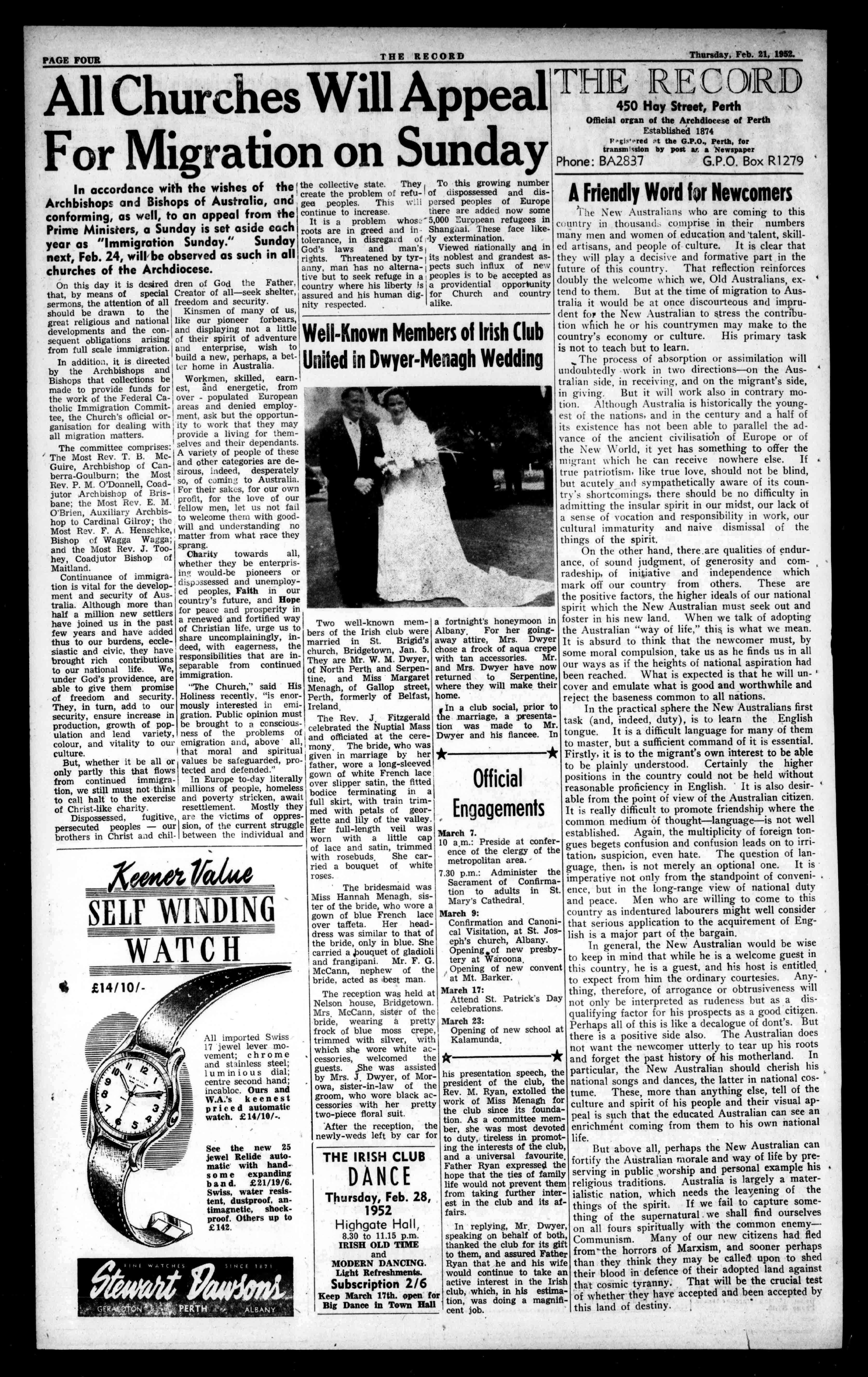 OnSundayFeb.24, V.C.W.members%AllentertainNewAustraliansfrom WillegeePark.Thefunction willcommencewithRosary andBenedictionanda sermonpreachedbythe Rev.L.Hornung,S.0A.,in German.Asocialanddance willfollowintheTamar Streethall.Allarewelcome socomealongandmake thissomethingfortheAustrianstoremember.