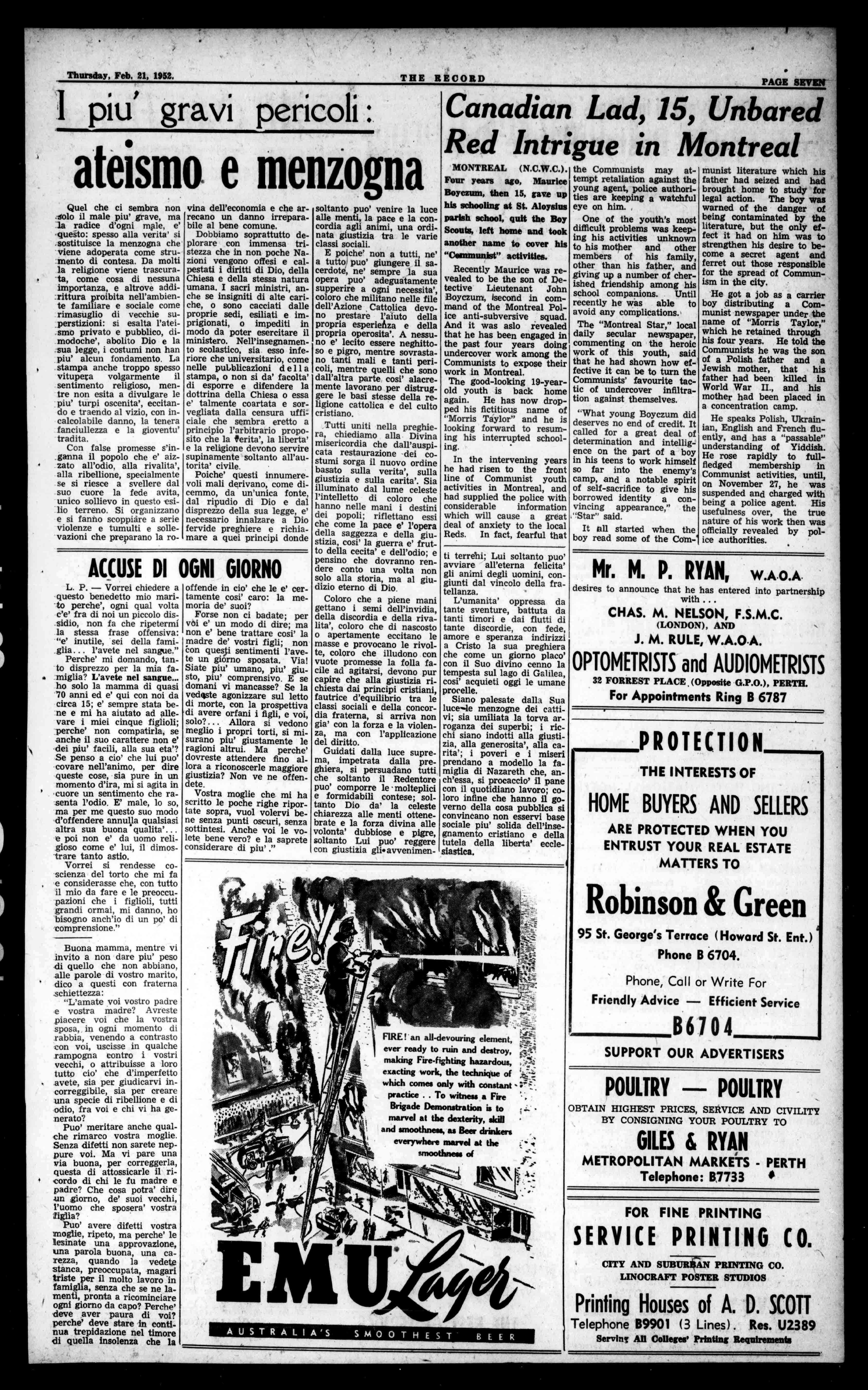 NearMonastery.Solid brickhomewith3bedrooms,lounge,diningroom, kitchen,bathroom,laundry andgarage.Only£3300to approvedpurchaser. Rivervale.BandTwith garage.Aneathomehandy tothehighway,for£2800. Nedlands.BandTonvaluabledoubleblock4bedrooms,2garages,£7250, financearranged. MidlandJunction.Urgent sale,spacioushomeon3 acres,perm.water,6bedrooms,suitableguesthouse, poultryfarm,familyhome, £5250.
