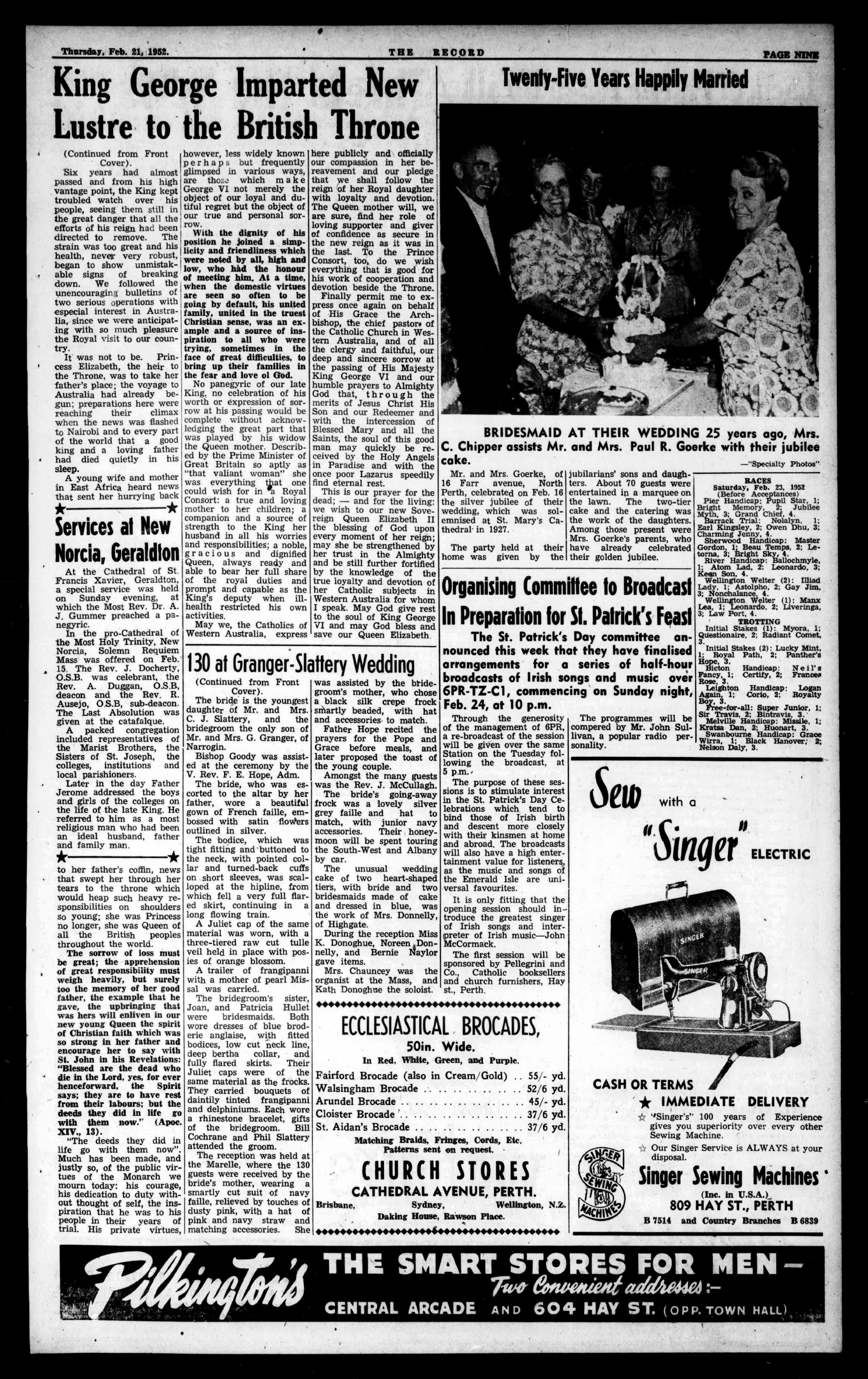 Overalmosthalfthe earth,however,therehad beensomethingmorethan externalcourtesyandregret,andasthepassingof afatherthedeathofHis MajestyKingGeorgeVI. byhis peoplesofeveryclime.An individual,whosepersonal qualitieshadendearedhim, evenasmuchashisroyal majestyhadcommandedrespect,leftbehindformillionsafeelingofsorrow andoflossthatnomere figure-headorsymbolcould everhaveevoked.