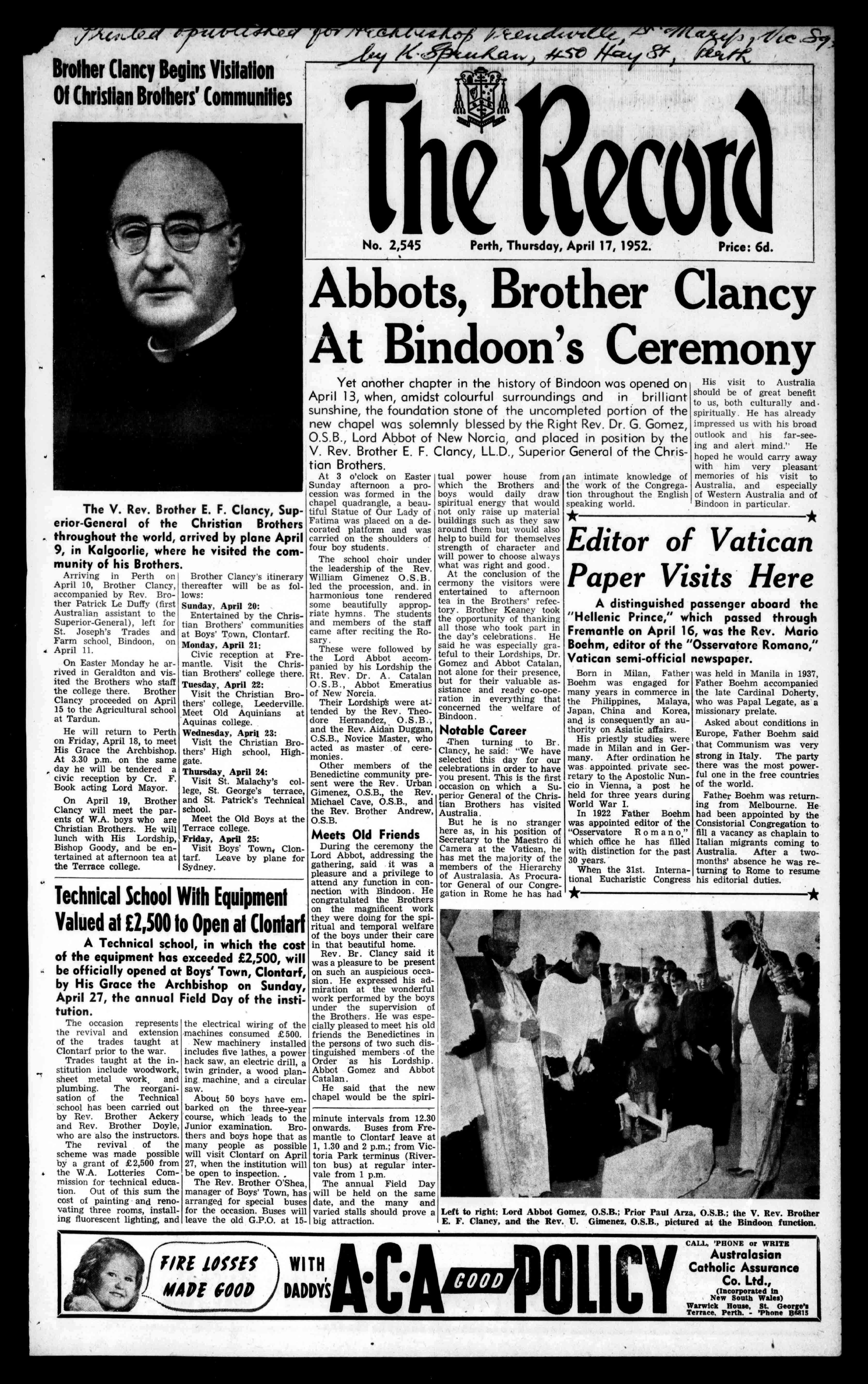 TheV.Rev.BrotherE.F.Clancy,Superior-GeneraloftheChristianBrothers throughouttheworld,arrivedbyplaneApril 9,inKalgoorlie,wherehevisitedthecommunityofhisBrothers.