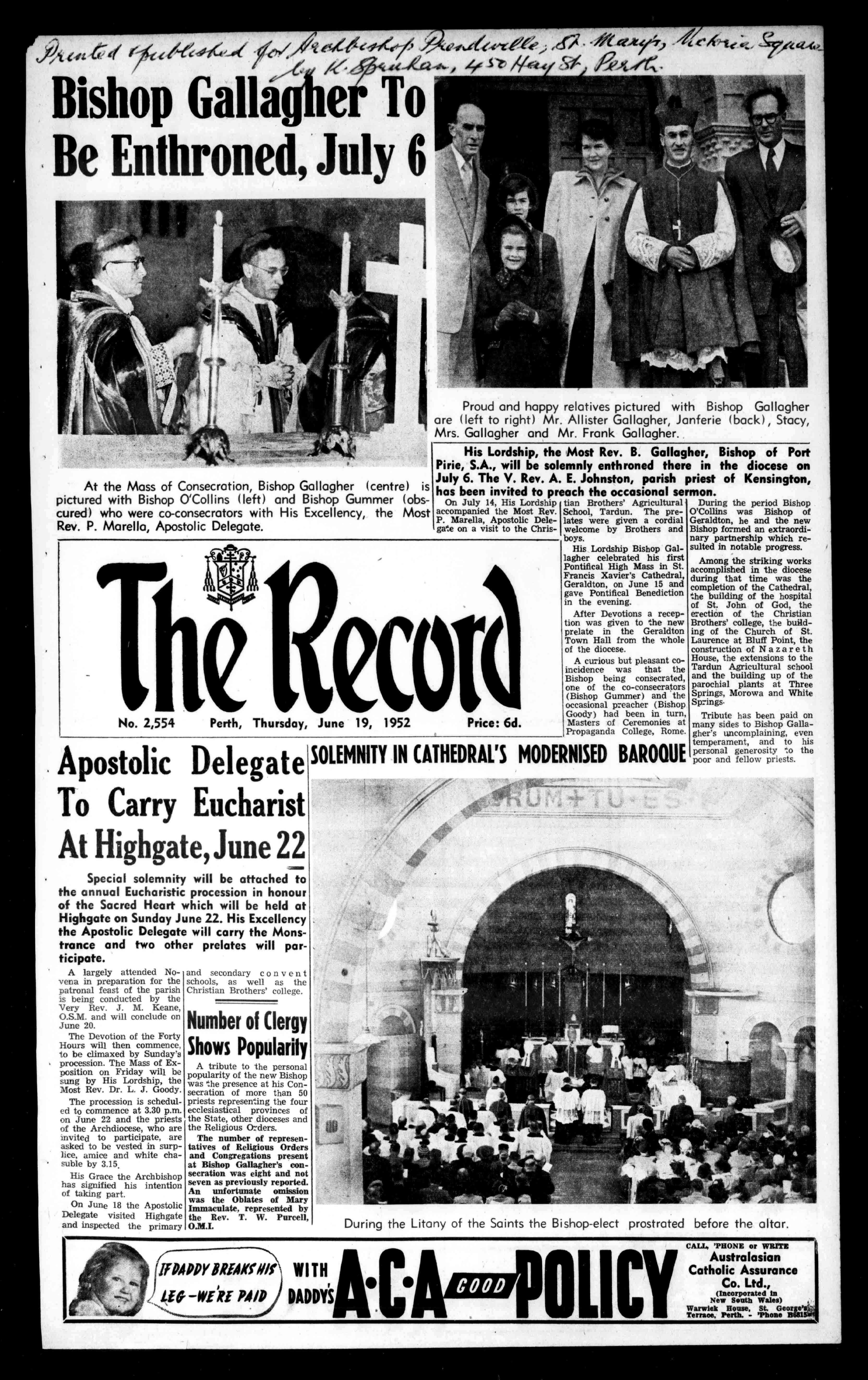 HisLordship,theMostRev.B.Gallagher,BishopofPort Pirie,S.A.,willbesolemnlyenthronedthereinthedioceseon July6.TheV.Rev.A.E.Johnston,parishpriestofKensington, hasbeeninvitedtopreachtheoccasionalsermon.