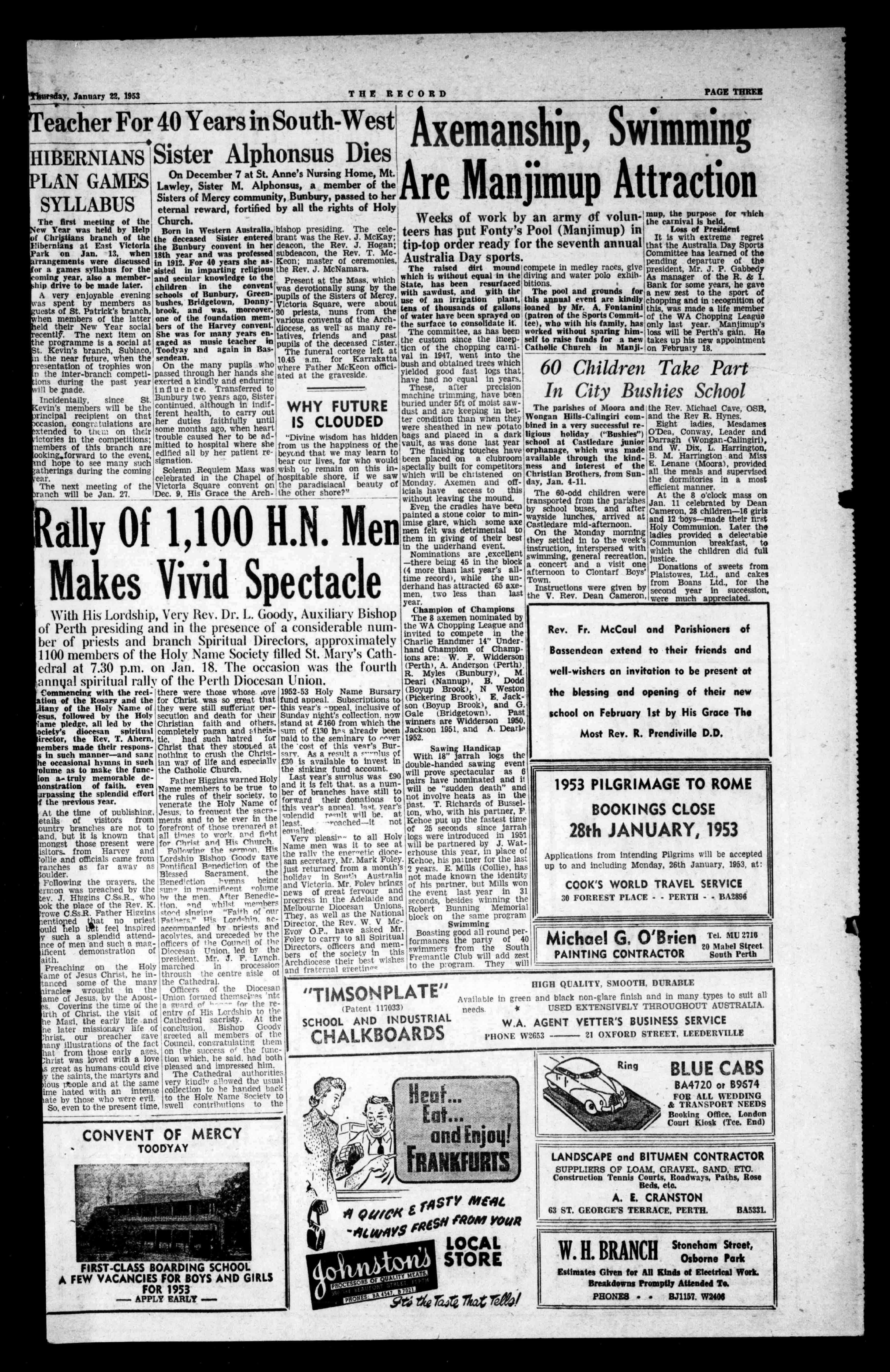 TherrySocietyactivities willcommencefor1953with thecelebrationofMassby Rev,P.McCuddenat8.30a.m. onMonday,Jan.26(AustraliaDay),attheLegionrooms, followedbyapicnicto.City Beach. Allthoseintendingtobe presentatMassareaskedto getintouchwithRonaLandquist(BF1311,Ex.79),ordrop anotetotheLegionrooms, BankofNSWChambers,St. George'sTee.,asalight breakfastwillbeprovided.All Catholicsinterestedareinvited. Thefirstmeetingforthe yearwillbeheldintheabove roomsat8p.m.February2.