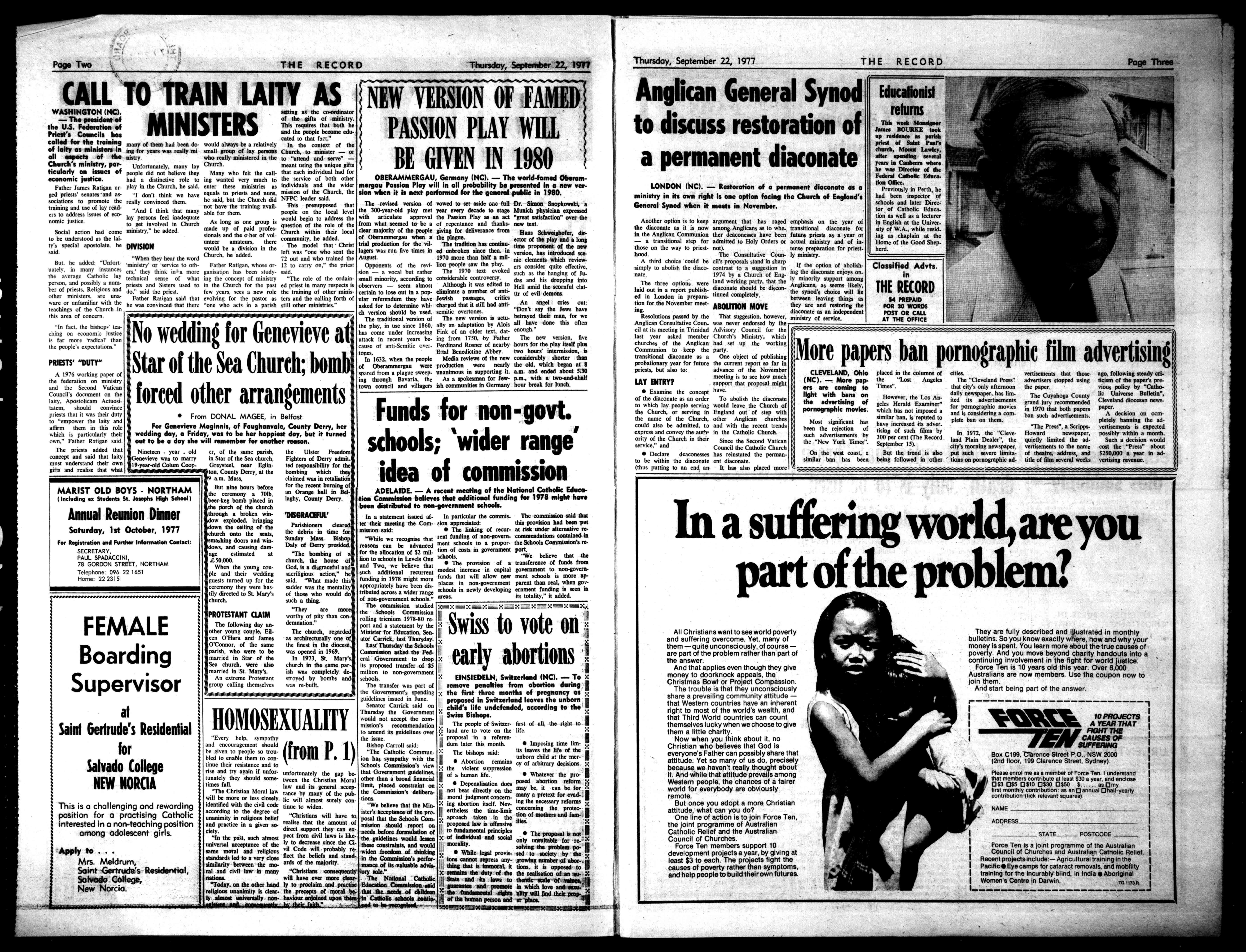 OBERAMMERGAU,Germany(NC).-Theworld-famedOberammergauPassionPlaywillinallprobabilitybepresentedinanewversionwhenitisnextperformedfarthegeneralpublicin1980. TherevisedversionofvowedtosetasideofichillDr.SimonSnopkowaki,a the300-year-oldplaymetyeareverydecadetostageMunichphysicianexpressed witharticulateapprovalthePassionPlayasanact"greatsatisfaction"overthe fromwhatseemedtobeaofrepentanceand an newtext clearmajorityofthepeopleairingfordetrverati°eteemHansSchweighofer,Oho(OberammergauwhenathePlane. actoroftheplayandalong trialproductionforthevii- Thetraditionhascondo.timeproponentaFthenthe lagerswasrunfivetimesmedunbrokensincethe,.inverger.hasintend., August. Augu 1970morethanhalfamil-theeth'theth,whiche,.. Opponentsoftherevi.bonpeoplesawtheplay, enthiderthe effective. sion-avocalbutrather The1970 text evoked such as thehltetaiag of smallminority,accordingtoconsiderablecontrovervy. athihit -seemalmost AlrouShitwas editedtoHellamidthescornfulclam. certaintoloseoutinapop-eliminateanumberofsub- ,e.tl ularreferendumtheyhaveJewishpassages,critic askedfortodeterminewhitchargedthatitstillhadanti.min ordews have chversionshouldbeused.seTicovertones. ThetraditionalversionofThenewversionisact.betrayedtheftman,feywe donethisMen theplay,inusesince1860,allyanadaptationbyAloisallhave hascomeunderincreasingFinkofanoldertext,dartcough." attackinrecentyearsbe-ingfrom1750,byFather Thenewversion,five causeofanti-Semiticover.FerdinandRosnerofnearbyhoursfortheplayitselfplus times. EttalBenedictineAbbey.twohours'intermission,is In1632,whenthepeople Mediareviewsofthenewconsiderablyshorterthan AOberammergau weanproductionwerenearlytheold,whichbeganat8 sparedfromaplaguesweep-an insupportingit.a.m.andendedabout5.30 ingthroughBavaria.the AsspokesmanforOW-p.m.,withatwo-mdahelf towncouncilandvillagersishcommunitiesinGermanyhourbreakforlunch.