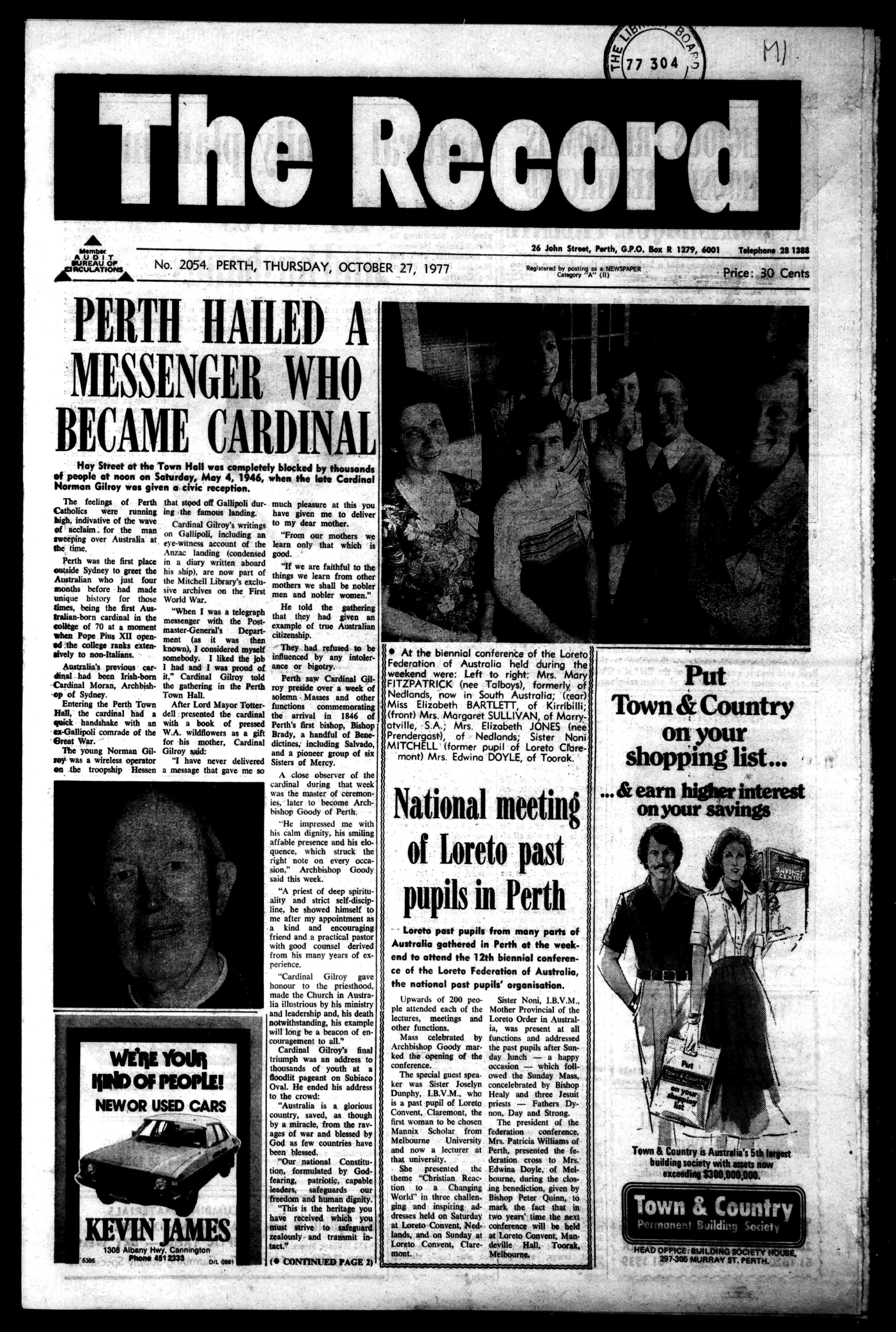 Perthwasthefirstplace outsideSydneytogreetthe Australianwhojustfour monthsbeforehadmade uniquehistoryforthose times,beingthefirstAustralian-borncardinalinthe collegeof70atamoment whenPopePiusXIIopenedthecollegeranksextensivelytonon-Italians.