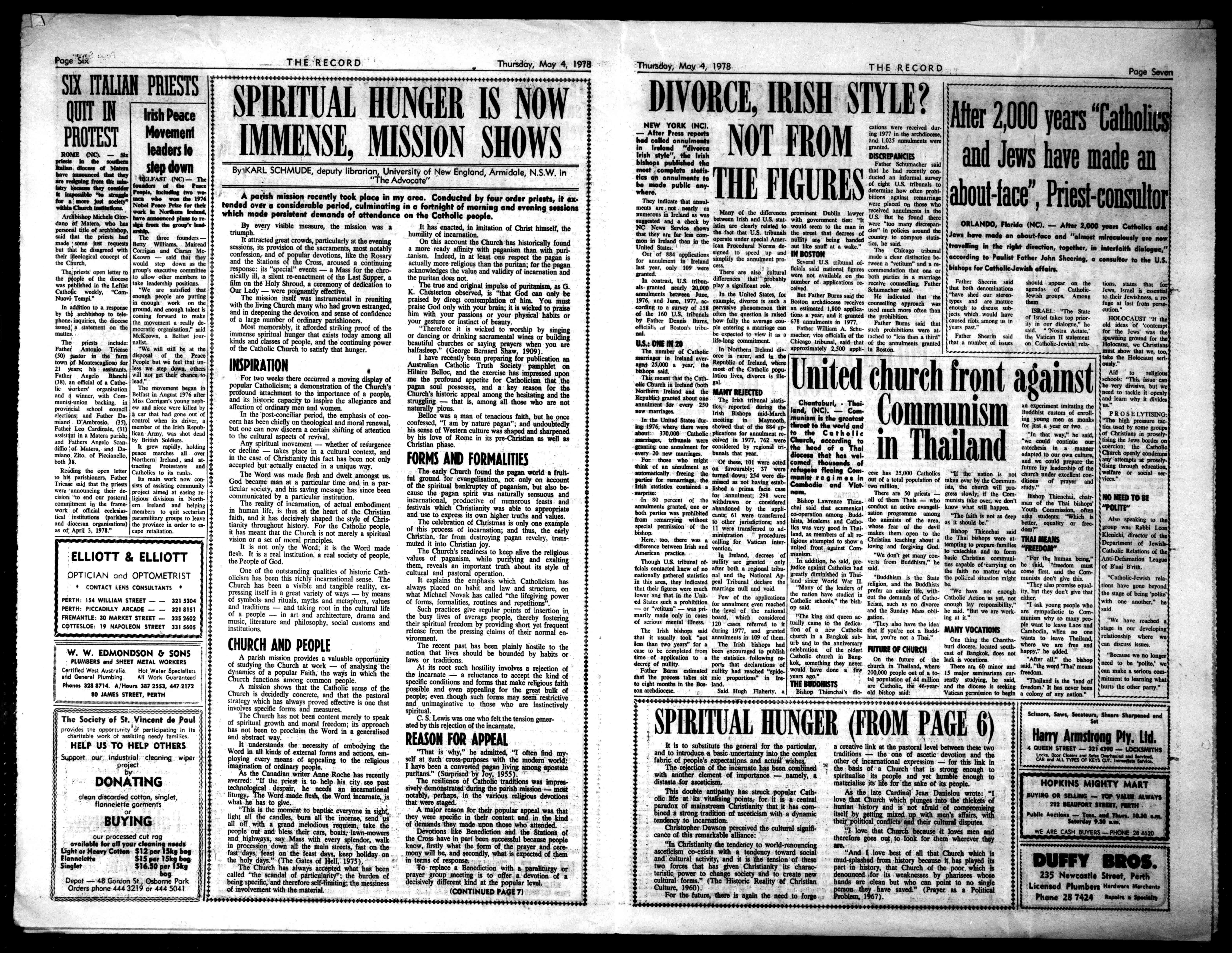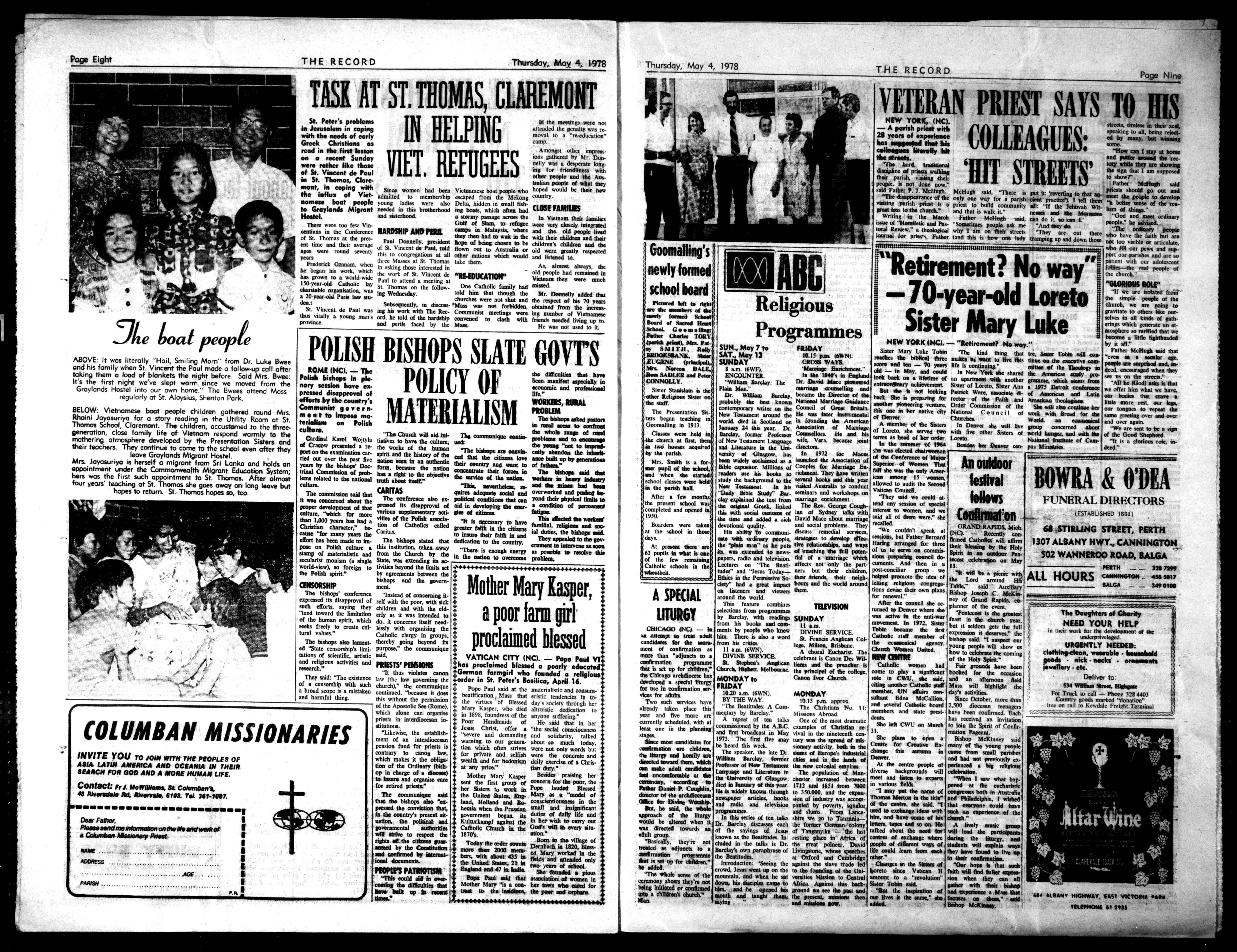 ate weareisoldfront thesimplePM*ofthe church,wearegrogte gravitate10otherslikeourselvesinallkindsofgatheringswhichgenerate atmospheresominedthatwe becomelittlelightheaded byitell' FatherMcHugholdthat "muiaarasterma, week..eessaelsad.M Med.encouragedwhenthey see01ontiestreets." 5rAll he/God)adoratth w.eofferhimwhatwehave. oarImamdrran talemorema.cr ourManesMrepeattbe sanepro..Ovvemeldon, overagain. "Viearese.toheam ofItoGoadShepherd.rit1, 21011011110.. deed." 7NERAI.DIRECTORS (ESTABLISHED19,S, 68STIRUNGSTREET,PERTH 1307ALBANYHWY.,CANNINGTON 502WANNEROOROAD,BALGA PERTH 1207299 ALLHOURSC".'"GMN.".' TINDegyMersofClserNy NEEDYOURHELP 4e.r-workkrthedevelop.*ol* underoriselegril URGENTLYNEEDED: clothing-clean,wearableImmoleld goods nick-necks oremanneth jewelleryetc. Deliverto 53aifillehenSlaue.Mama lerTrucktocall-Phone3284401 Cootienodsmarked'donation. 11.onrodtohendaleFreightTerminal Alivelymacpeep .41leadthepartings. &trimtheMug,ad sup studentswellMPlenwpm theyhovefueltoliveop toMoirmanmade. "Oarhopebthatmelt faithwillfind%IkeaNts rinswhentheycanan gathermathenbishop adtone*.eHe.Hie etaat...HIGHWAY,EASYVIECItlenoon foamyondrew"sod, Bishopdealers. telffinNellSIgolf