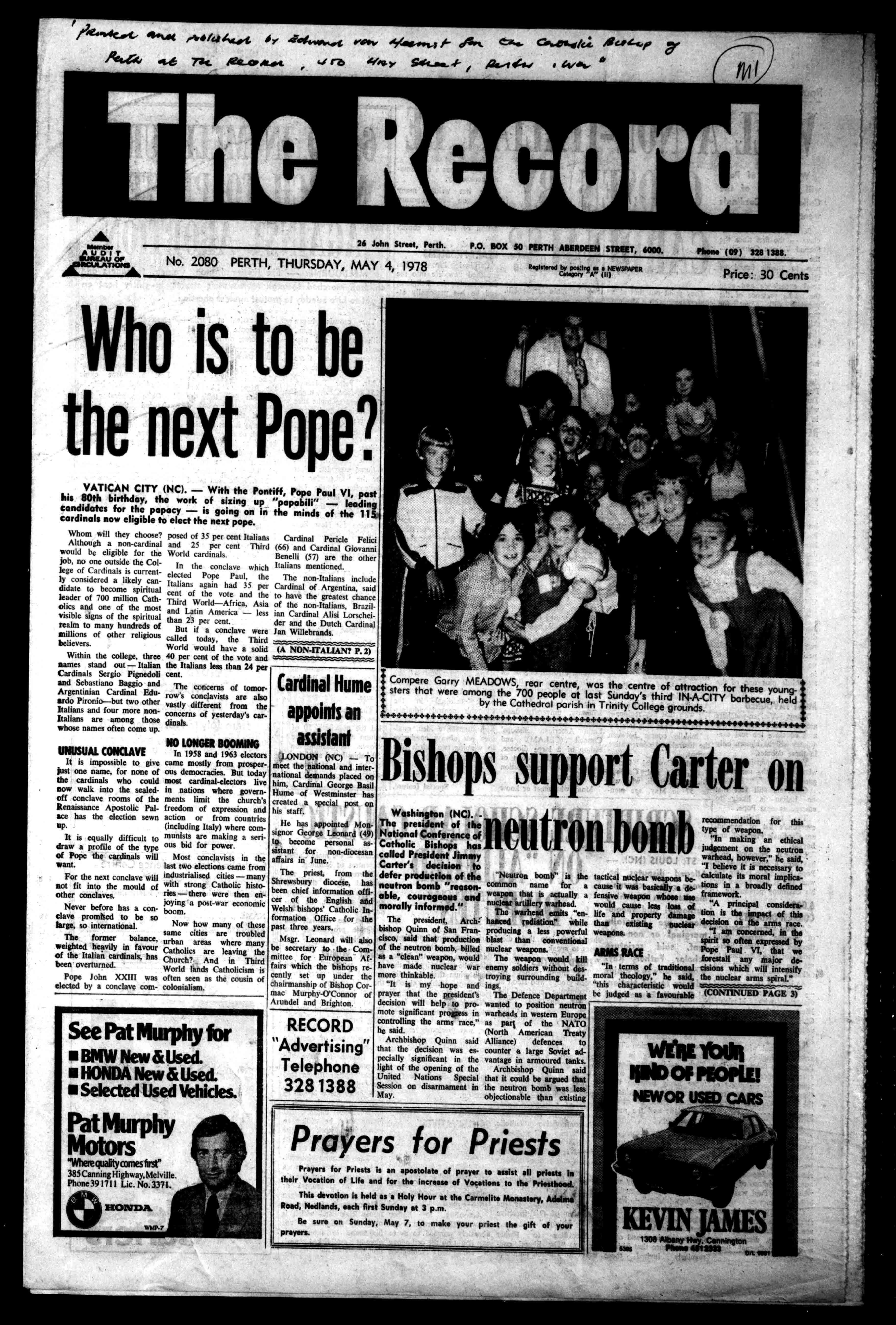 /34"*"Ci"C'4ftse 4Felvmr.,tvow /-Aft.e Ca 1V/,,1ficed-,79 ficea.1,.e ,c/mxycolk.sas..4- 41/401. 114I TheRecord Member ItIXE5s'll AINCULATIIONSA 26JohnStreet,Perth. P.O.BOX50PERTHABERDEENSTREET,6000. Phone(09)3281388. No.2080PERTH,THURSDAY,MAY4,1978 RegisteredbyposZinggaaNEWSPAPER Cetegory'A"(II) Price:30Cents Whoistobe thenextPope? VATICANCITY(NC).-WiththePontiff,PopePaulVI,past his80thbirthday,theworkofsizingup"popobili"-leading candidatesforthepapacy-isgoingoninthemindsofthe1110 cardinalsnoweligibletoelectthenextpope. Whomwilltheychoose? Althoughanon-cardinal wouldbeeligibleforthe job,nooneoutsidetheCollegeofCardinalsiscurrentlyconsideredalikelycandidatetobecomespiritual leaderof700millionCatholicsandoneofthemost visiblesignsofthespiritual realmtomanyhundredsof millionsofotherreligious believers. Withinthecollege,three namesstandout-Italian Cardinals