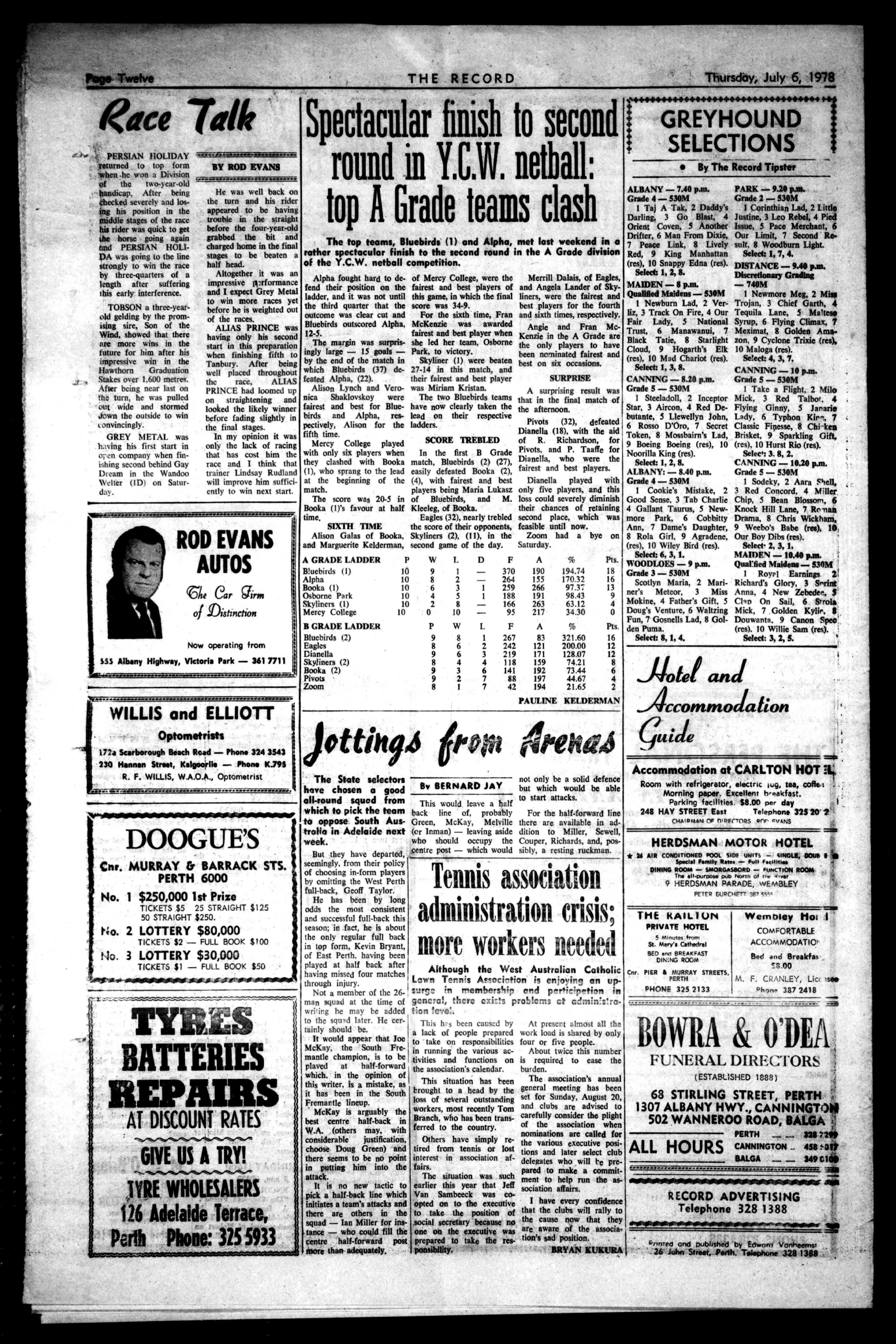 8GoldenAmazon,9CycloneTrixie(res), I()Maloga(res). Select:4,3,7. CANNING-10p.m. Grade5-530M TakeaFlight,2Milo Mick,3RedTalbot,4 FlyingGinny,5Jared, Lady,6TyphonKiri.,7 ClassicFinesse,8Chi-ken Brisket,9SparklingGift, (res),10HurstRio(res). Selec.:3.8,2. CANNING-10.20p.m. Grade5-53RM Sodeky,2AareShell, 3RedConcord,4Miller Chip,5BeanBlossor",6 KnockHillLane,7Reman Drama,8ChrisWickham, 9Weebo'sBabe(res),10 OurBoyDibs(res). Select.2,3,1. MAIDEN-10.40p.m. QualifiedMaidens-530M RoyrI Earnings2! Richard'sGlory,3Srrint Anna,4NewZebedee,S ChoOnSail,6Strola Mick,7GoldenKylir,8 Douwanta,9CanonSpec' (res).10WillieSam(res). Select:3,2,5. Ate!and ..Accommoclation aide AccommodationatCARLTONHOTILL. Roomwithrefrigerator,electrictag,tea,cat Morningpaper.Excellentbreakfast. Parkingfacilities$8.00perday 248HAYSTREETEast Telephone32520'2' CHAIRMANticnreFt-Toeseracvs,Ns Atpresentalmostallthe workloadissharedbyonly fourorfivepeople. Abouttwicethisnumber isrequiredtoeasethe burden. Theassociation'sannual generalmeetinghasbeen setforSunday,August20, andclubsareadvisedto carefullyconsidertheplight oftheassociationwhen nominationsarecalledfor thevariousexecutivepositionsandlaterselectclub delegateswhowillhepreparedtomakeacommitmenttohelpruntheassociationaffairs. Ihaveeveryconfidence thattheclubswillrallyto thecausenowthatthey areawareoftheassociation'ssadposition. BRYANKUKURA HERDSMANMOTORHOTEL *25AIRCONDITIONEDPOOLSIDFuwis-KINDLE,pouta SpacialFamilyRates-FullFeellIlles DININGROOM-SMORGASBORD-FupacttONROOM TheallDurpOsaart.Ncgtnel 4.ver 9HERDSMANPARADE,WEMBLEY PETERSURCHFTTstovs" THEKAIL1ON PRIVATEHOTEL Mink,05.,,, St.Atery'sCathedral BEDen,BREAKFAST DIK.NGROOM Cnr.PIER&MURRAYSTREETS, PERTH PHONE3252133 WemoleyHo, COMFORTABLE ACCOmmODATIC BedandSreakfa !Arm M.F.CI:ANLEY,Licsee Nino.3872418 BOWRA&O'DEA FUNERALDIRECTORS (ESTABLISHED1888) 63STIRLINGSTREET,PERTH 1307ALBANYHWY.,CANNINGT'M 502WANNER00ROAD,BALGA!! PERTH 328:290 CANNINGTON 458'317 BALGA-349Clop 0000,0000000.0~~~~,n,-no RECORDADVERTISING Telephone3281388 6,,nredandpublishedbyEcTworoVonheerns, 26JohnStreet,Perth.Telephone32B1388 ALLHOURS