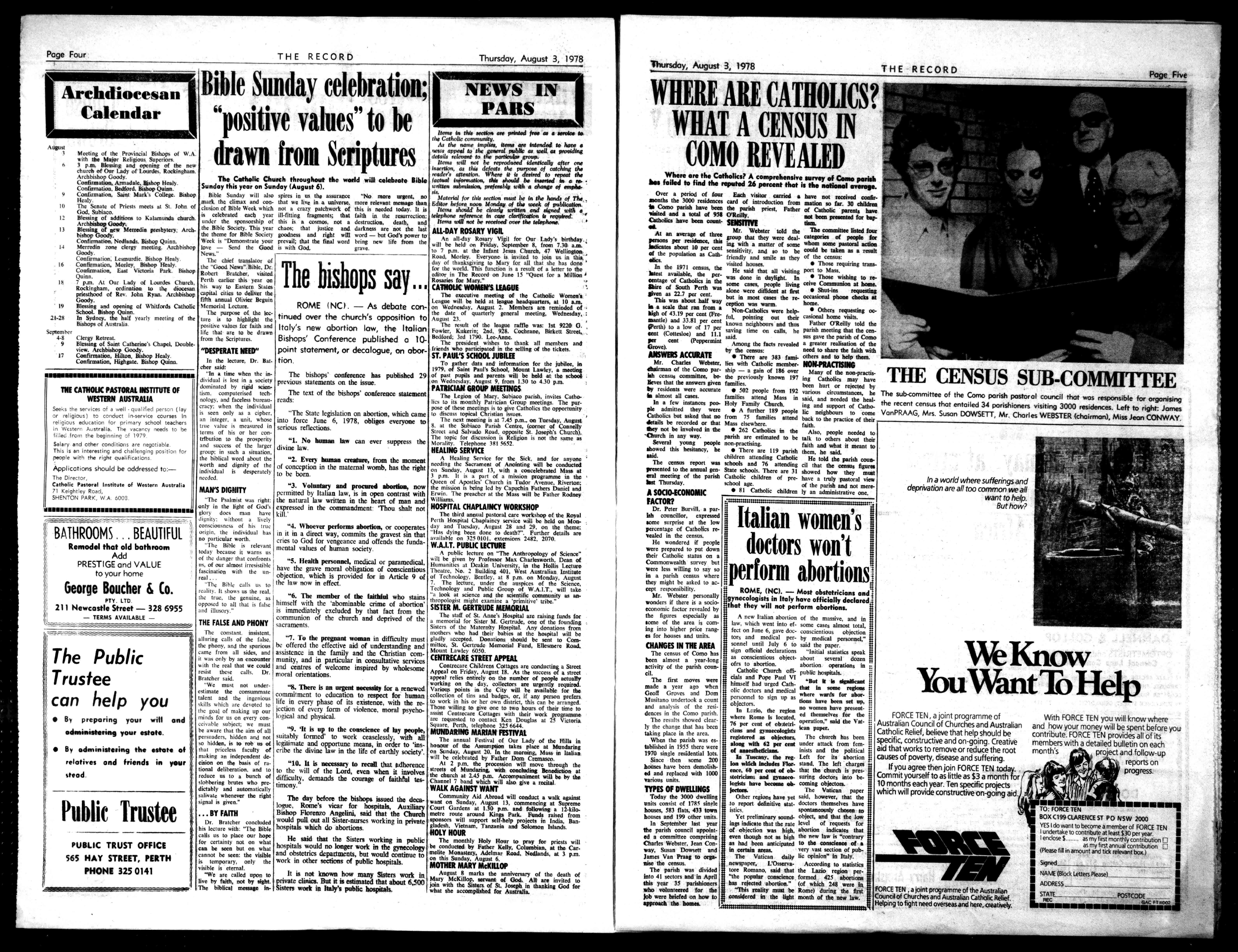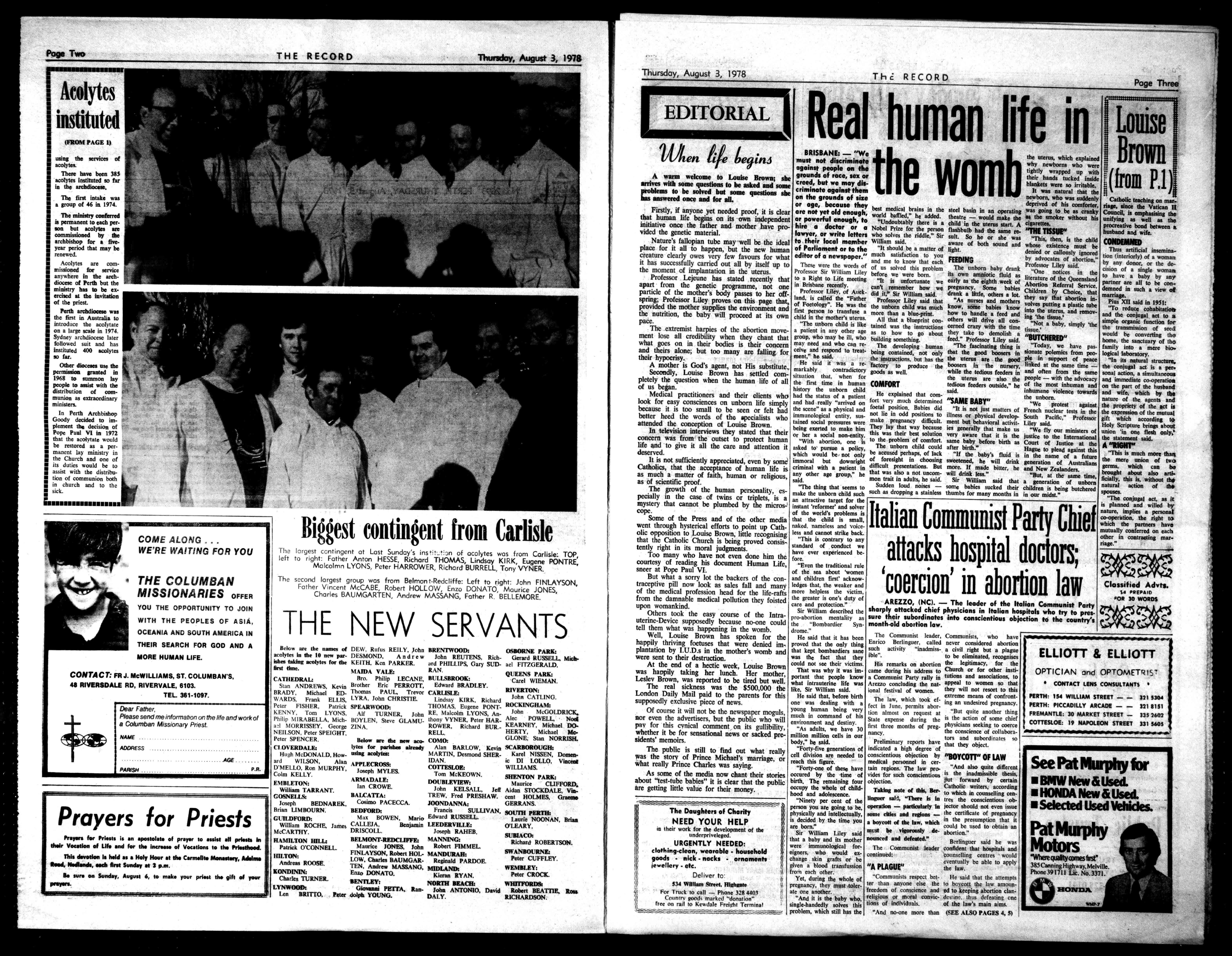 TheRecord e:T EA1J T1ONS 26JohnStreet,Perth. P.O.BOX50PERTHABERDEENSTR Phone(09)3281388. RegHaredbyFosZing NEWSPAMI \ cit..), (II) 78219 No.2093PERTH,THURSDAY,August3,1978 Alh, Price:30Cents 1 W ACOLYTES 111111111111111, PicturedatleftisthesceneinSaintI Mary'sCathedrallastSundaywhen102 menwaitedtobeinstitutedacolytesby ArchbishopGoody. Thecathedralwas packedwithrelatives, friendsandparishioners attheafternoonMass duringwhichtheceremonytookplace. Candidatesapproached thealtaringroupsof eightandplacedtheir handsonthechalice andpatenastheArchbishopinstitutedthemas ministersatthealtar. Toprepareforthe institution, candidates attendedthreetraining nightsatTrinityCollege followedbyaweekend retreatatIonaPresentationCollege. I TenparisheswereSI presentingcandidatesfor thefirsttimeatlast Sunday'sceremony;there arenow75parishes U (CONTINUEDP.2) SI 111111111011111111111111111111111111111M11111110111111111111111111111111111111102 TBEWIEST10111SMINDBy Catholicmoralopinionappearstobetakingawait-and-seeapproachtotheprocess