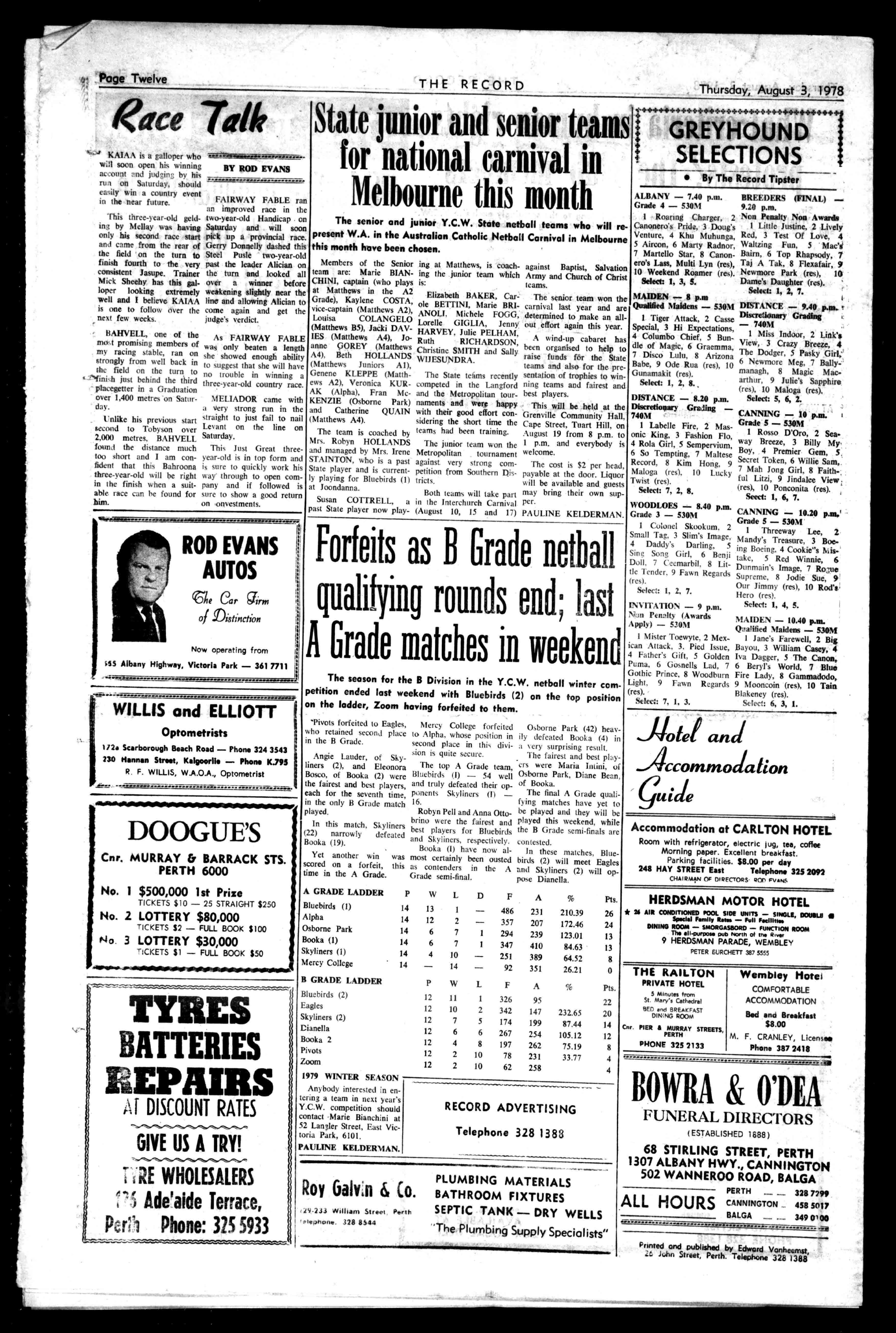 iloteland Accommodation recta AccommodationatCARLTONHOTEL Roomwithrefrigerator,electriclug,tea,coffee Morningpaper.Excellentbreakfast. Parkingfacilities.$8.00perday 248HAYSTREETEast Telephone3252092 CHAIRMANOrDIRECTORSRODeVANS F A Pls. HERDSMANMOTORHOTEL 486 357 294 347 251 92 P W L F 12 12 12 12 12 12 12 11 10 7 6 4 2 2 1 2 5 6 8 10 10 326 342 174 267 197 78 62 231 207 239 410 389 351 210.39 172.46 123.01 84.63 64.52 26.21 26 24 13 13 A Pts. 95 147 199 254 262 231 258 232.65 87.44 105.12 75.19 33.77 22 20 14 12 8 4 4 RECORDADVERTISING Telephone328138?, RoyGaly,n&Co. .45.233WilliamStritet. rielehone.3288544 PLUMBINGMATERIALS BATHROOMFIXTURES SEPTICTANK-DRYWELLS 'ThePlumbingSupplySpecialists" *21IAIRCONDITIONEDPOOLSIDEUNITS-SINGLE,DOUIILII SpecialFamilyR.hs-FullFacilities DININGROOM-SMORGASBORD-FUNCTIONROOM ThealliourpoiRubNcrthAltn.River 9HERDSMANPARADE,wEMBLEV PETEREURCHETT3875555 a THERAILTON PRIVATEHOTEL aZrye"""St. Bran Cathedral BEDendBREAKFAST DIN:NOROOM Car.PIER11MURRAYSTREETS, PERTH PHONE3252133 WembleyMotet COMFORTABLE ACCOMMODATION BedandBreakfast $8.00 M.F.CRANLEY,Licenses Phone3872418 .111., BOWRA&O'DEA FUNERALDIRECTORS (ESTABLISHED1688) 68STIRLINGSTREET,PERTH 1307ALBANYHWY.,CANNINGTON 502WANNER00ROAD,BALGA ALLHOURS PERTH CANNINGTON BALGA 3287299 4585017 3490,00 PrintedandpublishedbyEdwardVonheemst, J..,hriStreet,Perth.Telephone32b1388