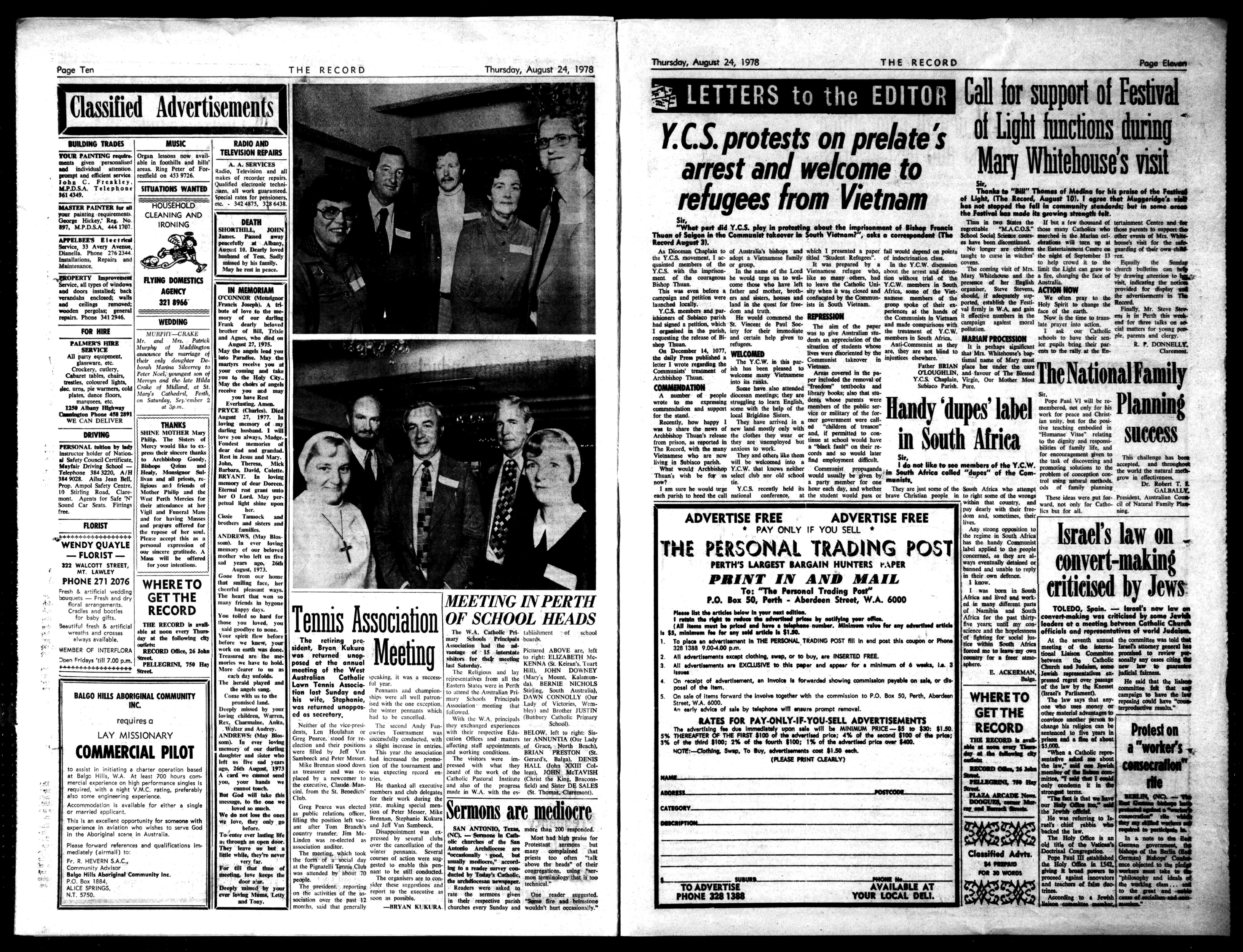 donoliketoseemembersoftheY.C.W. now? Thuan'swishbeforusselectclubnoroldschoolwouldusuallybegivenby ,_,,_ WhatwouldArchbishopY.C.W.thatknowsneitherCommunistpropaganda southAfrk.,,,,,,,wd w 0fi,co tie. apartymemberforone op..p pCons-F.FrootLlin:fot.scoo°,,,,Lific:Tor,...o:c000dh:t.the Cnaoturbonal thetaskofdisco.s.erin,gand ,thou growmeffecuseness. GALBALLY. emitparishtoheedthemillnational conference, attheMudgetwouldpassorSm.Christi.)Peopleintorights..ofthesamosa mooideaswerepotfor-Presid.ent.AustralianComa emsurehewouldurge Y.CS.recentlyhelditshoureachday,andwhetherTheyarejustsomeoftheSouthAfricawhoattemptoilsoffamilyplanning withinmatcountry,MIward,notonlyforCatho-cilofNaturalFamilyPitt reydearlywiththeirfree-ticsbanforall. tying. donsandsometimes,their lives. ADVERTISEFREE ADVERTISEFREE PAYONLYIFYOUSELL* THEPERSONALTRADlislf.3POST PERTH'SLARGESTBARGAINHUNTERSt.%PER PRINTINANDMAIL To:"ThePersonalTradingPost" P.O.BoxSO,Perth-AberdeenStreet,WA.6000 PlasmlisttheanklesMimeInyearnextedition. webtherigigstereducethead...deedpekoebynotifyingyourelm. (AllItemsmustbepricedandhereatelephonenumber.Minimumvalueforanyadvertisedamide II$5,minim.feefeeanysoldankleIs$1.50. 1, ToplaceanadvertlementInTHEPERSONALTRADINGPOST61)InendpostthiscouponorPhone 32813539034.00p.m. 2.Alladvertisementsweptclothing,swap,letobuy,areINSERTEDFREE. 3.AllmivarthernentsereEXCLUSIVEtothlepaperandweerforminimumof6weeks,in. Issues 4. Onreceiptofadvertisement,anInvoiceIsferwardedshowingomminittnpambleonsale,ordl. poseoftheBern. 5 OnsaleofitemsforwardtheInvolvetogetherwishthecommissiontoP.O.Box50,Perth,Aberdeen Street,WA.60110. anany*dolesofsalebyNinth°awillmanPrompt.moved. RATESFORPAY-ONLY-IF-YOU-SELLADVERTISEMENTS TheadvertisingfeedueimmedlatelyuponsalewillbeMINIMUMPRICE-$5en530:01.50. 5%THEREAFTEROFTHEFIRST$100oftheadvertisedprim;4%ofthesecondMODofthePd.; 3%ofthethlrd$110;2%ofthefourth$100;1%oftheadvertisedpriceaverWO. NOTE,--ClothIng,Swap.Toguy,edverthementscostPAO.soh. (PLEASEPRINTCLEARLY) KW ADORESS--CATEGORY IMICRIPT 5- SUBURB- Na_PHONE TOADVERTISE AVAILABLEAT PHONE3281388 YOURLOCALDELI. Anystrongoppositionto the irtSouthAfrica basthehandyCommunist labelappliedtothePeon]e concerned,astheyarealwayseventuallydetainedor bannedandunabletoreply' intheirowndefence. Iknow. wasbornioS01912 Africaandlivedandworkedinteenydiffermtparts NamibiaandSouth Africaformepastthirty. fiveyears:untilmyconscknceandthehopelessness offightingforsocialjusticewithinSmoltAfrica forcedmetoleavemyown comstryforafreeratmonbere. E.ACKERMAN, Balla.