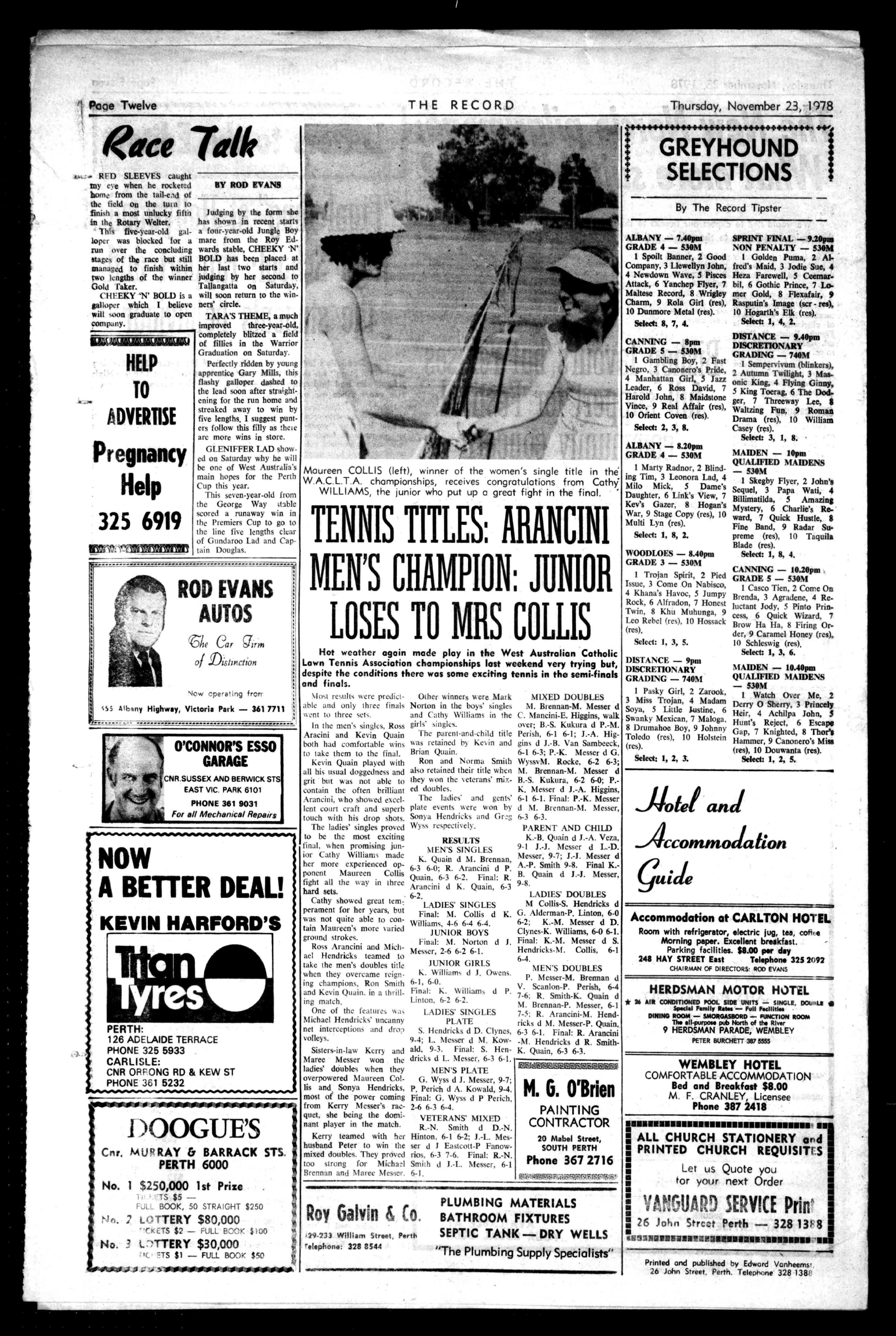 10.40pm QUALIFIEDMAIDENS -530M IWatchOverMe,2 Derry0Sherry,3Princely Heir,4AchilpaJohn,5 Hunt'sReject,6Escape Gap,7Knighted,8Thor's Hammer,9Canonero'sMin (res),10Douwanta(res). Select:I,2,5. -.11otetand Accommodation side AccommodationatCARLTONHOTEL Roomwithrefrigerator,electricjug,tea,cot'-e Morningpaper.Excellent breakfast. Parkingfacilities.$8.00perday 248HAYSTREETEast Telephone32521,92 CHAIRMANOFDIRECTORS.RODEVANS HERDSMANMOTORHOTEL **".AIRCONDITIONEDPOOLSIDEUNITS-SINGLE.DOS-LI SveclalfamilyRates-fullfullitles DININGROOM-SMORGASBORD-FUNCTIONROOM Theell-purposepubNorthoftheRiver 9HERDSMANPARADE,WEMBLEY PETERBURCHETT3875555 WEMBLEYHOTEL COMFORTABLEACCOMMODATION BedandBreakfast$8.00 M.F.CRANLEY,Licensee Phone3872418 111111111111111MMINIMMIIIIMIIIIIMM1111 III ALLCHURCHSTATIONERYaid PRINTEDCHURCHREQUISITISi LetusQuoteyou : a e toryournextOrder a VA!!!MIDSERVICEPrin .1, 26.h.)).1StreetPerth-32813,8 oilINGIIIIIMINFP.ZIMIIIIIIIIIII111111111M11111OBI PrintedandpublishedbyEdwardVonheems 26JohnStreet.Perth.Teleon.ne328138; .01SaiNextoolo~vicessiozok MN*