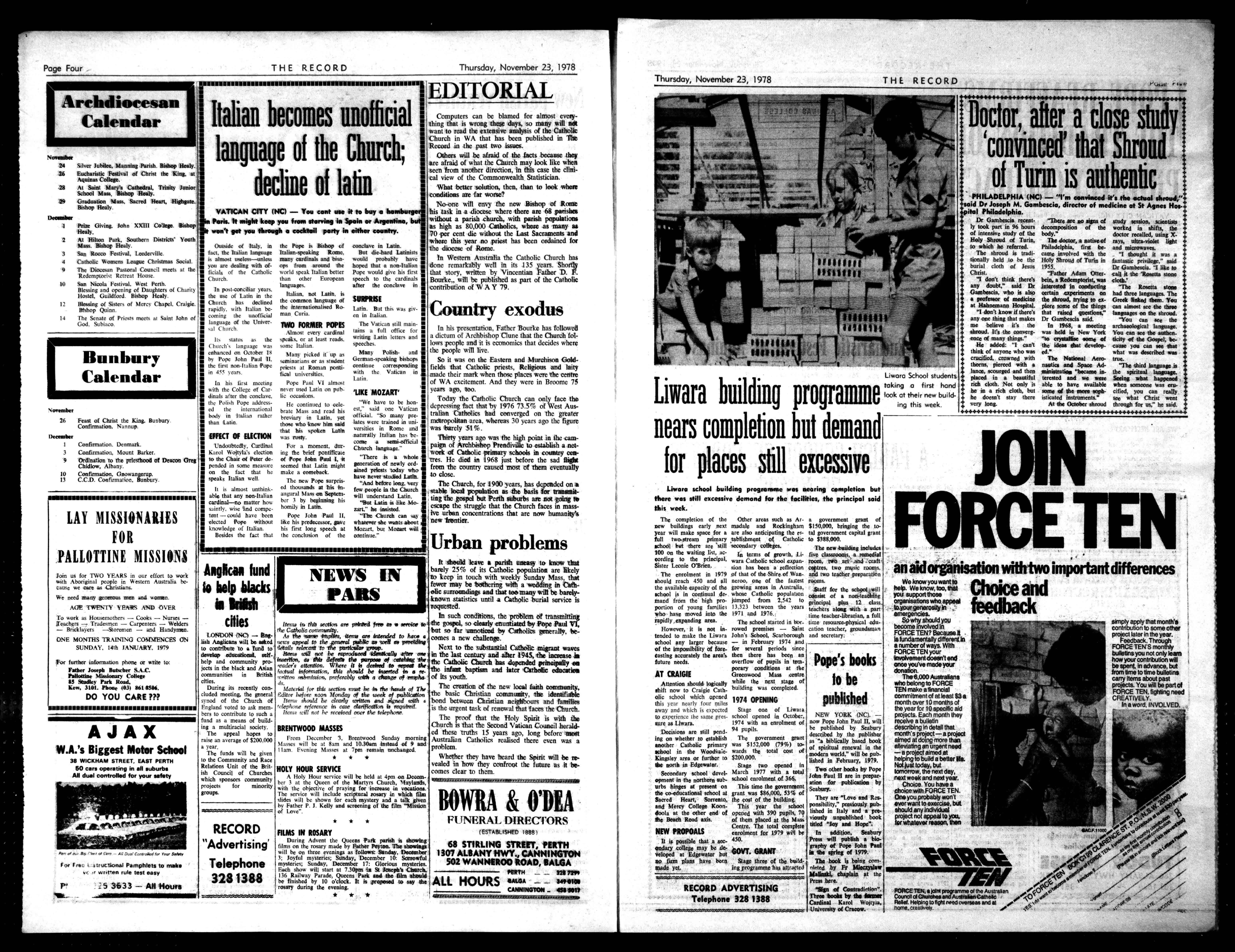 $70,000toacquirethenineacresiteonthecornerof SouthernRiverRoadand CorffeldStreettowhichall thechurchandsChoolpremiseswillnowhemoved: Astartwillbemadeon StageThreeoftheschool shortlyandin1979itisintendedtopressonwitha requestforgovernmentsupportsothattheschoolcan bebroughtuptoafulltwostreamprimaryschoolto meettheneedsofwhatisa fastgrowingparishand suburb. ENROLMENT;REUNION Thecurrentenrolmentis 223andisexpectedtobe 270studentsin1979. Theschoolisunderthe directionofMrB.Bankervinewhoisassistedbya staffoftenincludingone SisterofMercy. TheschoolofSaintMunchin,apatronsaintofLimerick,Ireland,is25years oldthisyearandajubilee re-unionwasheldearlierbishop,DrGoody,perform. thismonth, ingtheceremonyonJeanneoriginalschoolopen-ary25. edonAlbanyHighwayin Sixtypupilswereonhand 1953,thethenauxiliary(CONTINUEDPAGE2) Put Town&Country onyour shoppinglist... ...&earnhigherinterest onyoursavings Town&CountryisAustralia',5thlar7,est buildingsocietywithassetsnow exceeding$300,000,000. HEADOFFICE:BUILDINGSOCIETYHOU, 297-305MURRAYST.PERTH. OP
