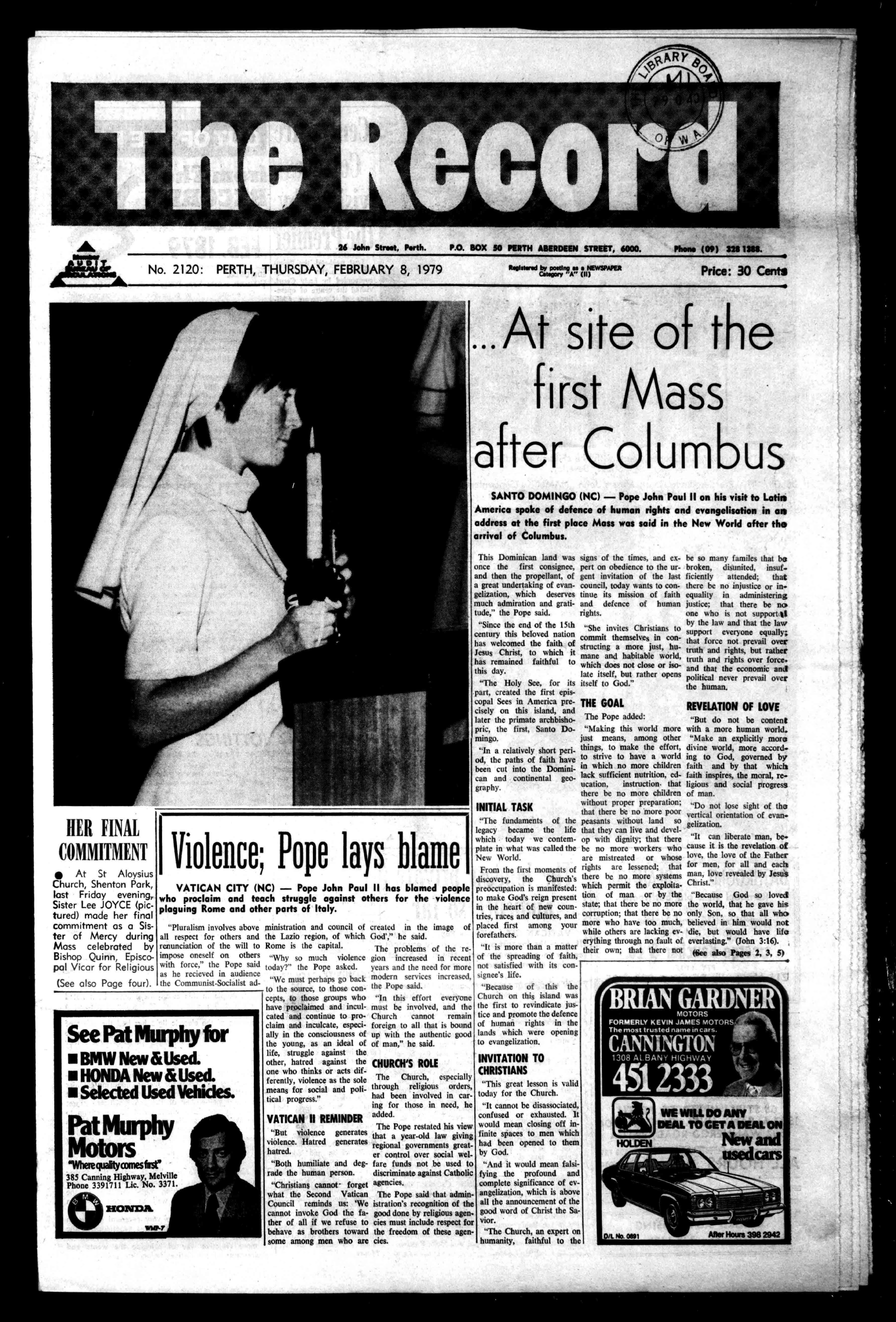 StAloysius Church,ShentonPark, lastFridayevening, SisterLeeJOYCE(pictured)madeherfinal commitmentasaSisterofMercyduring Masscelebratedby BishopQuinn,EpiscopolVicarforReligious (SeealsoPagefour). ...Atsiteofthe firstMass afterColumbus SANTODOMINGO(NC)-PopeJohnPaulIIonhisvisittoLatino Americaspokeofdefenceofhumanrightsandevangelisationinas addressatthefirstplaceMosswassaidintheNewWorldafterthe arrivalofColumbus.