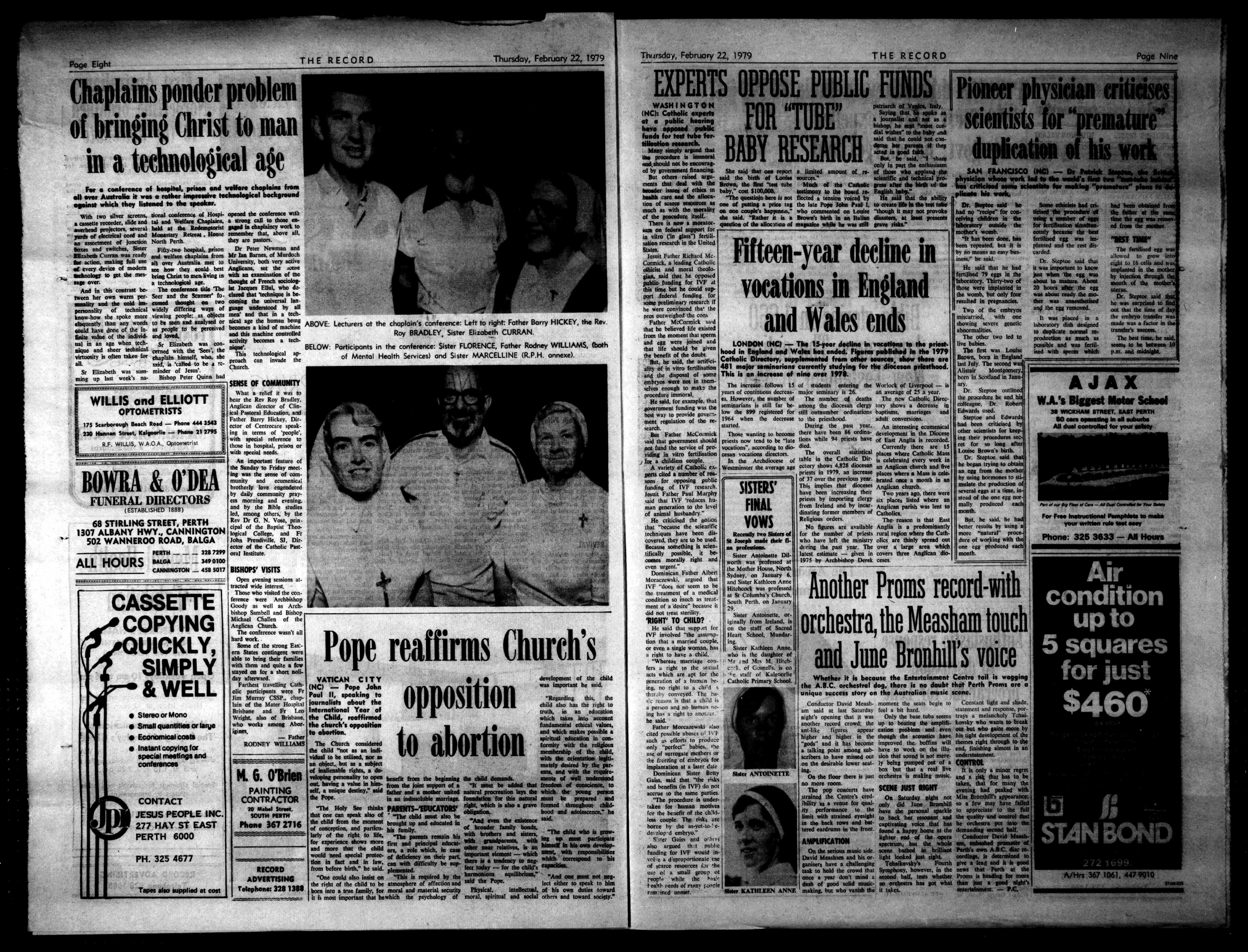 k.. \ y9ri V54 TheRecord 24JohnStreet,Perth. AimNo.21222PERTH,THURSDAY,FEBRUARY22,1979 P.O.BOXSOPERTHABERDEENSTREET,4000. Phone(OR)32111,41. Reelsredbypaean!eseNEWSPAPER CatPwY'A"(II) Price:30Cents DOGSmoveonananti-Churc ThemilitantDOGS (DefenceofGovernmentSchools)Council ofVictoriaistryingto involveWAParents andCitizensgroupsin itsanti-ChurchHigh Courtchallengenext month. Letterstoeverylocal groupareaskingfor$200 or$100towardsthecost ofthelegalaction. TheVictoriangroupthat ispleadingthecase,having takentherisk,arenowadvertisingthattheyareliableforcostsshouldthey lose. Theysaytheymayneed another$150,000inadditiontothe$100.000raised HighCourtaction sofar. InitslettertheCouncil admitsthatthemove,ostensiblyagainstthefunding ofprivatereligiousschools. islinkedtoachallengeon the"establishmentofreligion"section(116)ofInc AustralianConstitution. TheactionhashadR. clearfirstthedeskofInc VictorianAttorney-General beforeitcouldbelistedto SeePatMurphyfor BMWNew&Used. HONDANew&Used. SelectedUsed*hides. PatMurphy Motors "Whatquaktycomesfish' 385CanningHighway,Melville Phone3391711Lic.No.3371. HONDA. VIMP-T