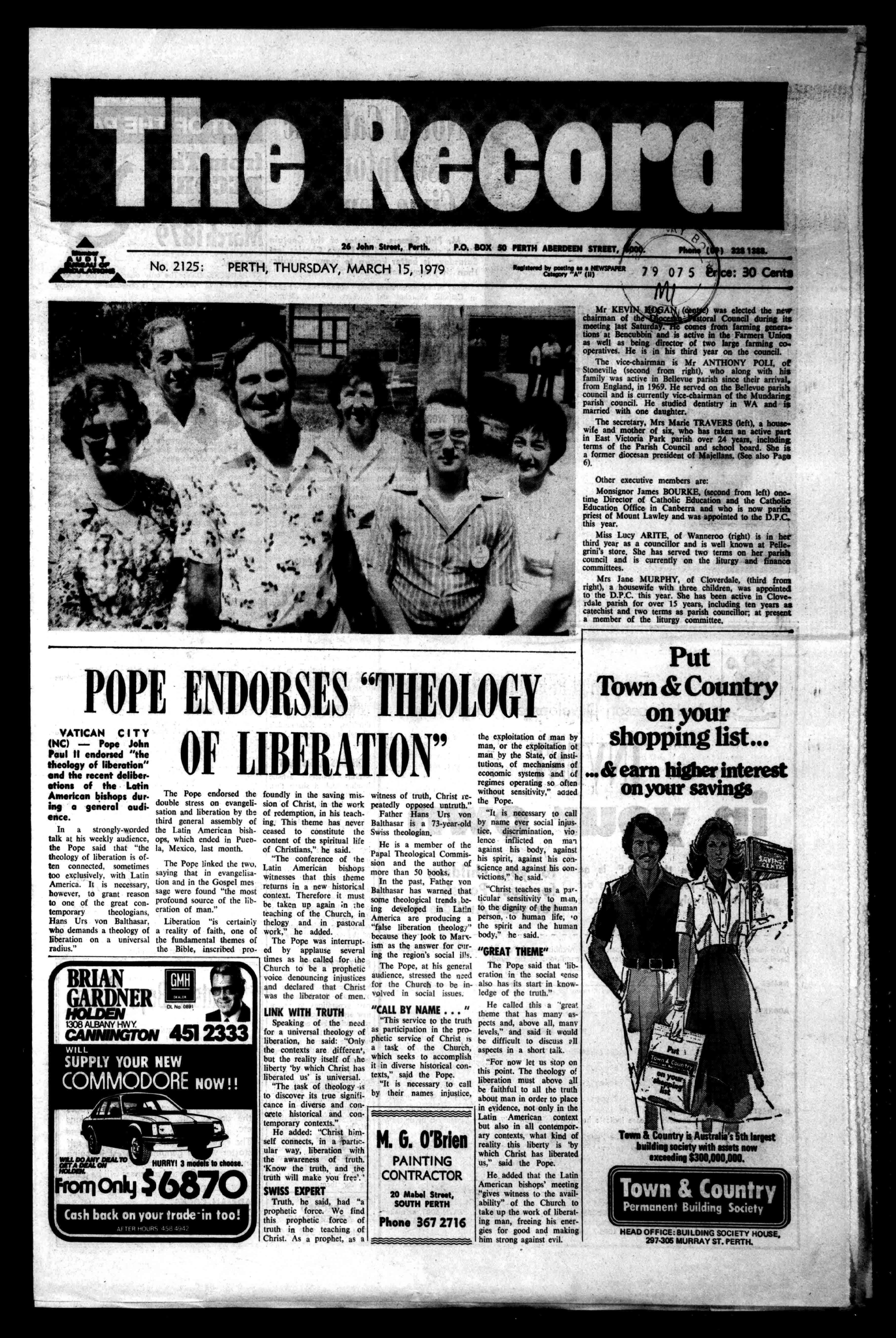 26JohnStreet,Perth. P.O.BOX50PERTHABERDEENSTRUT, )32$ Siewew a %I0jr No.2125: PERTH,THURSDAY,MARCH15,1979 neamsrsdbyposting NEWSPAPER 79075Or :30Cents Category (II) POPEENDORSES"THEOLOGY VATICANCITY 99 (NC)-PopeJohn PaulIIendorsed"the theologyofliberation" andtherecentdeliberationsoftheLatin Americanbishopsduringogeneralaudience. In a strongly-worded talkathisweeklyaudience, thePopesaidthat"the theologyofliberationisoftenconnected,sometimes tooexclusively,withLatin America.Itisnecessary, however,tograntreason tooneofthegreatcontemporary theologians, HansUrsvonBalthasar, whodemandsatheologyof liberationonauniversal radius." OFLIBERATION ThePopeendorsedthe doublestressonevangelisationandliberationbythe thirdgeneralassemblyof theLatinAmericanbishops,whichendedinPoenla,Mexico,lastmonth. ThePopelinkedthetwo. sayingthatinevangelisationandintheGospelmes sagewerefound"themost profoundsourceoftheliberationofman." Liberation"iscertainiy arealityoffaith,oneof thefundamentalthemesof theBible,inscribedproBRIAN GMH GARDNER HOLDEN 1308ALBANY Hia