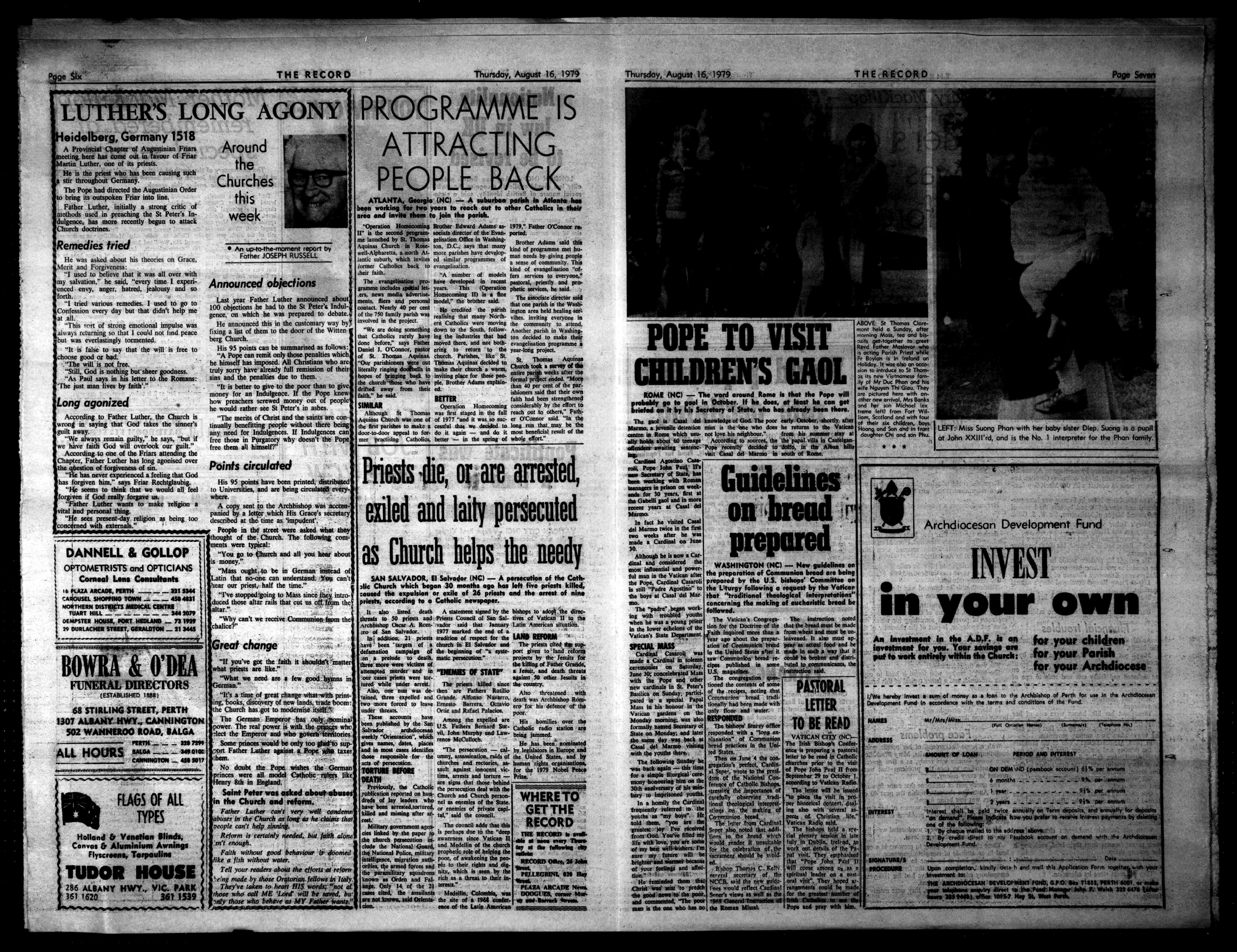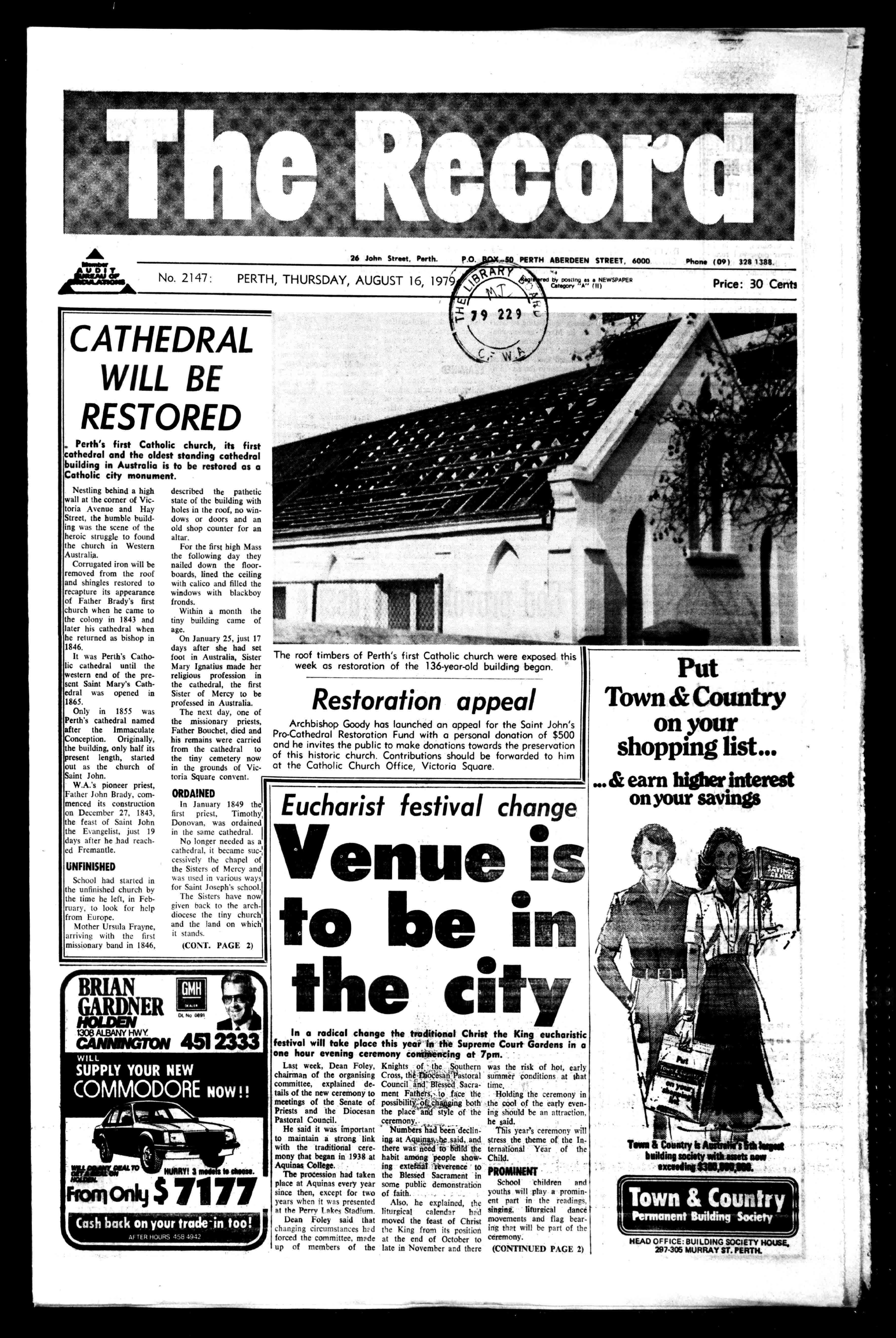 itstands.(CONT.PAGE2) ioNswootciwi. P.O. PERTHABERDEENSTREET,6000 Phone109132$13511. ix postingasaNEWSPAPER C.ategoev"A"(II) TherooftimbersofPerth'sfirstCatholicchurchwereexposedthis asrestorationofthe136-year-oldbuildingbegan. Restorationappeal ArchbishopGoodyhaslaunchedanappealfortheSaintJohn's Pro-CathedralRestorationFundwithapersonaldonationof$500 andheinvitesthepublictomakedonationstowardsthepreservation ofthishistoricchurch.Contributionsshouldbeforwardedtohim attheCatholicChurchOffice,VictoriaSquare. BRIAN GMH GARDNER.7.; HOLDEN 1308ALBANY 4.512333 WILL SUPPLYYOURNEW COMMODORENOW!! fir 1011 FronlOnlY (ashbackonyourtrade-intoo! t Eucharistfestivalchange nueis bein thecis Price30Cents InaradicalchangethetraditionalChristtheKingeucharistic festivalwilltakeplacethisyearintheSupremeCourtGardensina onehoureveningceremonyconthleneingat7pm. Lastweek,DeanFoley, chairmanoftheorganising committee,explaineddetailsofthenewceremonyto meetingsoftheSenateof PriestsandtheDiocesan PastoralCouncil. Hesaiditwasimportant tomaintainastronglink withthetraditionalceremonythatbeganin1938at AquinasCollege. Theprocessionhadtaken placeatAquinaseveryyear sincethen,exceptfortwo yearswhenitwaspresented atthePerryI.ekesStadium. DeanFoleysaidthat changingcircumstancesbed forcedthecommittee,made upofmembersofthe Knightsof-the uthern Cross,thi,r1W6San'pastoral CouncilifnirlifresFeit,SacramentFati ft(cethe possibilie both theplacean eofthe ceremony.. NumbersluaixendecliningatAckujaw4e.said,and therewasneedtoiidIrdthe habitamen&peopleshowingexteilliallevereneeto theBlessedSacramentin somepublicdemonstration offaith. Also,heexplained,the liturgical calendar he'd movedthefeastofChrist theKingfromitsposition attheendofOctoberto lateinNovemberandthere wastheriskofhot,early summerconditionsatthat lime, HoMingtheceremonyin -thecooloftheearlyeveningshouldbeanattraction, hesaid. Thisyear'sceremonywill stressthethemeortheInternationalYearofthe Child. PROMINEW Schoolchildren and youthswillplayaprominentpartinthereadings. singing,liturgicaldance movementsandflagbearingthatwillbepartofthe ceremony. (CONTINUEDPAGE2) Put Town&Country onyour shoppinglist... earnhigherinterest onyoursavings Uwe&Coestryh by buildingmistysyskkanstsases Ixossdielakingt Town&Country PermanentBuildingSociety 11 HEADOFFICE:BUILDINGSOCIETYHOUSE. W-306MURRAYST.PERTH.
