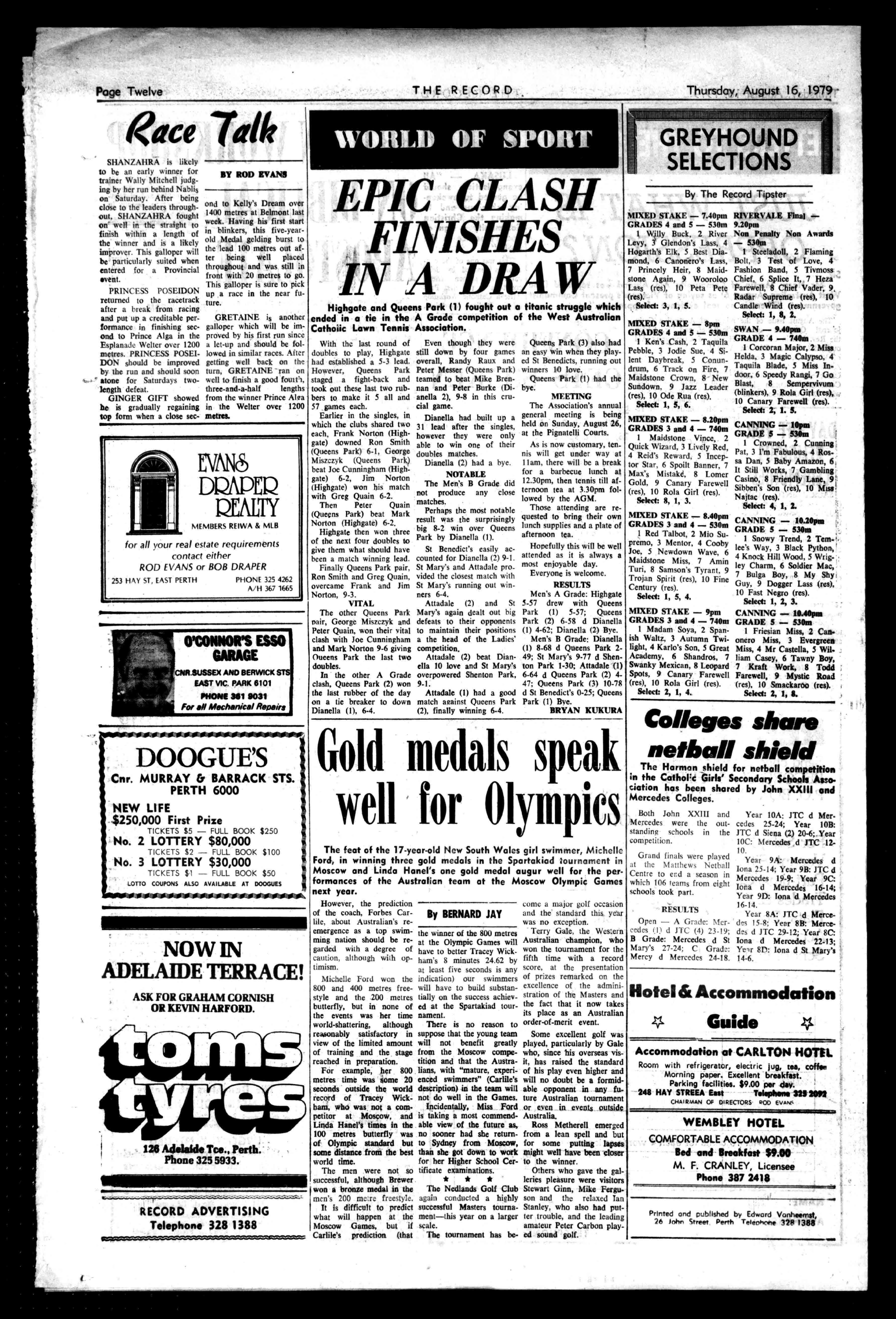 PageTwelve THERECORD Thursday,August16,1979 RaceTgfif) SHANZAHRAislikely tobeanearlywinnerfor trainerWallyMitchelljudgingbyherrunbehindNablis onSaturday.Afterbeing closetotheleadersthroughout.SHANZAHRAfought on'wellinthestraightto finishwithinalengthof thewinnerandisalikely improver.Thisgalloperwill beparticularlysuitedwhen enteredforaProvincial event. PR1N(FSSPOSEIDON returnedtotheracetrack afterabreakfromracing andputupacreditableperformanceinfinishingsecondtoPrinceAlgainthe EsplanadeWelterover1200 metres.PRINCESSPOSEIDONshouldbeimproved bytherunandshouldsoon atoneforSaturdaystwolengthdefeat. GINGERGIFTshowed beisgraduallyregaining topformwhenaclosesecITRODEVANS andtoKelly'sDreamover 1400metresatBelmontlast week.Havinghisfirststart inblinkers,thisfive-yearoldMedalgeldingburstto thelead100metresoutafterbeingwellplaced throughoutandwasstillin frontwith20metrestogo. Thisgalloperissuretopick uparaceinthenearfuture. GRETAINEisanother galloperwhichwillbeimprovedbyhisfirstrunsince alet-upandshouldbefollowedinsimilarraces.After gettingwellbackonthe turn,GRETAINE-ranon welltofinishagoodtowel, three-and-a-half lengths fromthewinnerPrinceAlva intheWelterover1200 metres. EVP DI:2AIDEQ LZALTY MEMBERSREIWA&MIS forallyourrealestaterequirements contacteither RODEVANSorBOBDRAPER 253H55ST,EASTPERTH PHONE3254262 A/H3671665 SUSSEXANDBERWICK EASTVIC.PARK6101 DOOGUE'S Cnr.MURRAY&BARRACKSTS. PERTH6000 NEWLIFE $250,000FirstPrize TICKETS55 FULLBOOK$250 No.2LOTTERY$80,000 TICKETSS' FULLBOOK$100 -No.3LOTTERY$30,000 TICKETS$1--FULLBOOK$50 LOTTOCOUPONSALSOAVAILABLEAT0000UES NOWIN ADELAIDETERRACE! ASKFORGRAHAMCORNISH ORKEVINHARFORD. tMS tyres 128AdelaideToe.,Perth. Phone3255933. ' kA 1111111.111111111M1111111111111111111 RECORDADVERTISING Telephone3281388 WORLDOFSPORT EPICCLASH FINISHES INADRAW HighgateandQueensPark(1)foughtoutatitanicstrugglewhich endedinatieintheAGradecompetitionoftheWestAustralian CatholicLawnTennisAssociation. Withthelastroundof doublestoplay.Highgate hadestablishedit5-3lead. However,Queens Park stageda fight-backand tookouttheselasttworubberstomakeit5alland 57gameseach. Earlierinthesingles,in whichtheclubssharedtwo each,FrankNorton(Highgate)downedRonSmith (QueensPark)6-1,George Miszczyk(QueensPark) beatJoeCunningham(Highgate)6-2,JimNorton (Highgate)wonhismatch withGregQuain6-2. Then Peter Quain (QueensPark)beatMark Norton(Highgate)6-2.