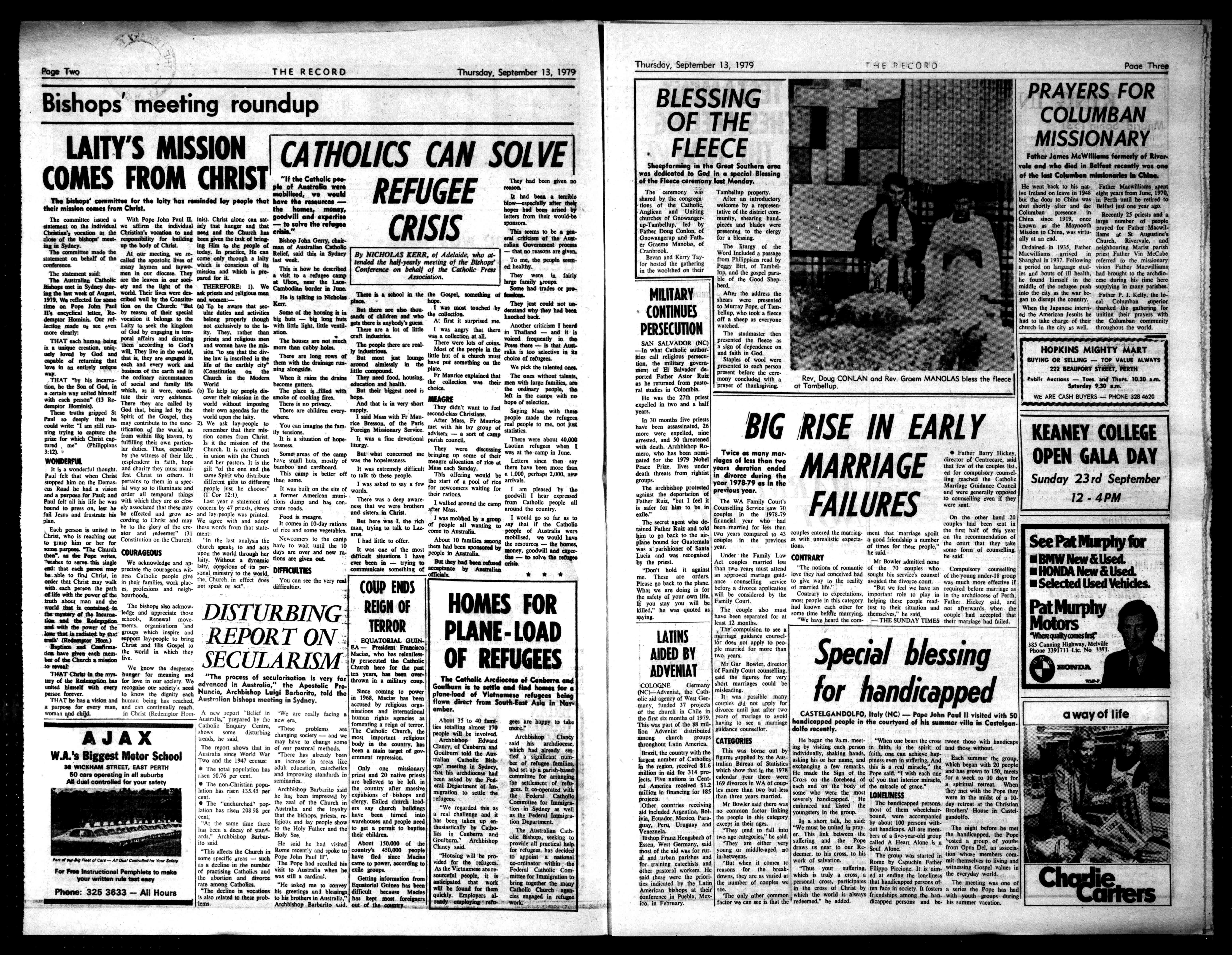 to40fun. geearehappytotake liestotallingalma.170 Peoplewillbeinvolved. Archhisithp Edward Clancy.ofCanberraand Gou/burntoldtheMrs treeCatholicebb oththmeta..jeSydney, athisarchthottsehad beenaskedbytheFedoralDepartmentoflinmigrationtosettlethe refugees. "Wtregardedthisal realchallengeandit hesbeentakenupen. thusiasticallybyCadetlesinCanberraand Goulburn,"Archbishop Clancysaid. "Housingwillbeprovidedfortherefugee. AstheVictemesearcre...duiMonk.e thatwork nilhefoundfoethan quickly.Employesal. etPheYetNanArchbishop Clancy saidhisarchdiocese, whichhadalreadysettledasignificaatnum betofrefusoofamiliq hadutupaparisb-bmed commute,forarranging thesettlementofestegees.Itco-operatedwith theFederalCatholic ConsetteeforMalign. lioninSydneyaswell astheFederalemigre, tionDepartment. TheAustralianCath. uricBishops.seekingto provideallpracticalhelp forrefugees,hasdecide toappointanational co-ordinatorwithinthe FederalCatholicCommittee thatierataanan theetogetherthetwo CatholicChurchas. ciesengagedinrefugee Thursday,September13,1979 RECORD Por,Three BLESSING OFTHE FLEECE SheepfarrningintheGreatSouthernarea wasdedicatedtoGadinaspecialBlessing oftheFleececeremonylathMonday. Thememo.was oedbythecongregaoftheCiitholic, AnglicanandUniting churchesofGnowanger. up-Tambellup.ledby FatherDougConlon,of GnowangerupandFatherGreeneMantas,of Cranbrook. BevanandKerryTay lorhostedthegathering inthewoolshedontheir MILITARY CONTINUES PERSECUTION SANSALVADOR(NC) -InwhatCatholicauthoritiescallreligiousperm.lion,themilitarygovernmentofElSalvadorde. portedFatherAstorRuiz ashereturnedfrompastoralstudiesinColombia. Hewasthe27thmust expelledinheandhalf years. InJOmonthsfivepriests havebeeassassinated,16 morewereexpelled,nine arrested,and50threatened whitdeath.ArchbishopRomero.whofairbeennominatedforthe1979Nobel PeacePrize,livesunder deaththreatsfromrightist Thearchbishopprotested againstthe dePorthdretof FatherRuiz.,"butIfeelit issaferforhimtobein Tambellupprointmrty. Afteran roductory welcomebyareprescn. naiveofthedistrictcommunity,shearinshandNecesandbladeswere presentedtotheclergy forablessing. Theliturgyofthe WordIncludedapassage fromPhilippiansreadby PeggyBin,ofTanbel. lup,andthegospelpara. bleoftheGoodShepherd, AfterISOaddressthe shearswerepresented toMurrayPope,ofTam. NEN,whotookafleece offasheepaseveryone watched Thestudinarterthen presentedthefleeceas on signof anddependencea faithinGod. Staplesofwoolwere presentedtoeachmeson presentbeforethecere. pre concludedwitha prayerofthanksgiving. ThesecretagentwhodetainedFatherRuizandtold himtogobacktotheairManeboundtotGuatemala eas parishionerofSanta Luciaandwasrwognised bytheovert. "Don'tholditagainst me.Theseareorders. Pleasegobacktotheplam. Matweeredoinge fen thesafetyadyourown Ifyoustayyouwillbe killed,-bewasgeedas sayins. 0011.7471.14,CONLANandRev.GrovelMANOLASblessthefleeceI BIGRISEINEARLY Twiceasmanymaryearsdurationended Hag.oflessthantwo MARRIAGE indivorceduring year1978-79asinthe previousyear. TheWAFamilyCoon's CounsellingServicesaw70 couplesinthe1978-79 FatherBarryHickey, directorofCentrocare,mid thatfewofthecoupleslist, edforcompulsorycoons& lingreachedtheCatholic MarriageGuidanceCouncil andwetegenerallyopposed tocounsellingevenifthey weresent. Ontheotherhand20 financialyearwhohad coupleshadteensentin beenmarriedforlessthan firsthalfdWi MOTears[Moored00tecoupleenteredthemarries.memthatmarriagespoilton thatc000th ur,Fretiooseswithunrealisticexpecte.agoodfriendshipnumber We;:n.,,;-;;;T.;;;;;TTrni, Yew. hoes. oftimesforthesePeople."someformcoun.11010 hesaid. UndertheFamilyLewcomity hevial. Actcouplesmarriedless MrBoweradmittednone thanIwoyear,mustattend "Thenotion.ofromanticofthe70coupeswhoCompulsorycounseling anapprovedMing guid.lovetheyhadconceived soughthiserviceacounselofthe under-111group Imo counsellingervicetogivewaytotherealityavoidedthedivorcecourt wasmuchmorefleet' beforea divorce aootiaationofmarriedlife." -But wefeelwehaveanreqredbefore'ma'e willbeconsideredbythe Contrarytoexpectations,importantroletoplayin 100 archdioceseof'aPc'o10.FamilyCourt. mostpeopleinthiscategoryhelpingthesepeopleread.FatherHickeysaid,.,r,1 TherouP< hadknowneachoilerforjusttotheirsitmtionandnotafterwardswhenthe sometimebellemarry.themselves,"hesaid. couplebadwardedthat haveb".caathicd d' "Wehaveheardthe on-THESUNDAYTIMEStheirmarriagehadtailed. least12months. PRAYERSFOR COLUMBAN MISSIONARY FatherJamesMcWilliamsformerlyofRiver. valeandwhodiedinBelfastnkeatlywasems ofthelathColemban',intonate*.InClans. HewentMetohisnu-FalharMacwilliams