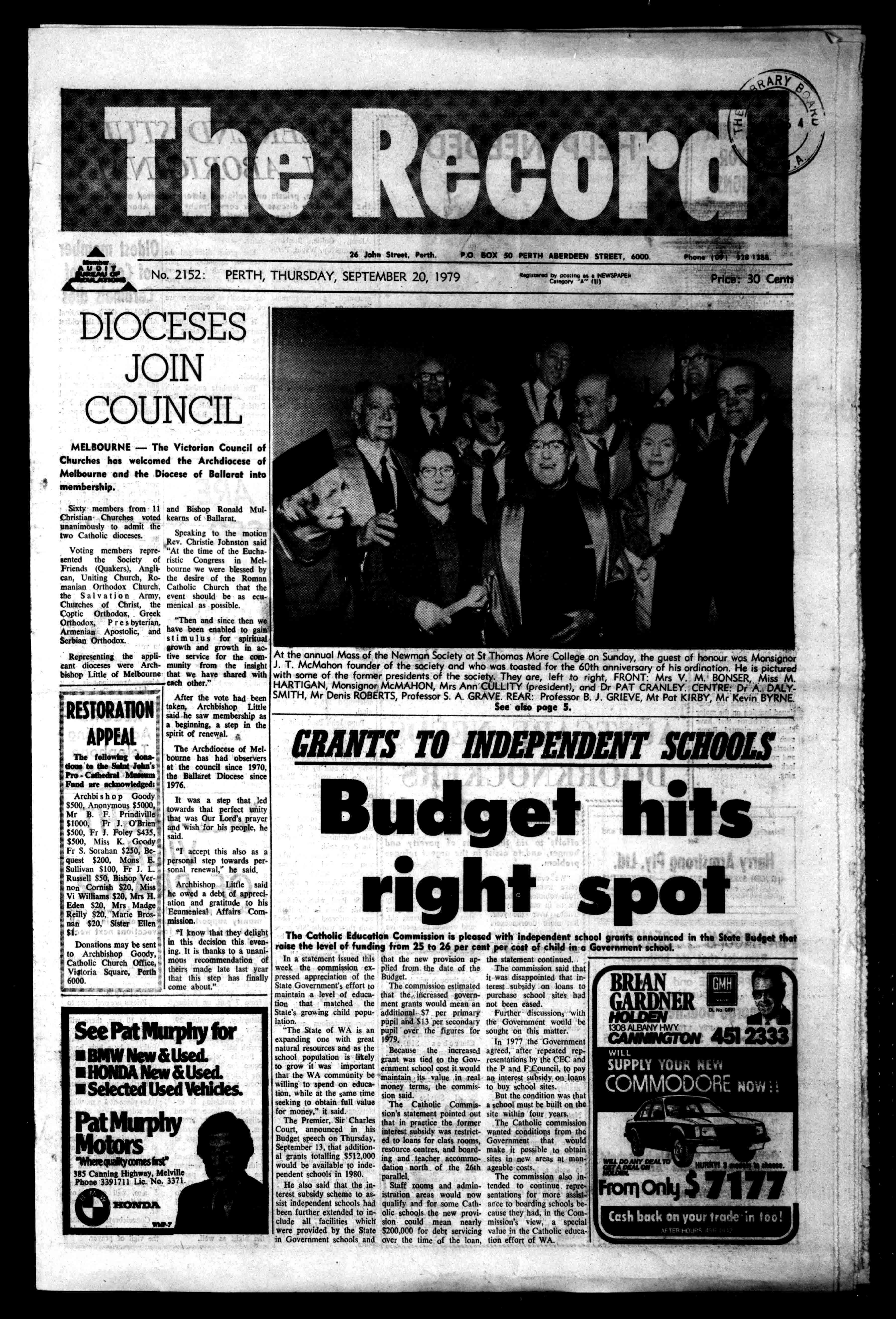 societyandwhowastoastedforthe60thanniversaryofhisordination.Heispictured withsomeoftheformerpresidentsofthesociety.Theyare,lefttoright,FRONT:MrsV.M.BONSER,MissM. HARTIGAN,MonsignorMcMAHON,MrsAnnCULLITY(president),andDrPATCRANLEY.CENTRE:DrA.DALYSMITH,MrDenisROBERTS,ProfessorS.A.GRAVE.REAR:ProfessorB.J.GRIEVE,MtPotKIRBY,MrKevinBYRNE. Seealsopage5. GRANTSTOINDEPENDENTSCHOOLS udget-hits right.sof.'; TheCatholicEducationCommissionispleasedwithindependentschoolgrantsannouncedintheStateWesttie. raisetheleveloffundingfrom25to26percentpercostofchildinaGovernmentschool. Inastatementissuedthis weekthecommissionexpressedappreciationofthe StateGovernment'seffortto maintainalevelofeducationthatmatchedthe State'sgrowingchildpopulation. "TheStateofWAisan expandingonewithgreat naturalresourcesandasthe schoolpopulationislikely togrowitwasimportant thattheWAcommunitybe willingtospendoneducation,whileatthesametime seekingtoobtainfullvalue formoney,"itsaid. ThePremier,SirCharles Court,announcedinhis BudgetspeechonThursday, September13,thatadditionalgrantstotalling$512,000 wouldbeavailabletoindependentschoolsin1980. Healsosaidthattheinterestsubsidyschemetoassistindependentschoolshad beenfurtherextendedtoincludeallfacilitieswhich
