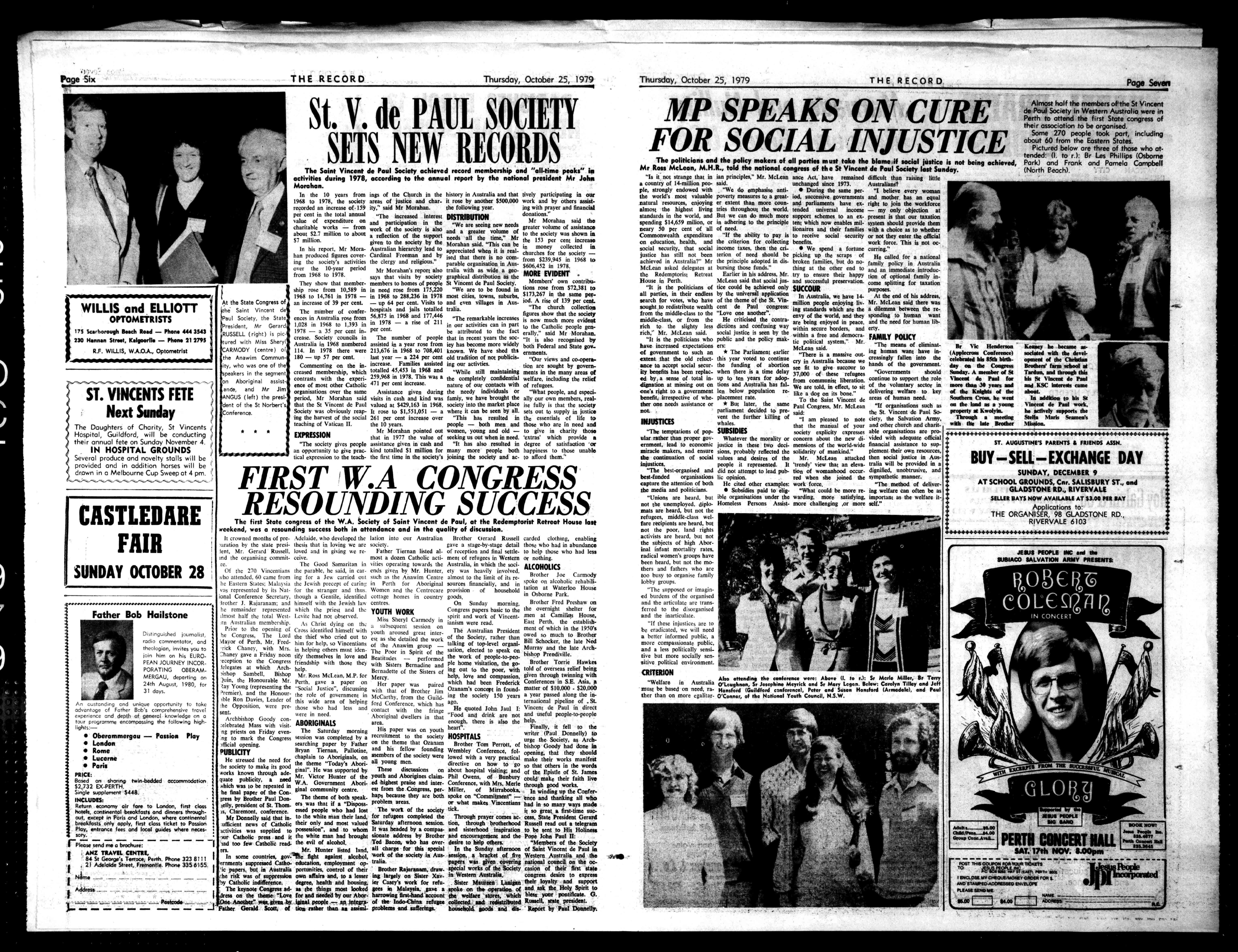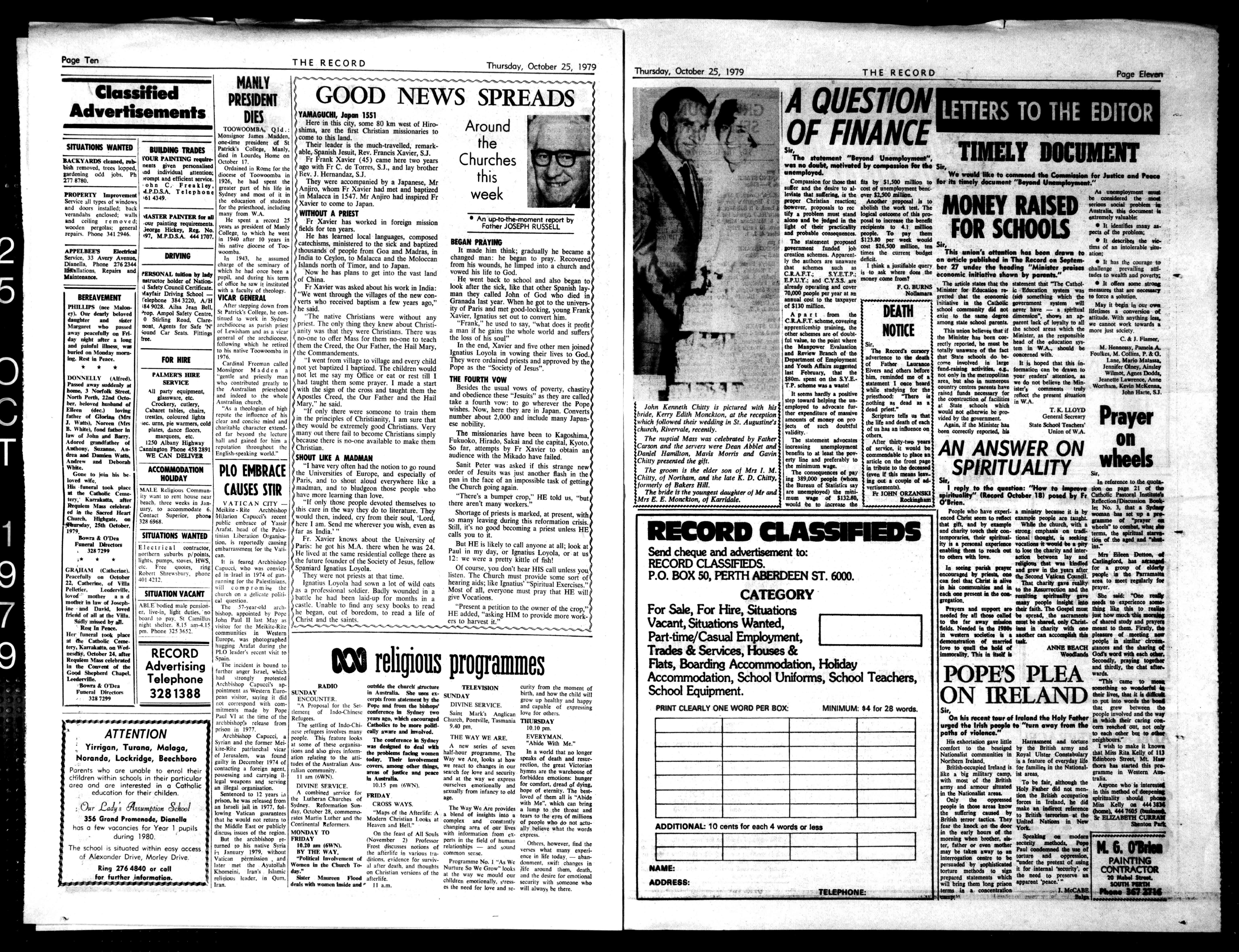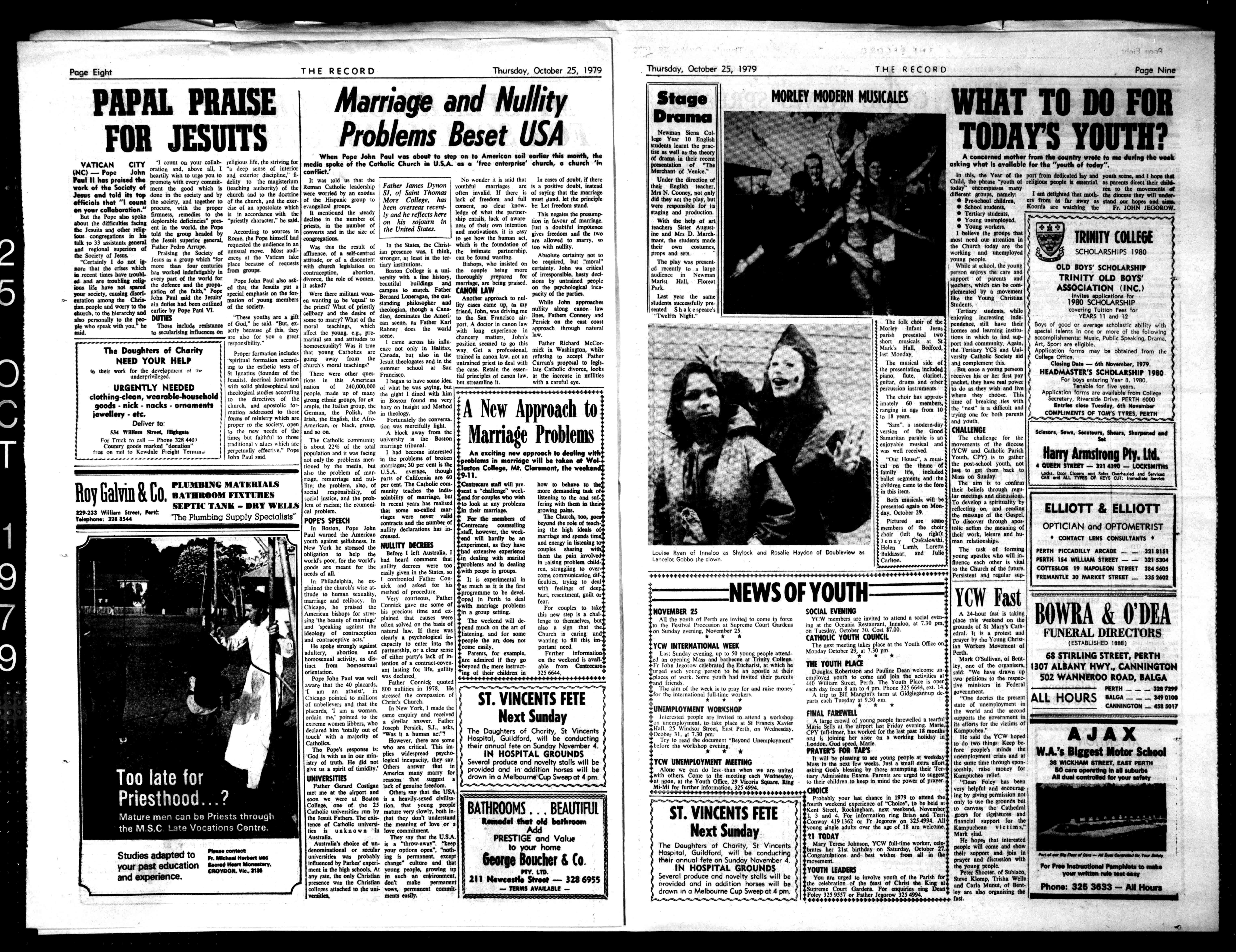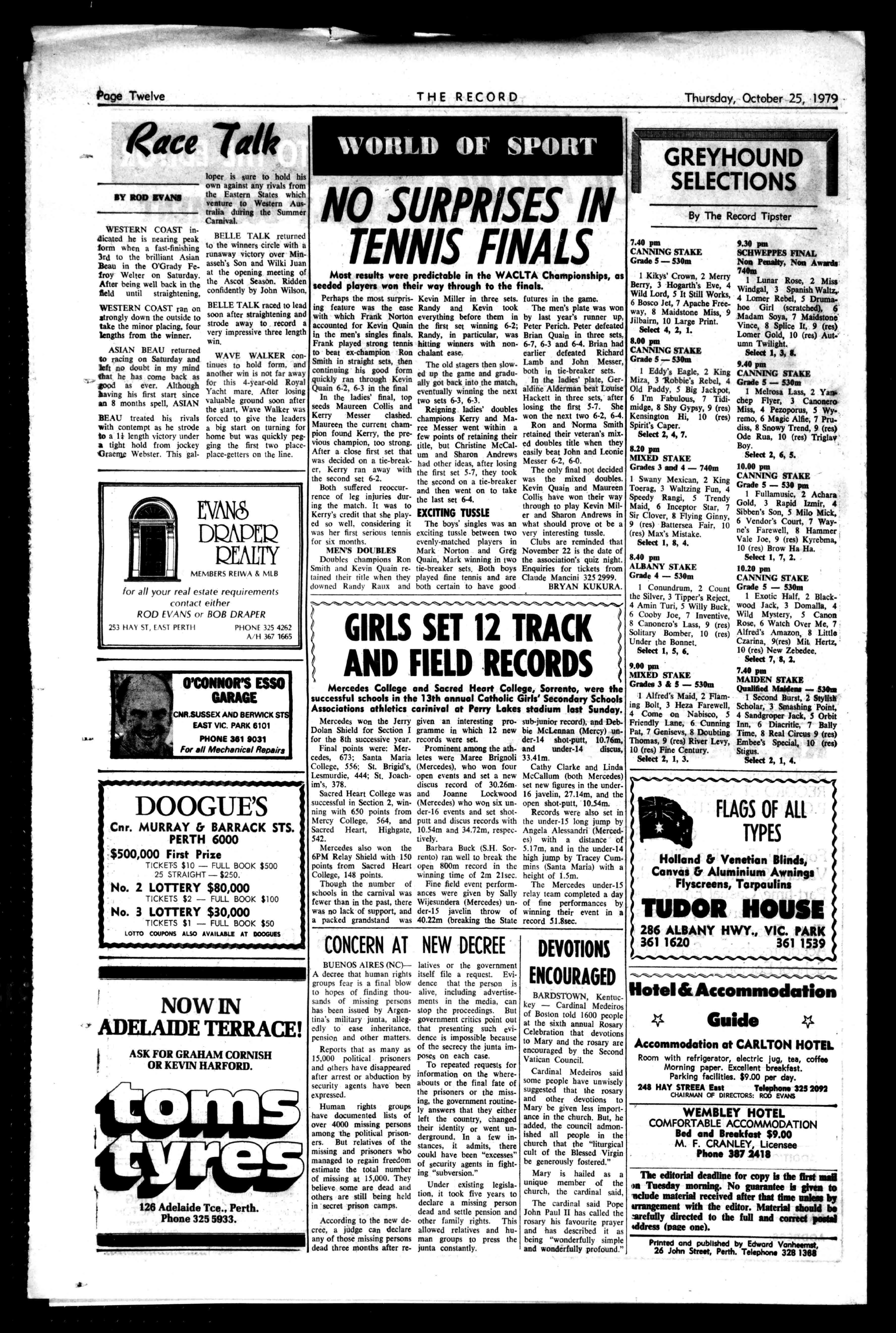 $5,StVinand BvelynDevoe f25, centdePaul°omens$50. LVanderZanderf F.M.maththath$50,ma. Mrs.B.A.Fitzgerald120,andMrs.IL NonisS25. GillianCamilleri$30,Fr. T.J.Prendiville1100, G.Maas$25,MissG. MoveFoleysa,msemrmWright110,H.Mille$20. Sullivan$17.Mrs.M.Cal-P.A.and1.B.Wallace !ashen$10.D.A.Lemmoa$100,P.LHevron$20, Kenniwell B.Parka$5,Mre, Fr cithamaa,$pa.p,Gibson.$10,Mas.K.Regan Ghisalbeni$10.Concrete120. ServiceCo.$50,G.P.Recd Fourteenanonymousarea$20.Mr.andMrs.nations$935. DANNELL&GOLLOP' OPTOMETRISTSandOPTICIANS CornealUrnConsultants lePLAZAARCADE,PERTH 3210344 CAROUSELSHOPPINGTOWN ASS41111 NORTHERNDISTRICTSMEDICALCENTRE TUARTHILL 3442079 DEMPSTERHOUSE,PORTHEDLAND 731929 39DURLACHERSTREET,GERALDTON 313445 MeadsofVictoriaPark FUNERALDIRECTORS Est1910 AFamilySeri/Ica WithExperiencedStott AndDignifiedAttention AIMTimes CoJM AMIHour.*AllSuburbs 190AlbanyHighway VICTORIAPARK opp.CargillStSchool Phone36161913613487 LOCUSTS&WILDHONEY WINTER'SCOMINGHOME SPIRITALIVE CALMISTHENIGHT LISTEN WHEREVERYOUGO GOUPTOTHEMOUNTAIN PELLEGRINI&CO. SINCE1890 820HAYSTREET.PERTH TELEPHONE:'3216655 * Thursday,October25,1979 THERECORD PageFive PARISHESENROL12 NEWALTARSERVERS QueensParkandBentleyparishesheldajointenrolmentceremony faroltoeserverintheGaildofSaintStephenrecently, FatherPeterO'Reilly,ofliturgicalyear. Furtherinformationon QueensPertsmissedby HeisalsoinstruaedintheguildofSIStephenin Fathertame.Pary,ofactingas masteroftermmailablefromJohnNagle, Bentley,andFatherSmith,moniesinchurchfunctions.phone4582026. oQueensPark.enrolled12 amensk®QueenPerk perishandfourfromlima kyparish. TekingPenintheceremonywere80otherserves. aswellas10acolytesfrom bothparishes. FortheQUM],Part group,itwasthefourthenrolmentsincetheguildwas Marledlotheparlds 1972. Underthedirectionof melyteloboNagle,there lavebeen30serversenrolledwiththemedalof94 Stephen,and24ofthanare Willontheactivelist, TheBentleygroup,trainedbyacolyteDoneWillem,werethesecondenrolmentsincetheguildso. teemed41976, Diningtheceremony,