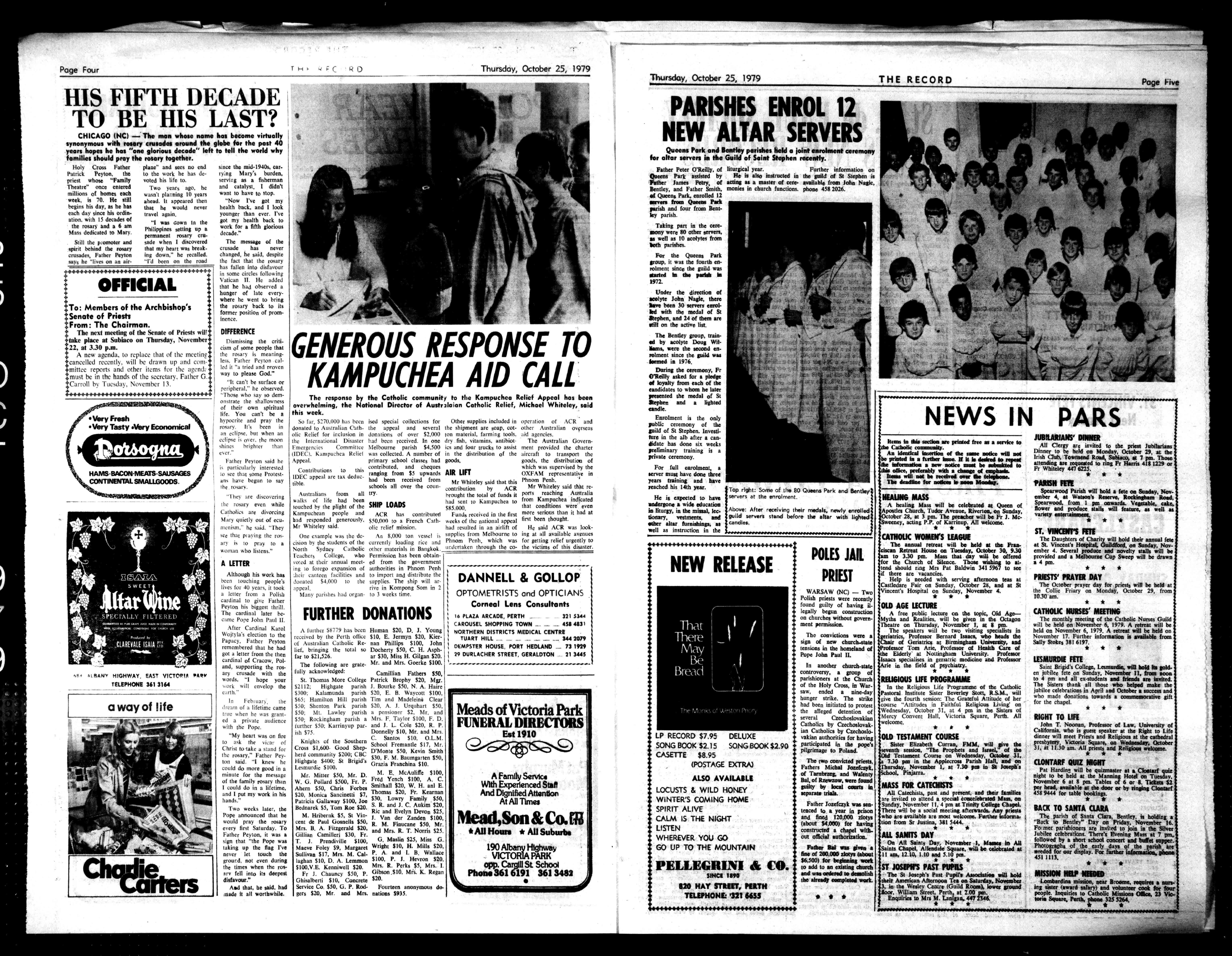 seethatpayingtherosaryistomaytoa womanwbolistens." ALETTER Althoughhisworkhas beentouchingpeople's livesfor40year,ittook alaterfromaPolish cardinaltogiveFather Peytonhisbiggest ThecardinallaterbecamePopeJohnPaulto, AfterCardinalKarol Wojtyla'selectiontothe Papacy.FatherPeyton rememberedthathehad gotaletterfromthethen cardinalofCracow.Poland,supponingtherot. pear ruade ththe rd,'1hopsyour workwillenvelopthe osh" In Febloars, the dreamoflifetimecame truewhenhewasgrant. edaprivateaudience withthePope. "Myheartwasonlire toaskthevicarof Christorateastandfor therosary,"FatherPeytonmid,"Iknewhe coulddomoregoodina minuteforthemessage ofNefamilyrosarythan coulddoinalifetime, andputmymoltinhis hands." Twoweekstear,the Popeannouncedthathe wouldpraytherosary everyfirstSaturday.To FatherPry.. wm signthat"thePopewas WanguptheflagI've neverlettouchthe gourd,notevenduring thetimeswhentheeon'are fellintoitsdeepest disfavour." Acedthat,besaid,had madeitallworthwhile. W Thursday,October25,1979 GENEROUSRESPONSETO KAMPUCHEAAIDCALL TheresponsebytheCatholiccommunitytotheKampucheaReliefAppealhasbeen overwhelming,theNationalDirectorofA WonCatholicRelief,MichaelWhiteley,said thisweek. Sofa,$270,000hasbeenisedspecialcollectionsfor OthersuppliesincludedinoperationatACRand donatedtoAustralianCath-theappealandseveraltheshipmentaresoap,cot.otherAustralianoverseas olioReliefforinclusionindonationsofover$2,000tomaterial,farmingtools,aidagencies. theInternationalDisasterhadIanreceived.Inonedryfish,vitamins,Rah., TheAustralianOmer Emergencies Committeealelbourneparish$4,500is`andfourtruckstoassistmeetprovidedthecharter fIDEC).KampucheaRelic]wascollected.Anumberofinthedistributionoftheaircrafttotransportthe Appeal primaryschoolclasseshadgoods,