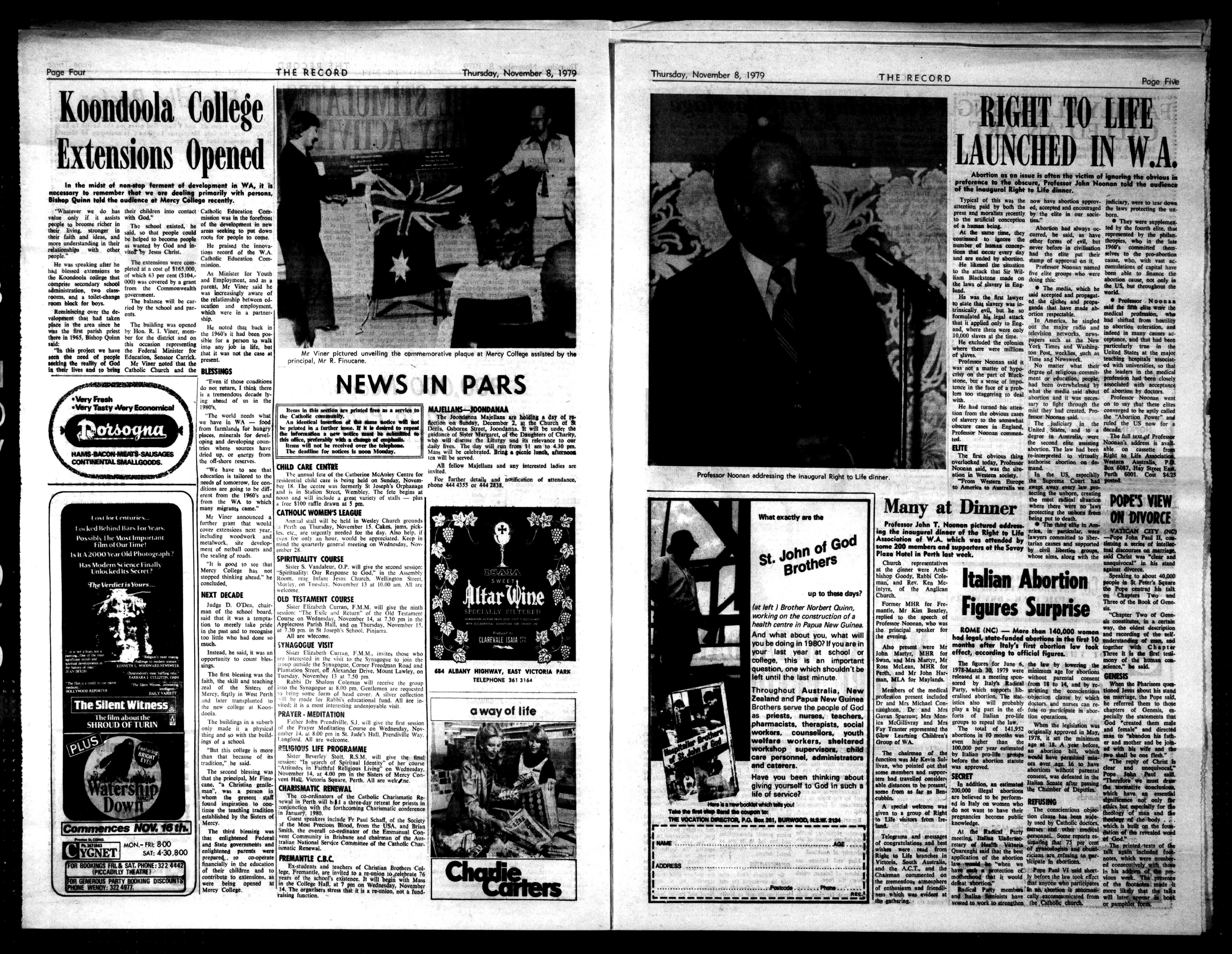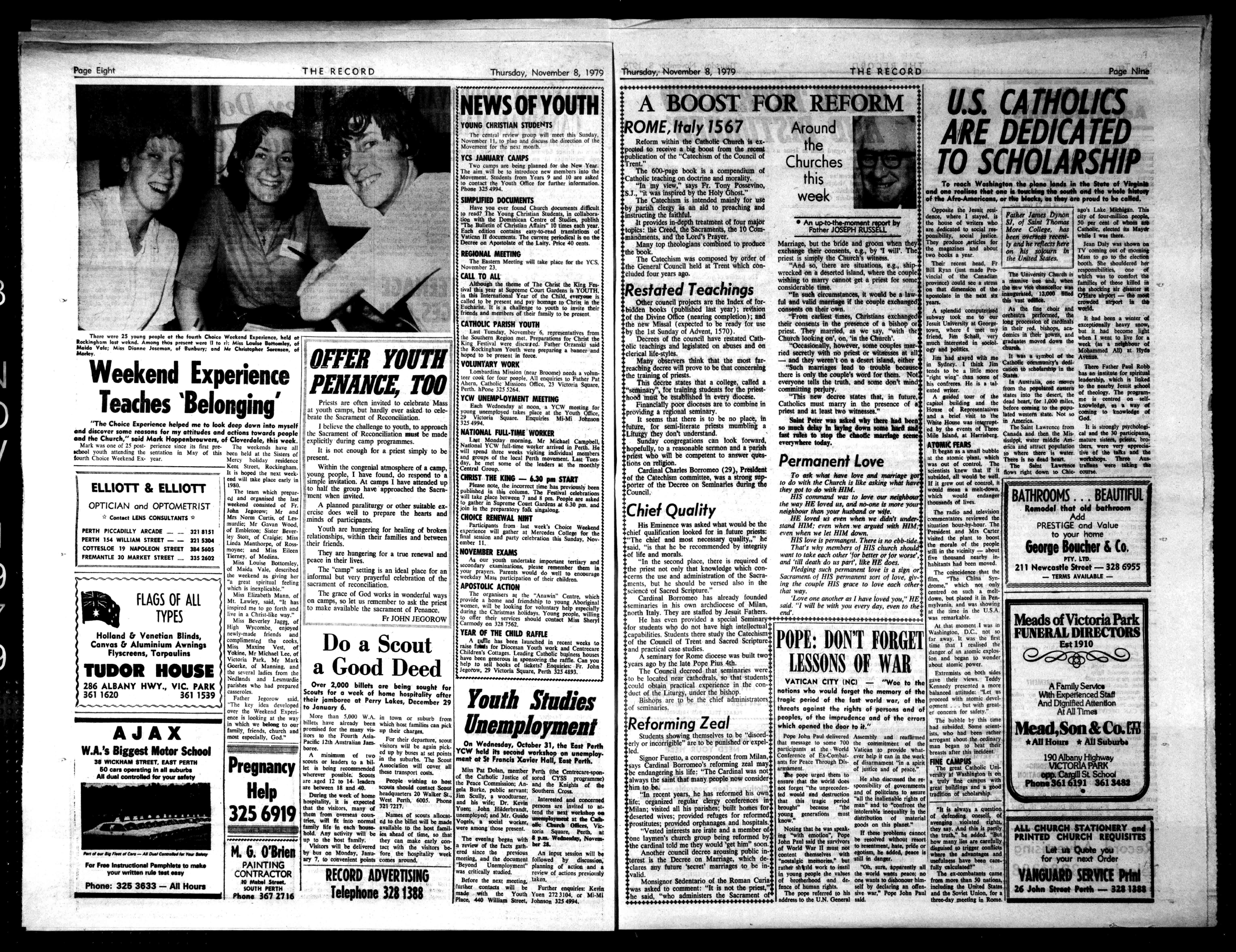 sessionwasgivenbyFather Pat Cunningham, who gavethegroupsometheorticalandpracticaladvice nntherolethattheyplay liturgy,BarbaraHarris Archdiocesan Calendar November Confirmation,Mirrabooka,Archbishop Goody. 4pm.MassforcatechistsinTrinityCollege chapel.BishopQuinn. InductionofFatherKenKeatingasparish priestofMcrredin.BishopHealy. 16 7pmMassforBentleyparish25thanniversarycelebration.ArchbishopGoody. 18 CastledareJubileeGardenParty.Bishop (hind 22 TheSenateofPriestsmeetsatSubiaE. 23 AtHametsleysilverjubileecelebrationsfor FatherBarryWhiteleyandSisterLeone O'Brien,ArchbishopGoody. 74 GoldenjubileeMassforSisterFlorenceal LoretoClaremont.BishopQuinn. 25 10.30amatBaleen+.MassforSaid FrancisXavierCabrini.BishopQuinn. 3 pm.Confirmation,NyoongahMaw Centre,EmbletoaBishopQuinn. OFFICIAL FROM:THEARCHBISHOP TheParishofThomlieisvacantduetothe deathofFatherLauren.Rivers. Priestsinterestedinapplyingforthepastoralcareofthisparishshoulddosoinwriting totheArchbishopnotlaterthanMonday,November19. Bunbury Calendar rrlITY,V11.71'.`,":2 WordofGodintheJewish ...Pesemi., Thesecondsmsiondealt withthepracticalitiesof preparingforMass.looking overthereadings,praying andshoeingideasabout theirshmikancetothe day'scelebration,andthe relationshipofthereaders totheotherpeopletaking pan. Thefinalsessioncovered voiceprojection.theuse covered themicrophone,eyecomact withthecommunion,penTheSociety((VA VincentdePaul HelpUsToHelpOthers BY Donating CLOTHING,RAGS,FURNITUREORANYITEMS NEEDEDBYTEESOCIETY INCARRYINGOlfTRSCHARITABLE WORKS COUNTRYCLEWS RedFineTeSubrico Youronestoptravelcentre *AirTickets(AllAirtines1 Tours/Cruises IndividualTravel BusinessTravel HotelReservations CarRentals PackageTours& ClubMediterrenee CardmemberServims TravelInsurance TravellersCheques (contactFredSinclair orTerriMaine) P.MShippingCentre Y.H.A.YouthHostels Association *MatureYearsTravel (contactAnneMarieloll MauritianTravelCentre FreedomHoliday SeychellesTravelCentre (contactFredSind.. Rehtma'Zs17:"*".AL,ZT4a:11"rat inertMaine! TRAVEL SavingsHouse,12VmtoreAvon.Perth.W.A.6000.Pho 4 3256822 Thursday,November8,1979 THERECORD PageThree JOHNPAULSTIMULATES MISSIONARYACTIVITY ROME(NC)-WiththerepeatedencouragementofPopeJohnPaulII,missionaryactivity hascontinuedtogrow,accordingtoareportbythInternationalFidesService. In messages givenincommon.Searchesofre.edforrefugeeaid. 400thyearoftheArchdiothroughouttheyear,theligiousresidencesalsotake ChinesshowingsignsofoneofManilain1979.with Popeaskedthechurchtoplace. liberalisingitsattitudeto.effortstowardmelesiaslical respondtoitsmissionary BishopsinMocambiqueWardreligion.givingtherenewalandanInteragion. gutty!andemphuisedthecoocondemnedIkenc,,PopereasontohopeforalMissionCongressplan. onaryaspectofpriestlyoft,oudthothtothe furtherpmitisedevelop-nodforDecember. andreligiousvocation,said inthethareas,menutowardreligiousfreeFides. and 00 Chris domforCatholicsinChina.Fidesreportedthatatt Fides,newsserviceofthecommunitiestogivewitnessPROTESTS