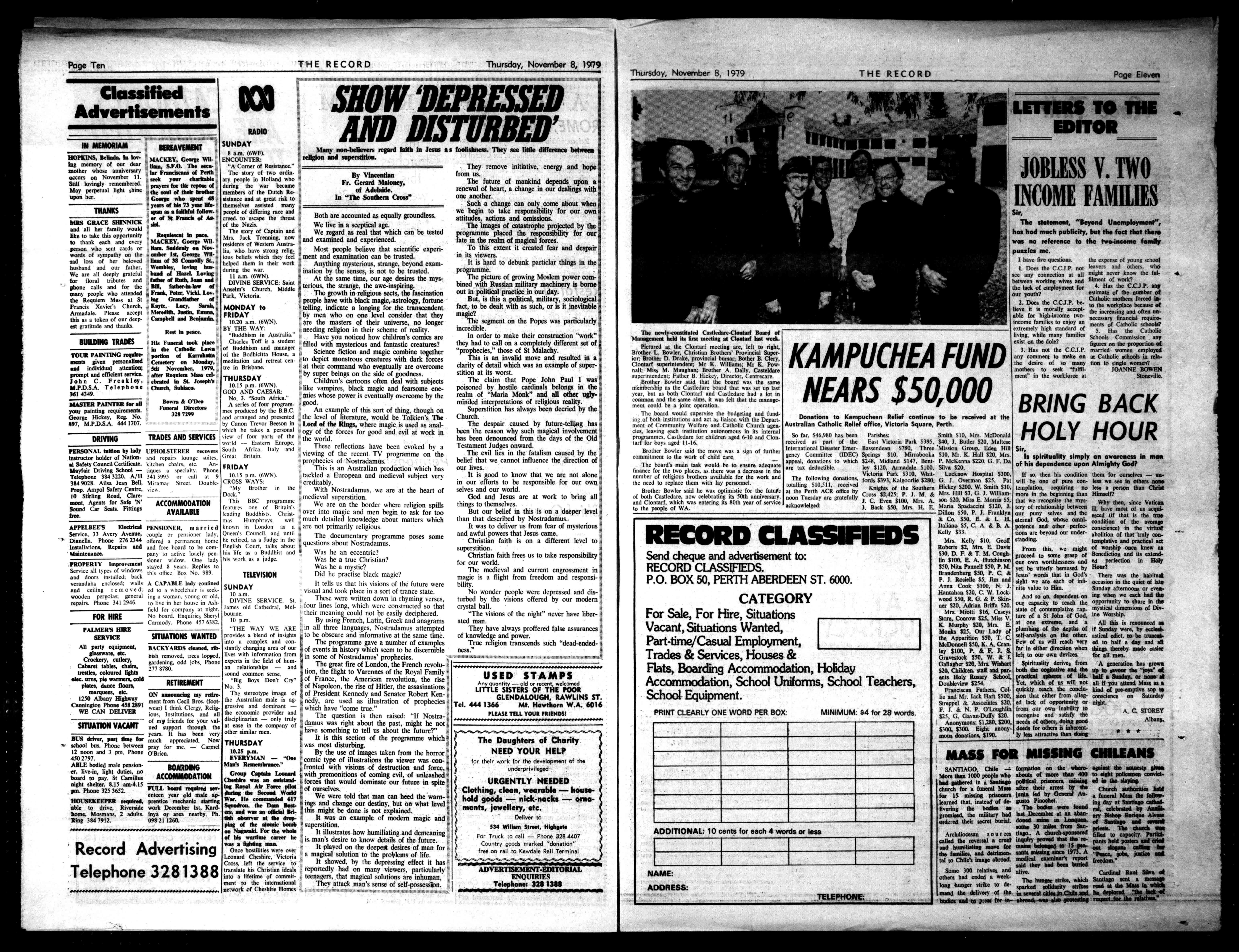 8,1979 THERECORD PageEleven Thenewly-conatitutedCastledare-ClooterfBoardof 'ManagementheldIts0nmeetingetClot:tadMtweek. PicturedattheClontarfmeetingare,lefttoright, BrotherL.Bowler.ChristianBrothers'ProvincialSuperior;BrotherD.Drake,ProvincialbursaBotherB.Clerv, Clontarfsuperintendent;MrKWilliams:MrK.Pennell;MissM.Manahan;BrotherA.Daily,Casteldare superintendent;FatherB.Hickey,Director,Cent BrotherBowlersaidthattheboardwasthesame mentbershipastheCastledareboardthatwassetuplast year,butasbathClontarfandCastledatehadlotin commonandthesameaims.itwasfeltthattherothaMmeetcouldbeIdiotoperation. TheboardwouldsupervisethebudgetingandfundingofbothinstitutionsandactasliaisonwiththeDepart. mentofCommunityWelfareandCatholicChurchage. cies,leavingeachinstitutionautonomousinitsinternal programmes,Casdedareforchildrenaged6-10andClonedforboysaged11-16. owler said the was sign fuller cBTMaherritBrt board'smaintaskwouldbetoensureadequ-ate financeforthetwoplace,astherewasdecrease the numberofreligiousbrothersavailablefortheworkand theneedtoreplacethemwithlaypersonnel. BrotherBowlersaidbewasoptimisticforthefun* ofbothCastledare,nowcelebratingits50thanniversary, andClontarf,whichwasenteringits80thyearofservice tothepeopleofWA. LETTERSTOTHE EDITOR JOBLESSV.TWO INCOMEFAMILIES Sir, Thestatement,"BeyondUnemployment", hashodmuchpublicity,butthefocithatthere wasnoreferencetotheIwo-incomefamily puzzlesme. havefivequestions thecapcnseofyoung.clonal DoestheCCI?.not'twat)and seeanyconnectionatallrfiLit,noeiverwok,I,0e5 other'9 falbe'"" working 'rud a.HasMec.c.)P.., thelathofetthk0ruq't esjimamofthenumberof ouryouth? KAMPUCHEAFUND NEARS$50,000 DonationstoKampucheanReliefcontinuetobereceivedatthe AustralianCatholicReliefoffice,VictoriaSquare,Perth. Sofar,$46,980hasbeen Parishes: Smith$10,Mn.McDonald receivedaspartofthe EastVictoriaPark5395,540,CButler120,Malthso InternationalDisasterEnter-Bassendean$780,Three'MissionGroup,EdonHill gencyCommitteefIDEC)Springs$10,Mirrabooka110,Mr.K.Hall$20,Mrs. appeal,donationstowhich1248,Midland$147,Bent-P.McKenna5220,G.F.Da aretaxdeductible. ley$120,Armadale5100,Silva$20. VictoriaPark$310,Whit-WetnessHospital5300, Thefellowiutreviverondo$391,Kalgoorlie5280.G.1.Overman$25,Pat "B'511' KnightsoftheSouthernHickey1200,W.Smith510, atthePerthACRofficeruetbyedCross$2,425;P.1.M,aMrs.HillSI,G. oohTundayaregratefullyMrs. nn12.0,MissE.Morris55, acknowlelge& 1.Bank530,Mrs.H.E,MarieSpadaccini$120,1. Dillon$50.P.1.Franklyn ltCa.150,E.&1.H. holism)$5,C.A.&B.A. Kelly133. RECORDCLASSIPIIISDS Sendchequeandadvertisementto: RECORDCLASSIFIEDS. P.O.BOX50,PERTHABERDEENST.6000. CATEGORY ForSale,ForHire,Situations Vacant,SituationsWanted, Part-time/CasualEmployment, Trades&Services,Houses& Flats,BoardingAccommodation,Holiday Accommodation,SchoolUniforms,SchoolTeachers, SchoolEquipment. PRINTCLEARLYONEWORDPERBOX. MINIMUM$4for28words. ADDITIONAL:10centsforeach4wordsorless NAME ADDRESS: ,TELEPHONE: Mn,,Kelly$10,Geoff Roberrs$2,Mrs.E.Davis 130,D.F.&T.M.CoughlinMKKA.Hutchinson 550,NibPannell150,P.M. Brandenburg$50,P.C.& P.1.Rosielle15,Jimroad AnnaCook1100,N.1. Hantahan120,C.W.Look. woad$50,R.G.&P. nerSkin$20,AdrianBriffaMO. Mrs.Mind$16,Camp Store,Capron125,MissV. E.Murphy520,Mrs.S. Rooks125,OarLadyof theApparitionSM,T.C. McDonnell$50,K.A.Cranley1100.P.&P.J.S. Gravntock$50,W.& GallagherURMrs.Wilbert $20,Children,stallandmatsHolyRosarySchooL Doubleview5254. Francisca.Fathers.CollieandMr.lackTian5500, Streppel&Associatn520, F.I.&N.P.O'Loughlin $25,G.Galan-Duffy120. Anonymous,S1,200,1200, 1100,1300.Eightanonymomdonation,$190. Catholicmothersforcedim 2.DoestheC.CJ.P.be- beauxNeve itifmoralifsmelt-meincraeeib the ngndoften ableforhigh-incomeovo56.5asmewsorCatholicschools? extremelyhighstandardof Sts HastheCaihnlic living,whiltmanyfamiliesgehee. CASIonthedole? frfornontheproportionof 3.HasnottheC.C.J.P.marriedwomenemployed anycommenttomakeonatCatholicschoolsinrelo thedesireasomanytiontosinglewomen? motherstoseek1.111.1. JOANNEBOWEN menftinthe at Stoneville. BRINGBACK HOLYHOUR Sills spiritualitysimplyanawarenessinman ofhisdependenceuponAlmightyGod? Ifso.thenhisconditionthemforourselveswillbeoneofpurecon-Insweseeinothersnow personthanCfitie moreinMebeginningthanHimselIT hatwecognisethe01' Whydiet,neeVanua ary of relationship bOneen G, hove mw of argbpunGad, eastconduit fthe potenceandotherPerfectmanacience)inthevirtue? tiot.nsdinar.e.beyondourunder-abolitionofthatlrulycontemplativeandpracticalso man aomightofworshiponce.knewas mocoo Benedicno.anditsextend. 010ownworthlessnessand.dPerfectionin Holy lreweeloo low amswads wweordarseh'eac1h infi! nroittebevalue't'odY1-1im70"'G'''''7 Su ne'Sund:yafte me rnoon,orevenAndro the JohnorGad, :tfpas.irrnyir7seoor:e. the ofran.mysticaldimensionsofDivtuteeofa pltnhwg thedepth.of Fewofuswillread)veryedtohalfadayandal farineitherdirectionwhenMienstherebymadeeasierleft toourowndevices. forallmenSpiritualityderivesfromAgenerationhasgrows boththecogitativeandtheuptomoorthe"ieM"et practiselgamesofEde-halfatharday.enmata obt kal,1if,youp....attend,,Myesseopas.a stoniaTkhatoefithoe....yr fromallecwg, ongammas. fromourow.inablityto A,C.STOREY rea:x,oloa.andr,,tbsati[..sty...the llundying bdeeds,foat.olach,eivre. MASSFORMISSINGCHILEANS SANTIAGO,Chile--formationontheMem.maimdmamnestygines Morethan1000peoplewhoeh**ofmorethan400toeightpolicemen1001001MgliWI...01inseen,.politicalprisoners,mimingedintheslayingchurchforafuneralMmaftertheirarrestbythe Chad,,,,,, learnedthat,insteadofAl'gustoPinothe. 810000thebodiesmThebodieswerefound ,,,,,,,, promiani.themilitaryhadlastDecmahmeaothan- Bishop IeAlvanordcred theirsecretburial.dolledMaeisLeagues.ofs7,-;,,-,i meJOmikefromSan-.ky,,,,,d,HO .Anchiliocesan soucestitian..Achatch-simmorad toc,,,,,,,,,,,,,,, calledthereverseacruetintl.'s,Premedthethere-cm*haqdimm,sadway missing ISIe. toChile'simageabroad.medicalenteinee7reportfreedom" adhumiliationmovemoveformathsbekosedb...ail....r families,anddetrimen.motsssingsince1973.A..,...-77,,.ail..LM saidtheyhadbeenburied st