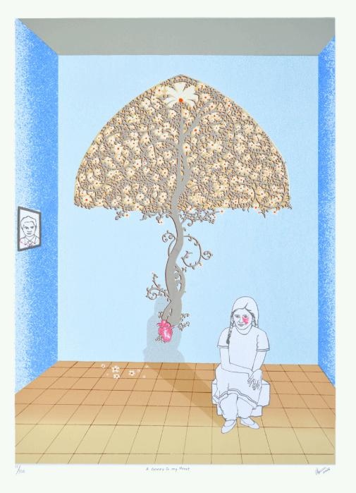 Jigna Gaudana’s A Corner in My Heart explores themes of memory, love, and nostalgia. The serigraph invites viewers into a personal and contemplative space, blending delicate visual storytelling with technical finesse