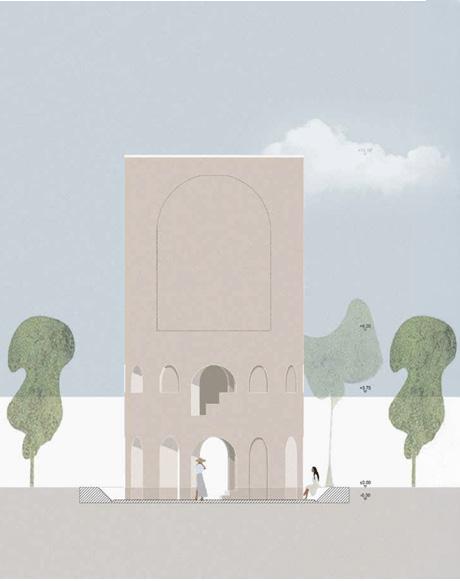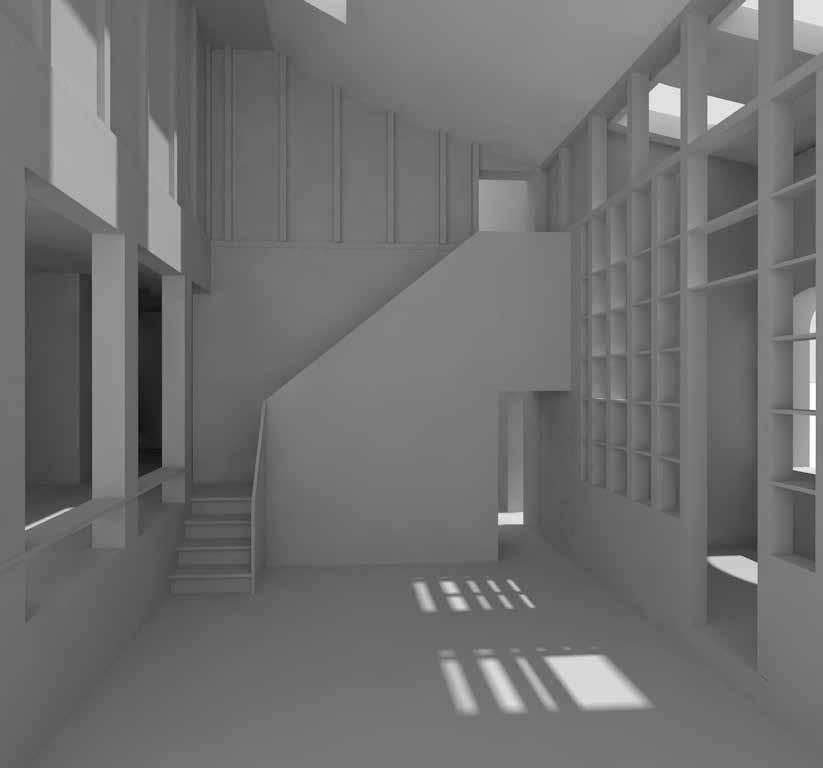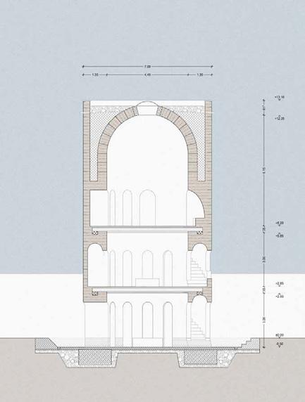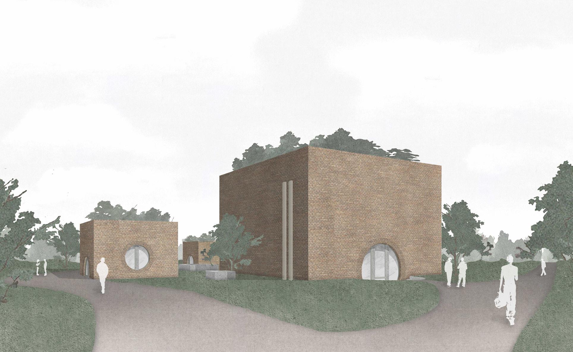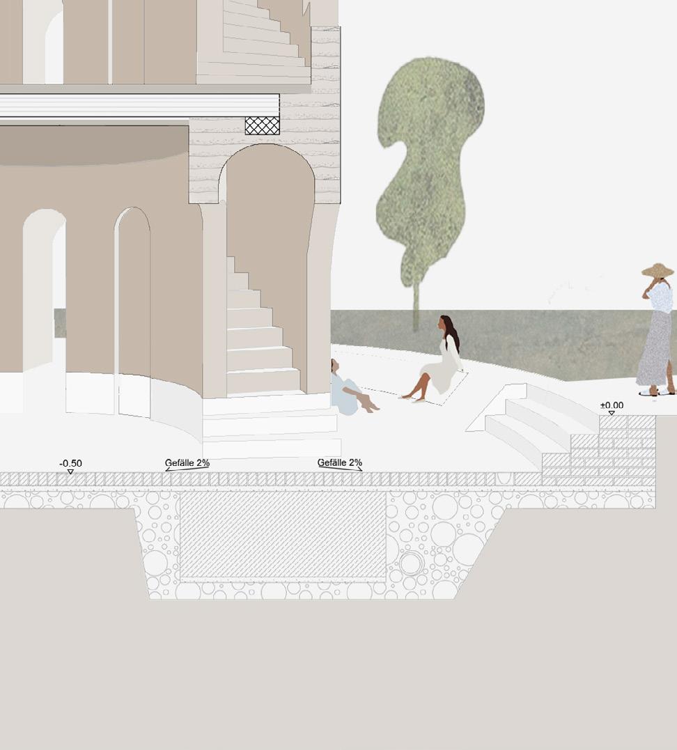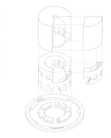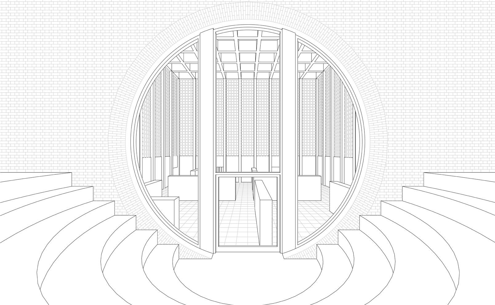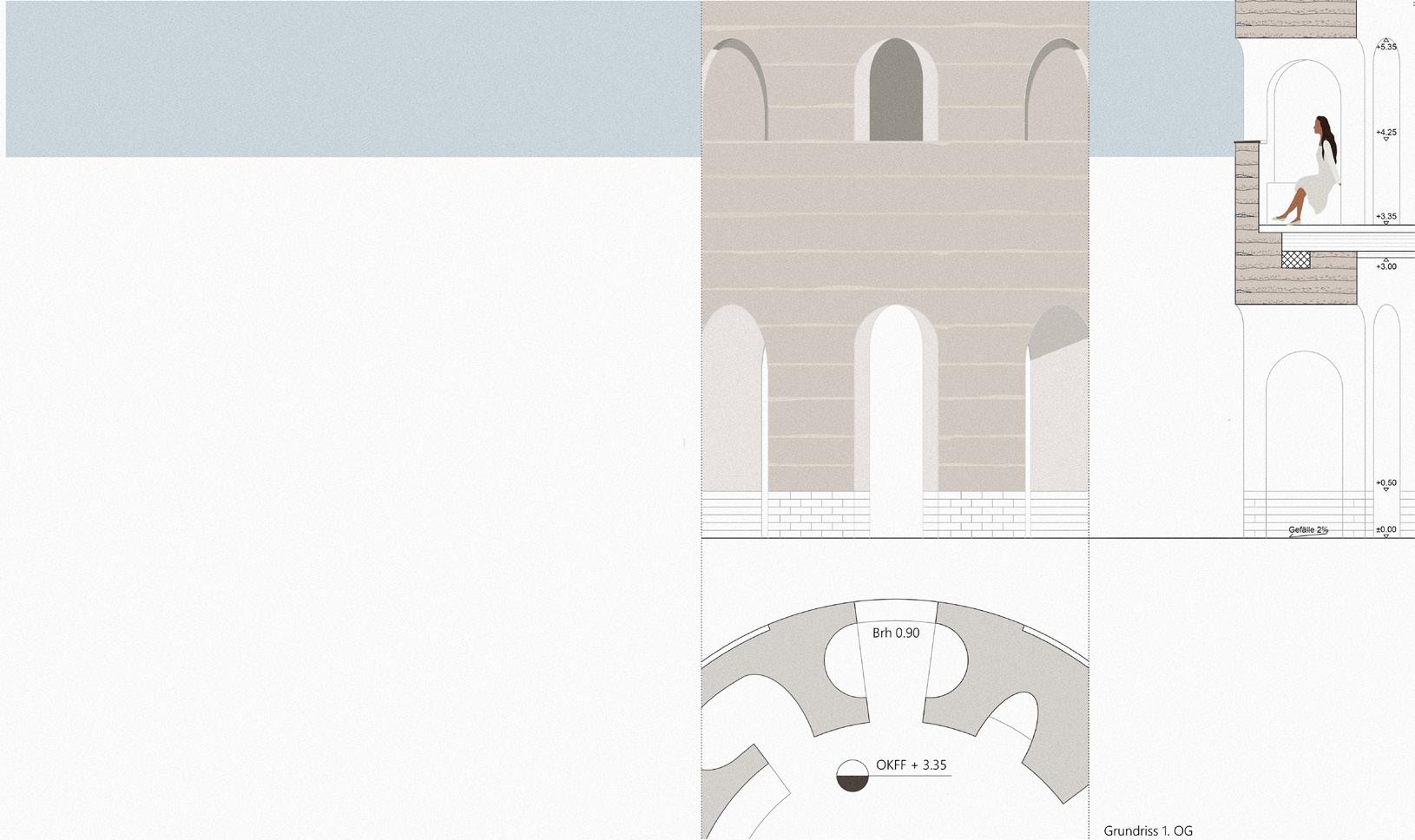 Der räumliche Aufbau des Turms folgt einer klaren Abfolge von Funktionen, die den Übergang vom Ankommen bis zur Ruhe erfahrbar macht. Drei Funktionseinheiten gliedern diesen Weg und verdichten ihn räumlich wie atmosphärisch. Der untere Bereich ist dem Ankommen und der Kommunikation gewidmet. Der Turm ist hier teilweise ins Erdreich eingebettet, wodurch ein gefasster, geschützter Raum entsteht, der das Eintreten verlangsamt und den Übergang vom offenen Park in das Bauwerk markiert. Der Weg durch einen engen, bewusst dunkel gehaltenen Durchgang steigert diese Erfahrung. Erst danach öffnet sich der Raum nach oben zu einem lichtdurchfluteten Kuppelraum, in dem sich Weite, Ruhe und Stille entfalten.