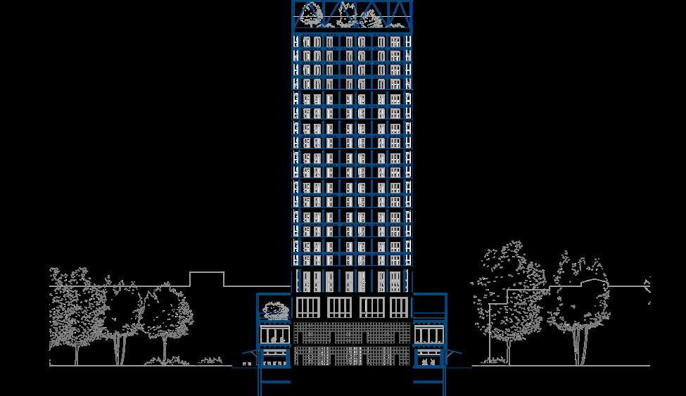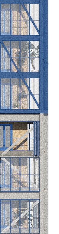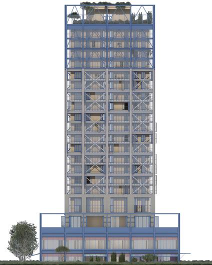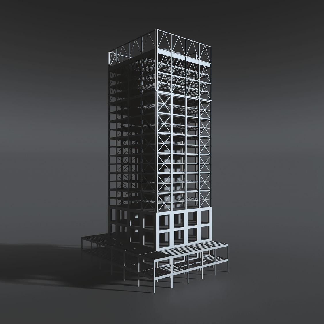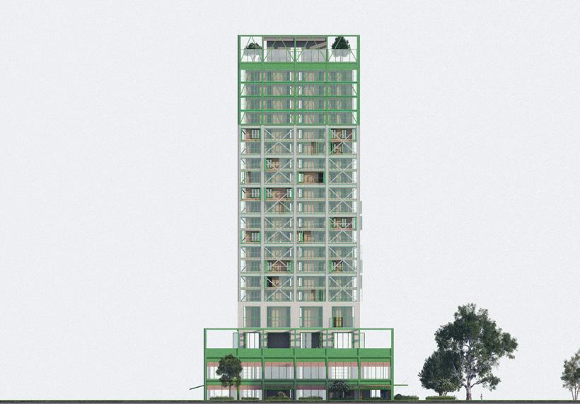 In den Regelgeschossen ergänzt eine zweite, leichte Holzrahmenhülle den Bestand und schafft geschützte Außenräume sowie einen thermischen Puffer zwischen innen und außen. Die Aufstockung in Stahlrahmenbauweise entfaltet den Turm vertikal weiter und eröffnet neue gemeinschaftliche Wohn- und Freiräume in Form eines Dachgartens. Entwurf und Tragwerkskonzept wurden gemeinsam entwickelt und verstehen Konstruktion nicht nur als technische Notwendigkeit, sondern als gestalterisches Mittel. Der gezielte Einsatz von Holz, Lehm und Stahl ermöglicht eine ressourcenschonende Weiterentwicklung des Bestands und zeigt, wie bestehende Strukturen räumlich, sozial und konstruktiv neu interpretiert werden können.