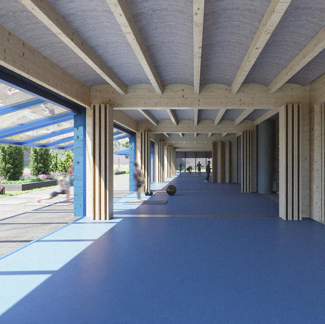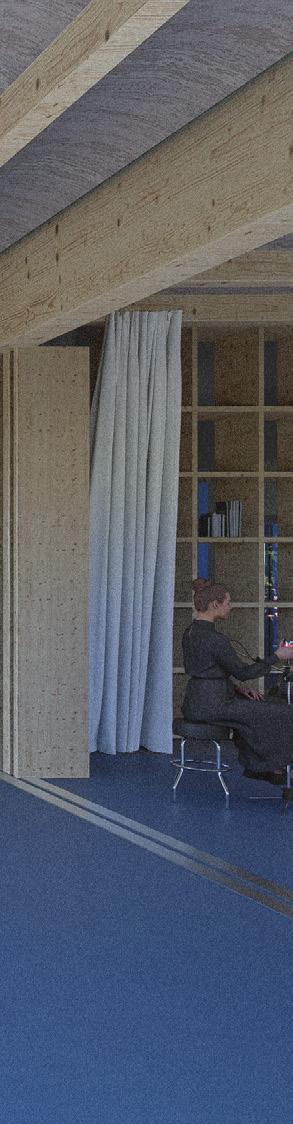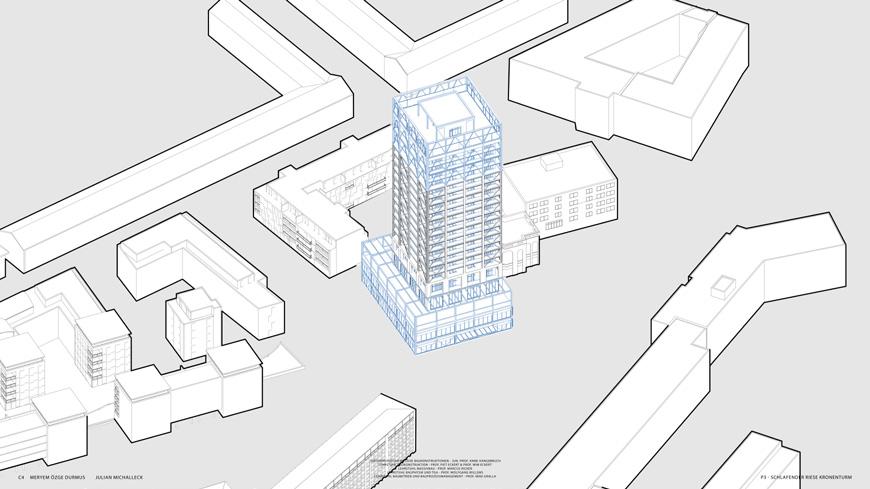 Der Kronenturm, ein ehemaliges Industriegebäude, wird als schlafender Riese verstanden, dessen vorhandene Struktur das Potenzial für eine nachhaltige und soziale Transformation in sich trägt. Der Entwurf verfolgt das Ziel, den Bestand weiterzuentwickeln, ohne seine Identität zu überformen, und kombiniert dafür drei räumlich-konstruktive Strategien: Erweitern, Einfügen und Entfalten. Ein neu gefügter Annex in Holzrahmenbauweise mit integrierten Stampflehmmodulen erweitert die unteren Geschosse und bildet mit dem sogenannten Balance Trakt einen Ort für Bewegung, Rückzug und gemeinschaftliche Aktivität.