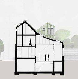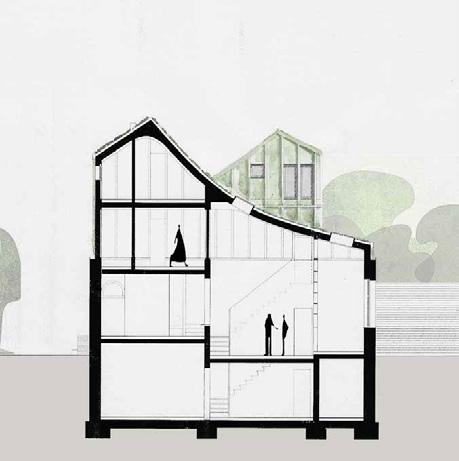 Besucher*innen erleben auf der Erschließungsachse eine sich verjüngende Enfilade, die zur Schwelle des Aufführungssaals führt. Eine Aufenthaltsachse bietet Raum für Begegnungen und Dialog. Die Trennung zwischen Besucher*innen und Künstler*innen wird durch einen gemeinsam erschlossenen Innenhof aufgehoben.