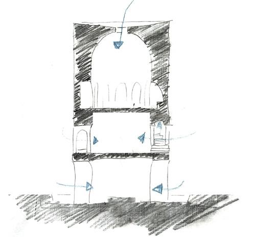 Die Konstruktion unterstützt diese räumliche Dramaturgie. Der Turm steht auf einem Backsteinsockel und wird bis in die oberen Geschosse aus Stampflehm errichtet. Im unteren Bereich kommt Ortstampflehm zum Einsatz, während im oberen Abschnitt Stampflehmfertigteile verwendet werden, um die Fügung und Ausbildung der Kuppel konstruktiv zu erleichtern. Zwischen Außen- und Innenschale ist die Lehmwand mit Stroh gefüllt, wodurch der Lastabtrag unterstützt und zugleich der materialgerechte Umgang mit dem Baustoff Lehm betont wird. Die Konstruktion bleibt dabei ablesbar und folgt keiner formalen Geste, sondern einer logischen Entwicklung aus Material und Funktion.